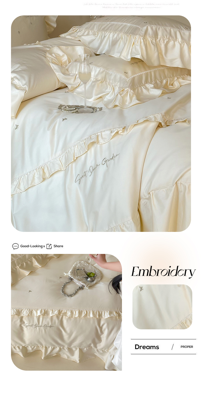 红番天家居馆 2025新款全棉纯棉贡缎长绒棉法式刺绣花边四件套-蝶梦 蝶梦-奶油芝芝