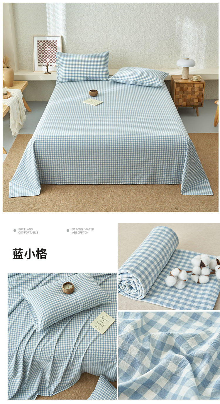 • 91家纺网 家纺一手货源 找家纺 早晨家纺 2025新款色织纯棉水洗棉床单 蓝小格