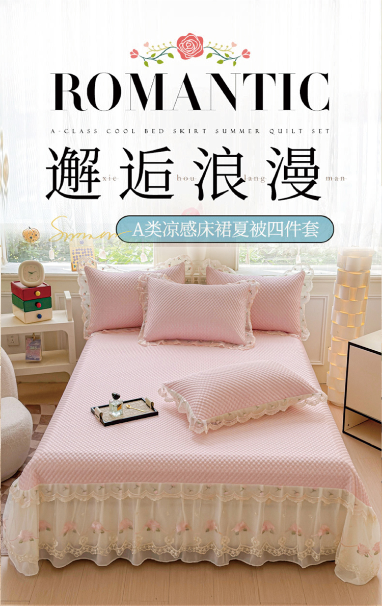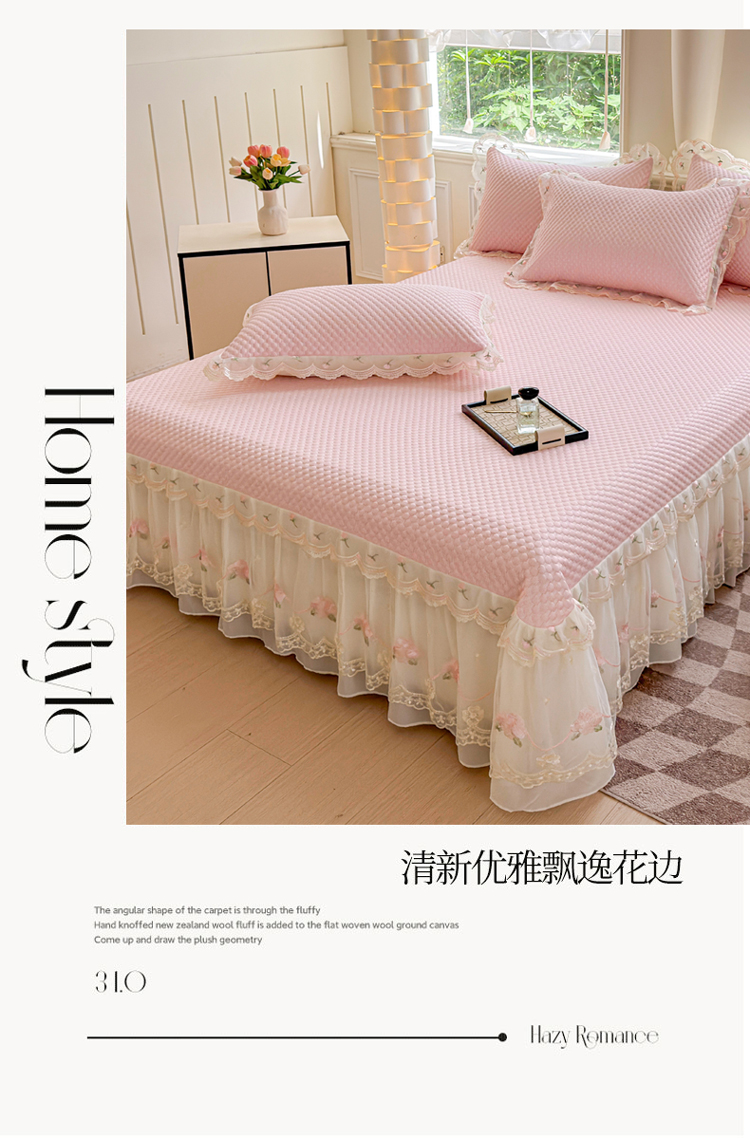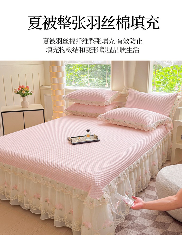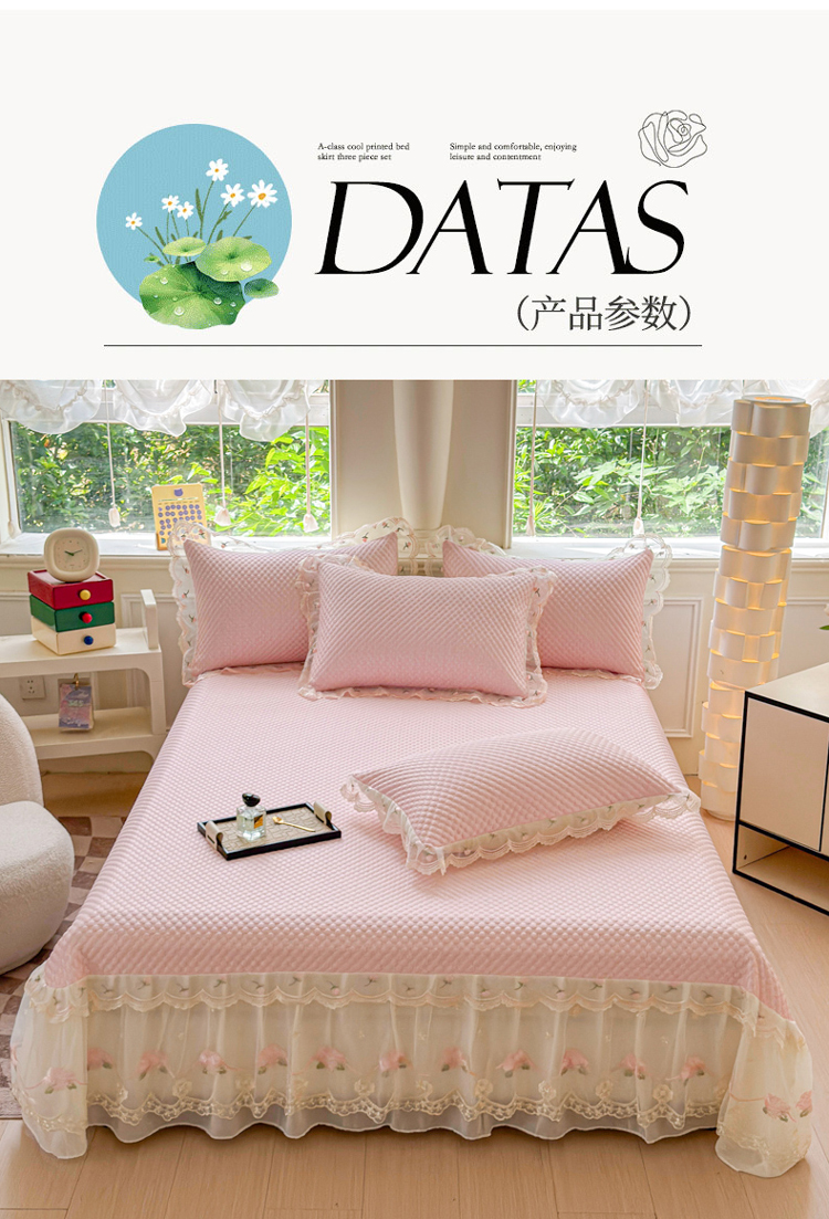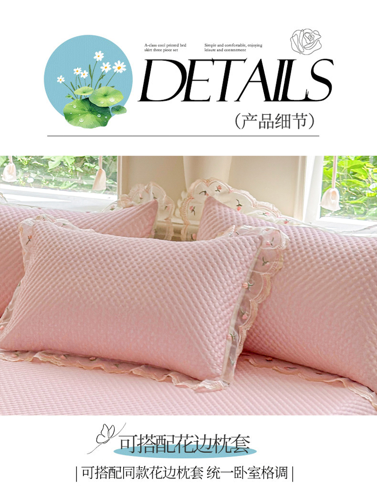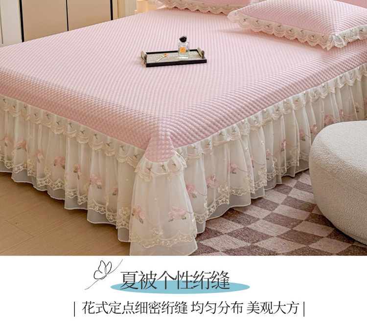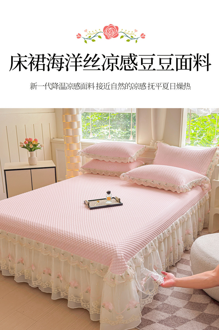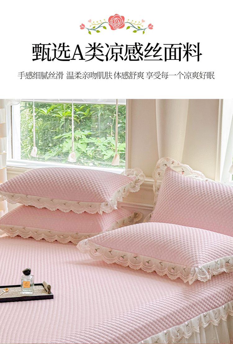 商品名称:漫布云2025甄选A类凉豆豆纯色系蕾丝花边床裙款床单款床盖床单凉席三件套蕾丝床盖款凉席三件套 唯爱-樱花粉