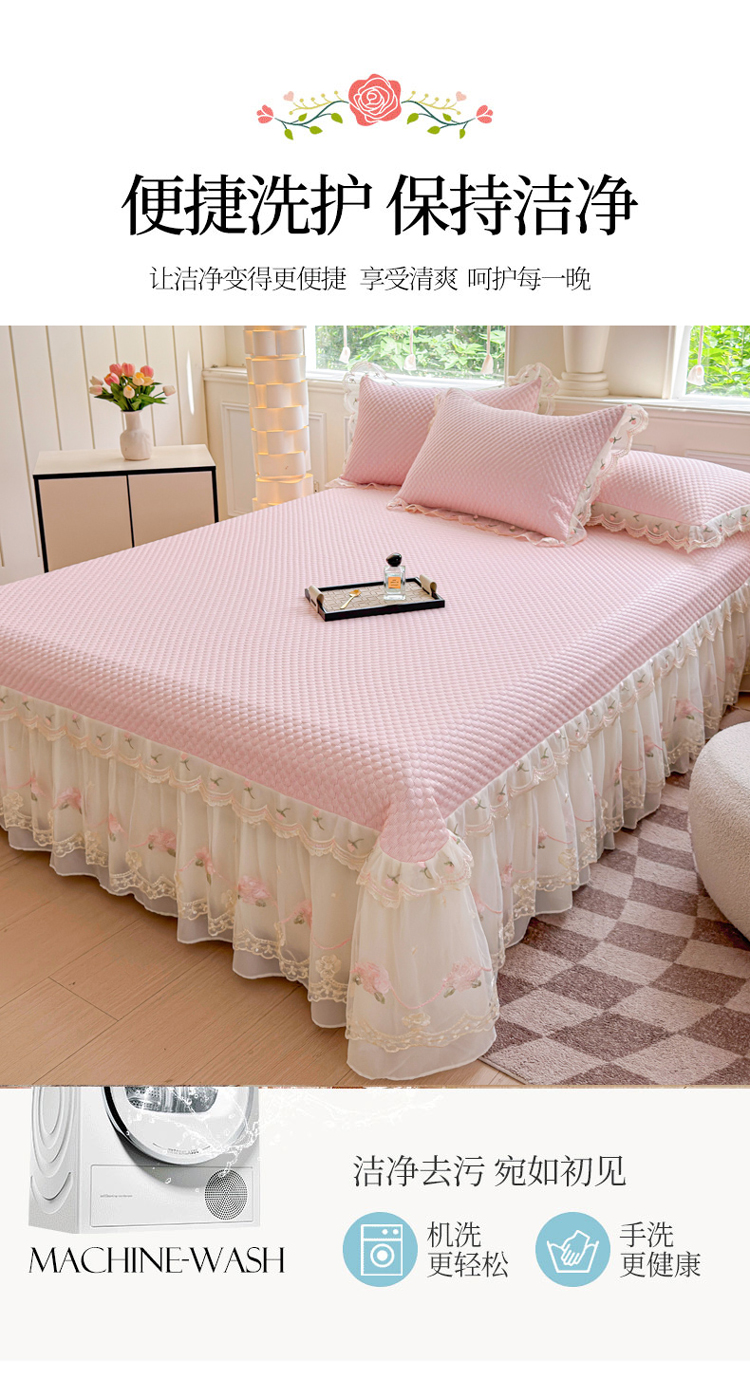 漫布云2025甄选A类凉豆豆纯色系蕾丝花边床裙款床单款床盖床单凉席三件套蕾丝床盖款凉席三件套 唯爱-樱花粉