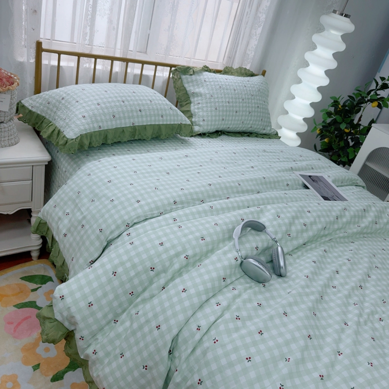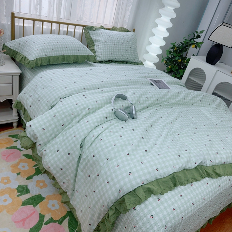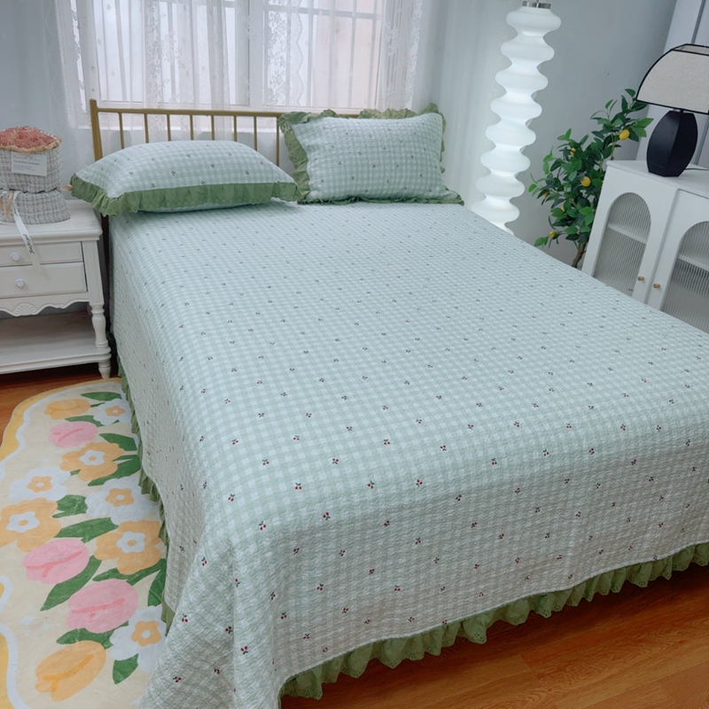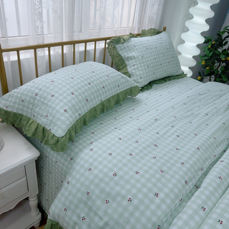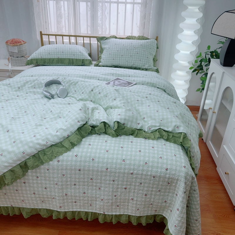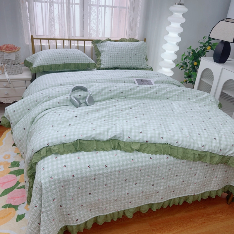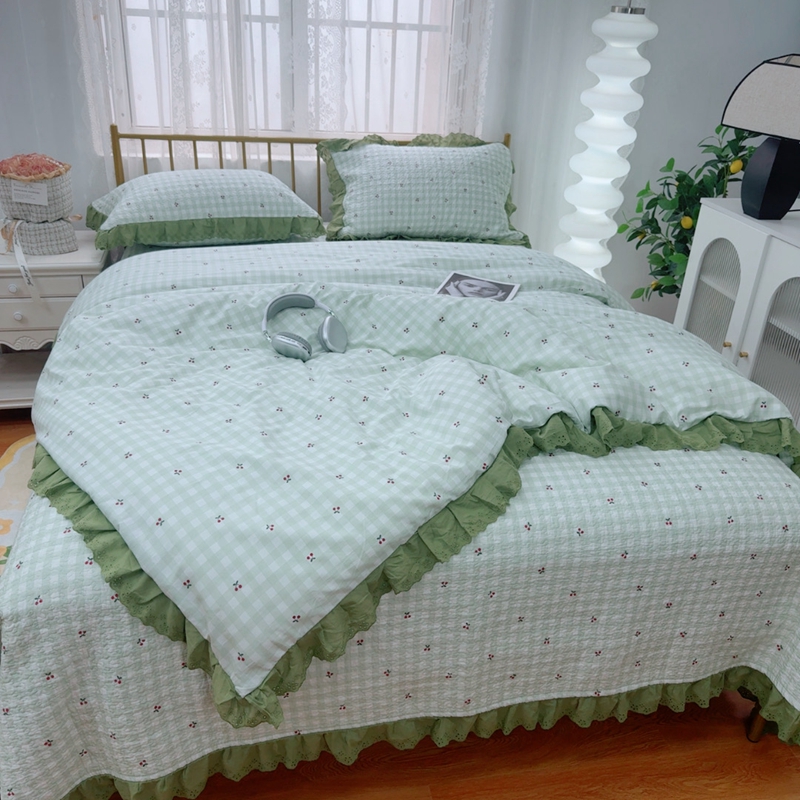 商品名称:暖居 2025春夏款高温砂洗棉花床盖三件套被套四件套同款纯棉夏被空调被四季 小樱桃-绿