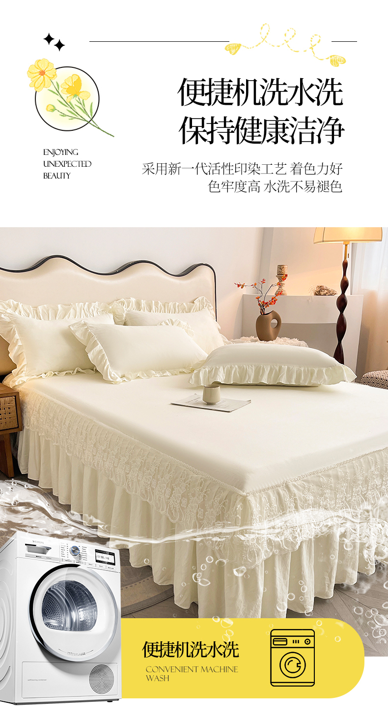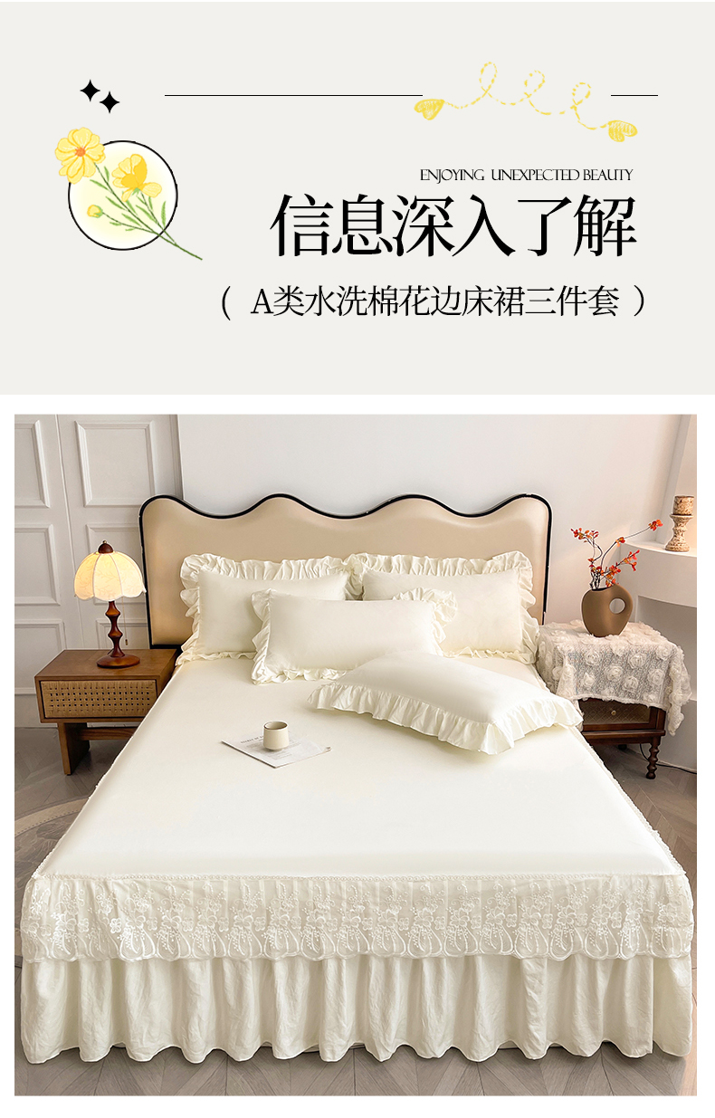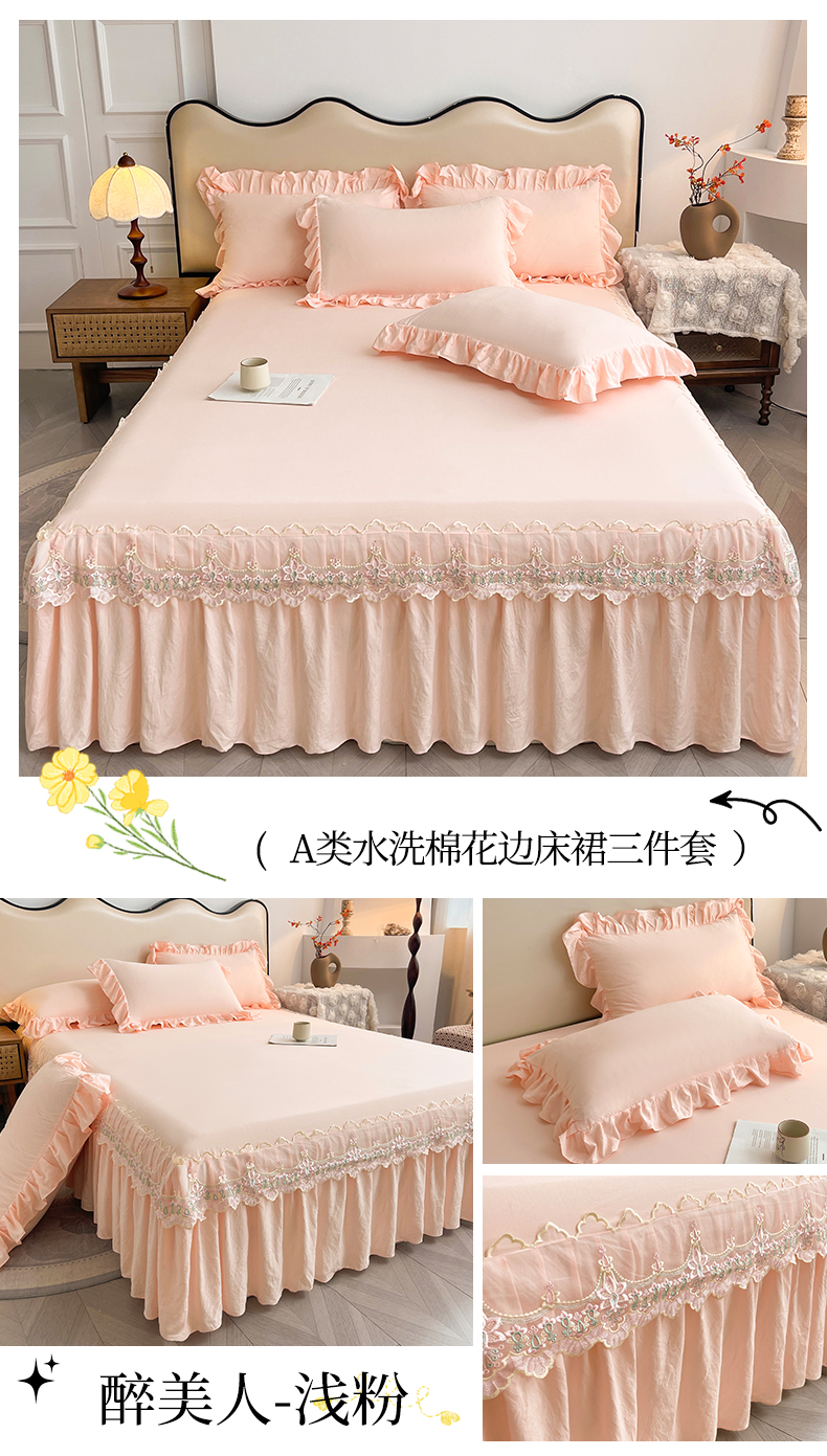 当前位置: 91家纺网 > 商品网购 > 床品套件 > 三件套 > (总)好儿喜家纺 2025新款A类水洗棉花边床裙蕾丝床罩三件套-醉美人