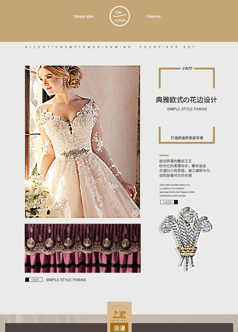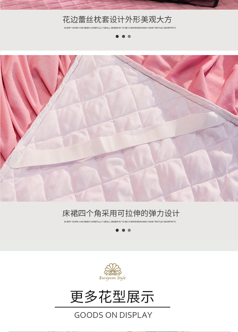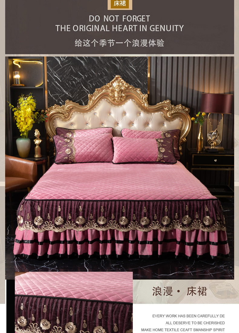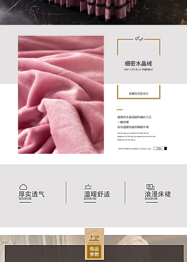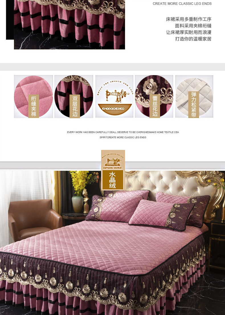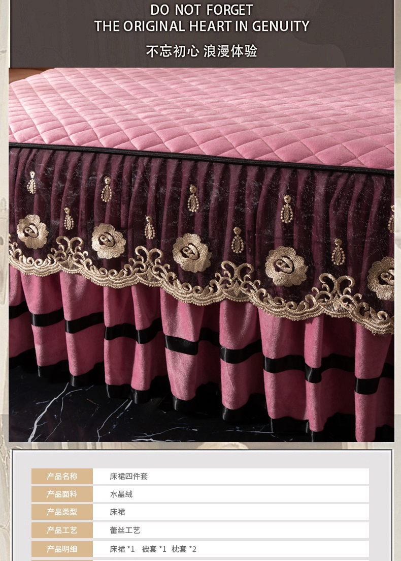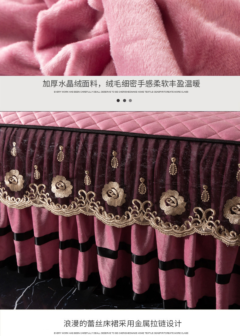 当前位置: 91家纺网 > 商品网购 > 床品套件 > 四件套 > 水晶绒四件套 > 能好家纺 2025新款蕾丝工艺水晶绒夹棉床裙 豆沙