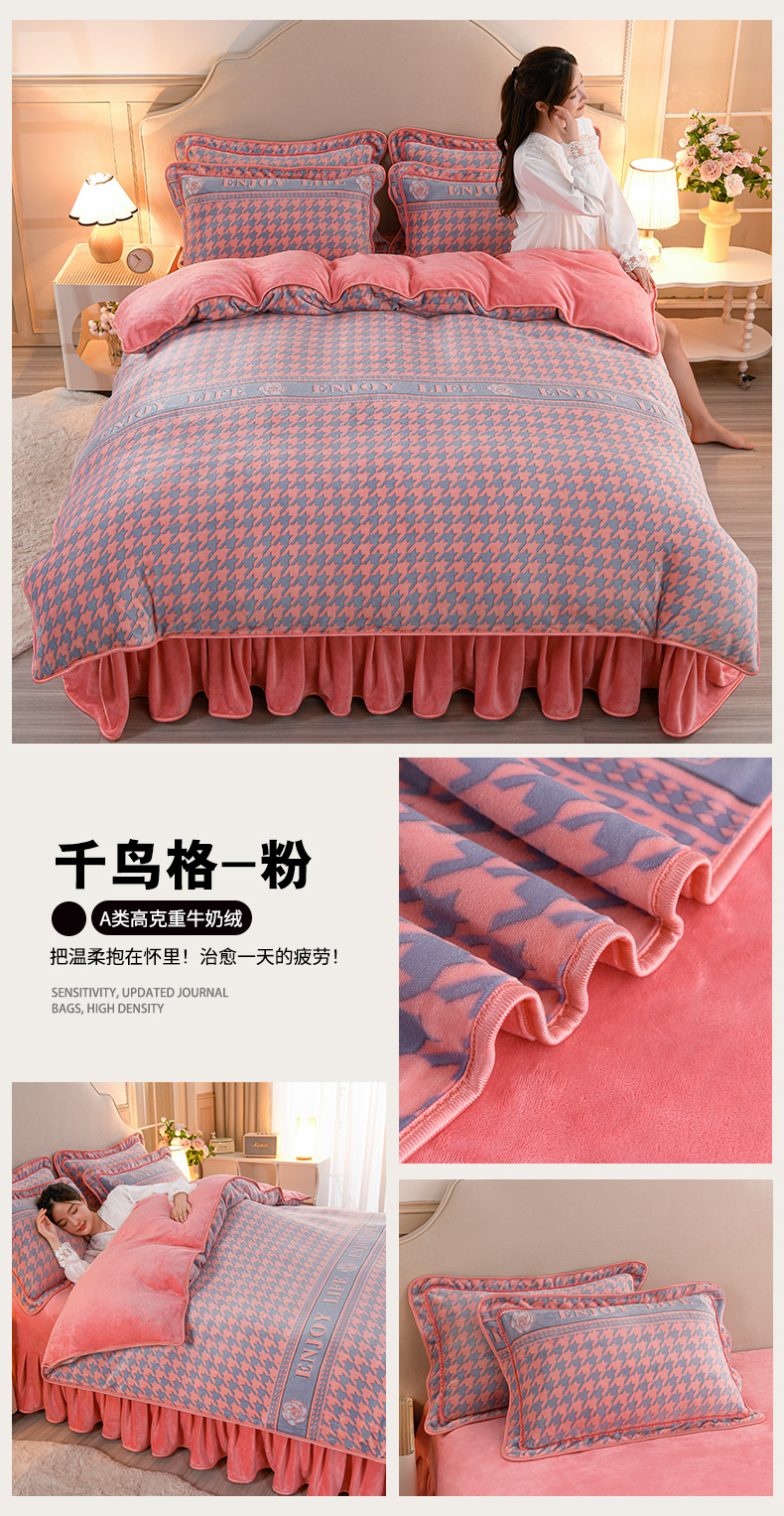 羽梦2025新款8.5斤牛奶法莱绒金貂法兰绒四件套直播爆款千鸟格-粉