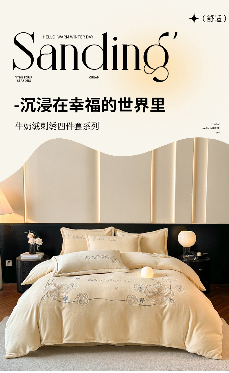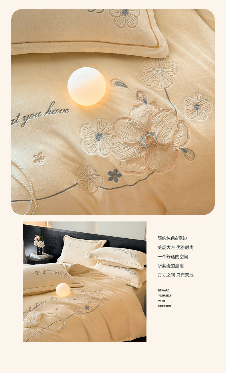 诺梵家纺 2025新款8斤牛奶绒刺绣绣花四件套 绮梦-米黄