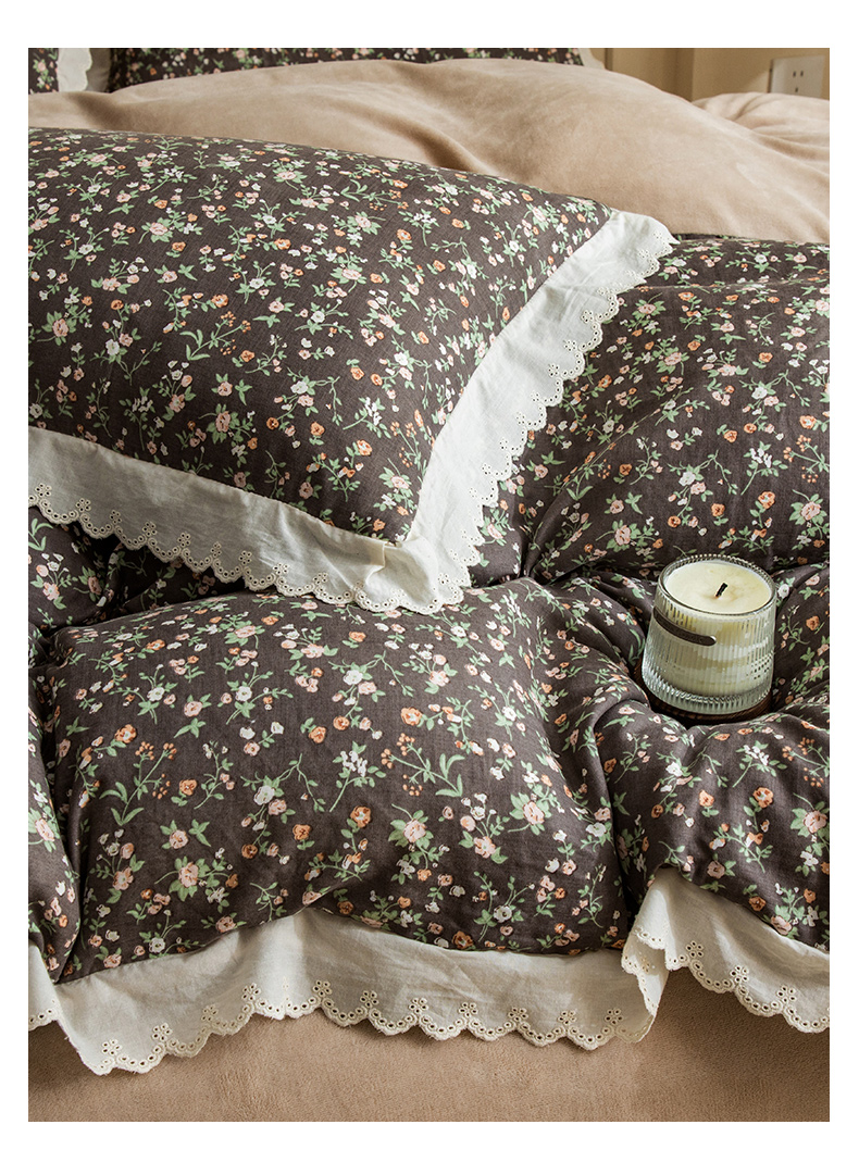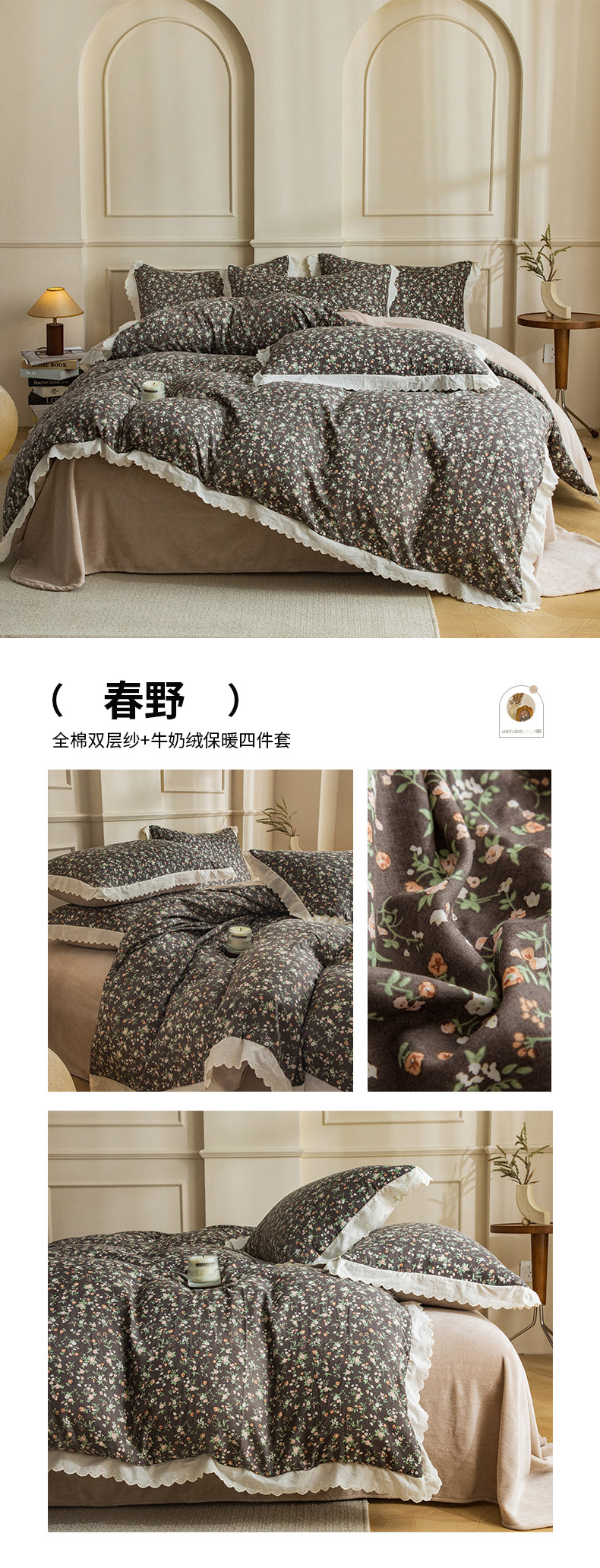 商品名称:大境 2025秋冬新款A类全棉双层纱棉加牛奶绒四件套韩版公主风 春野