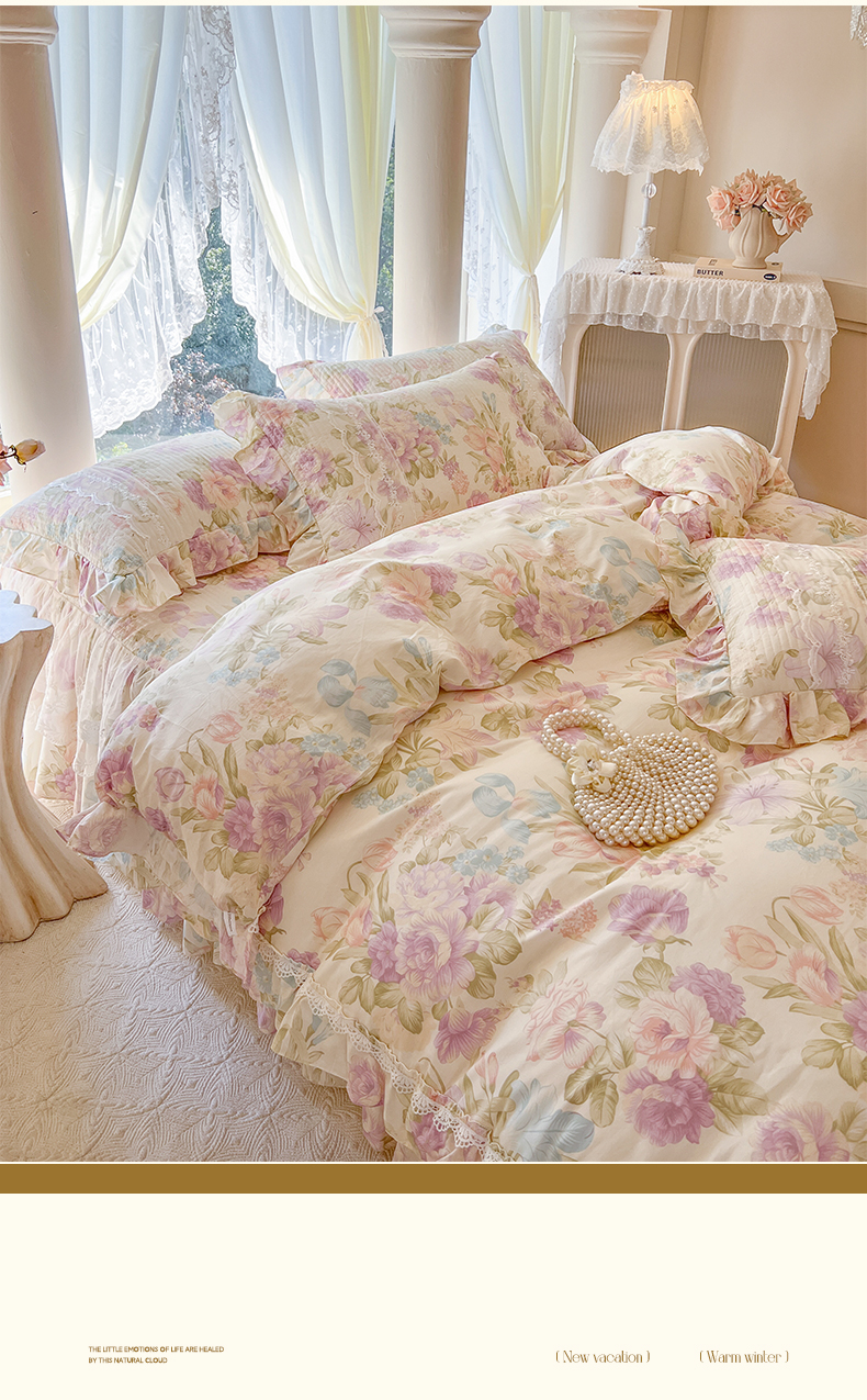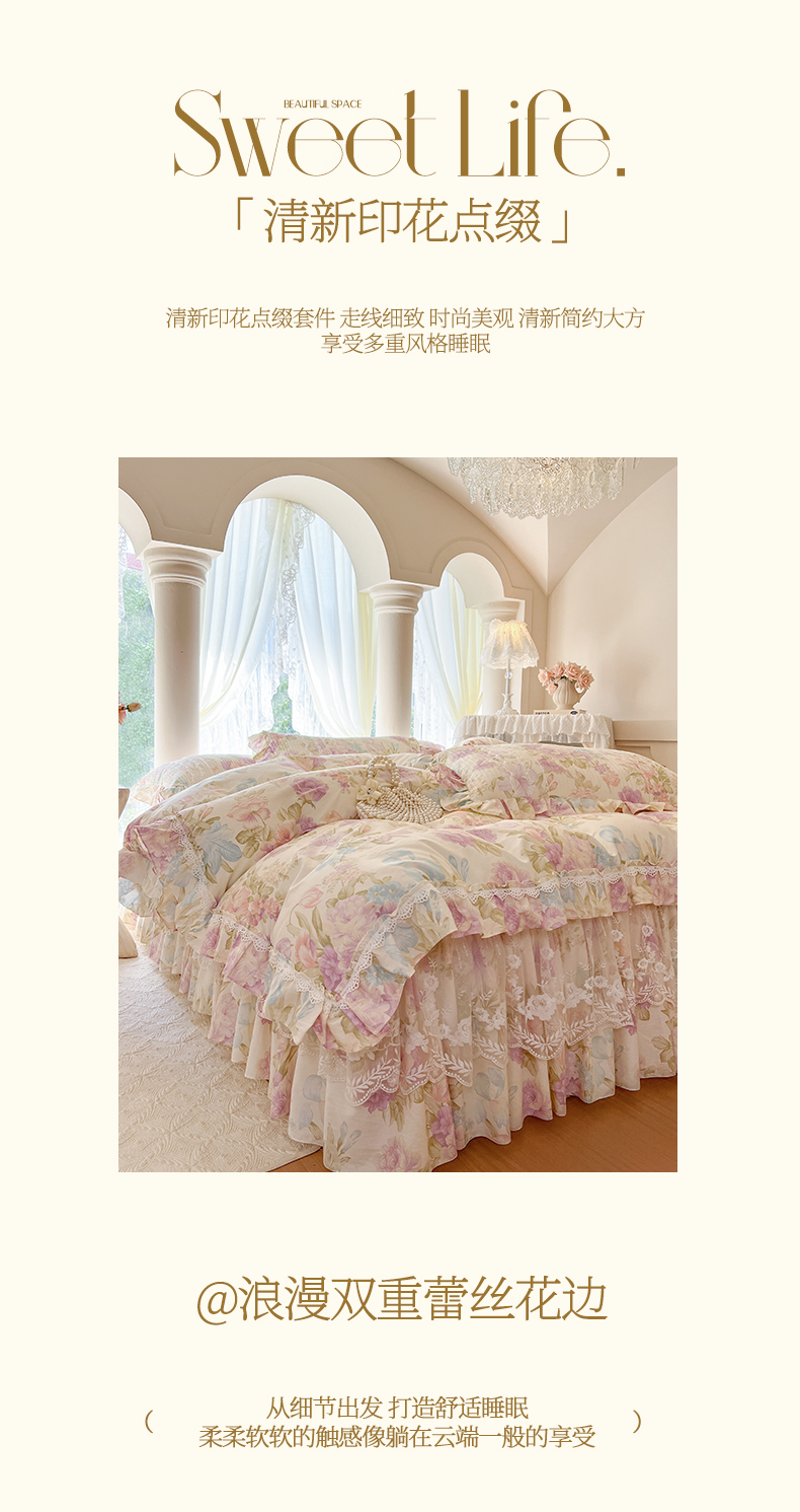 瑞宝 2025新款13372全棉印花花边床裙四件套 浪漫花溪