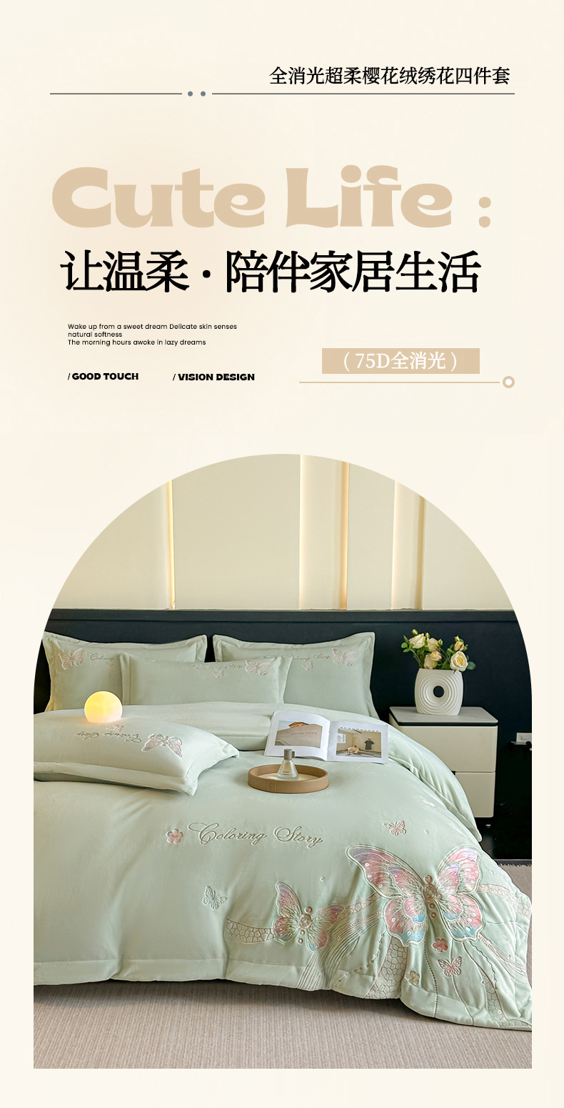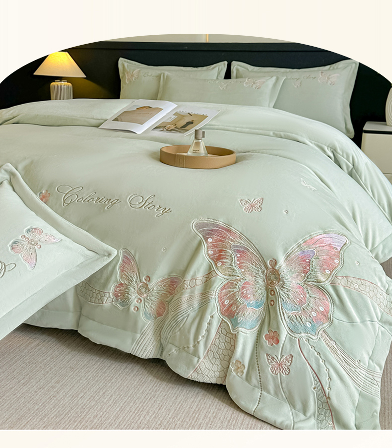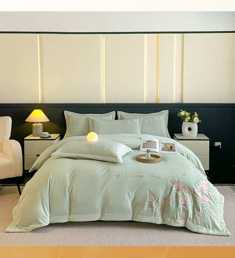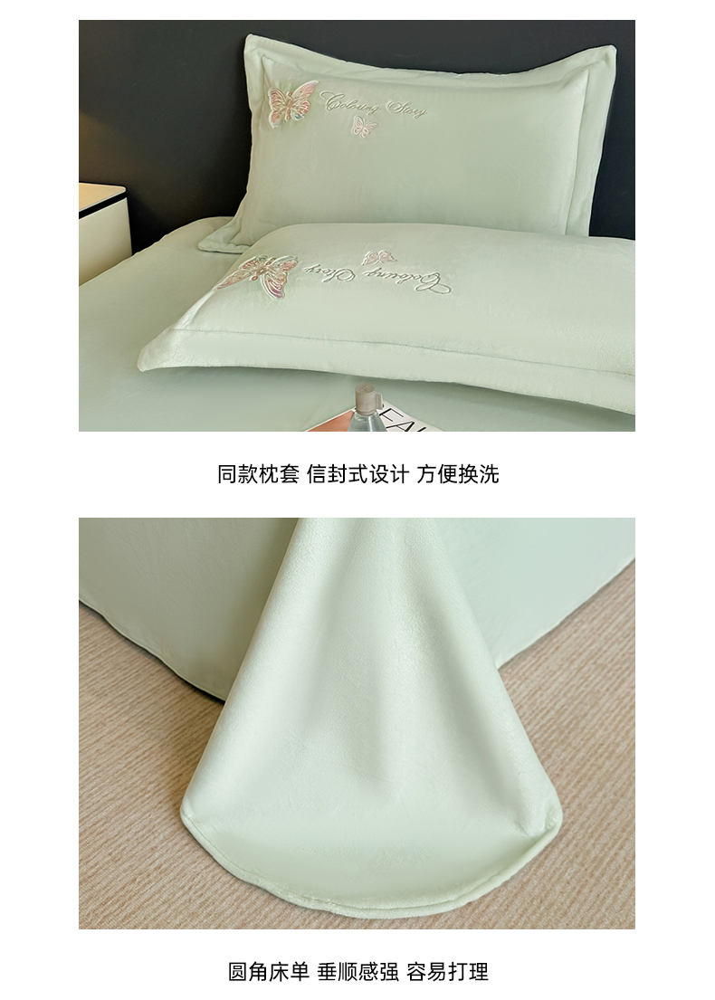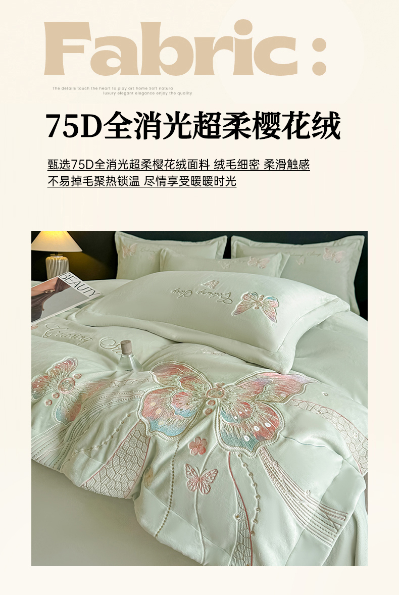 商品名称:锦铭源家纺 2025新款75D全消光超柔樱花绒绣花四件套牛奶绒四件套【有买家秀】 蝶恋-浅绿