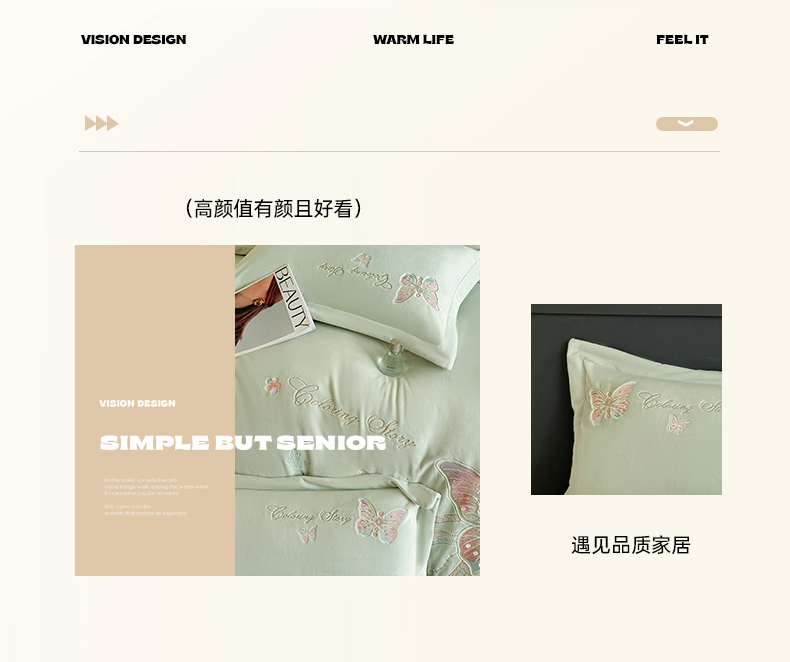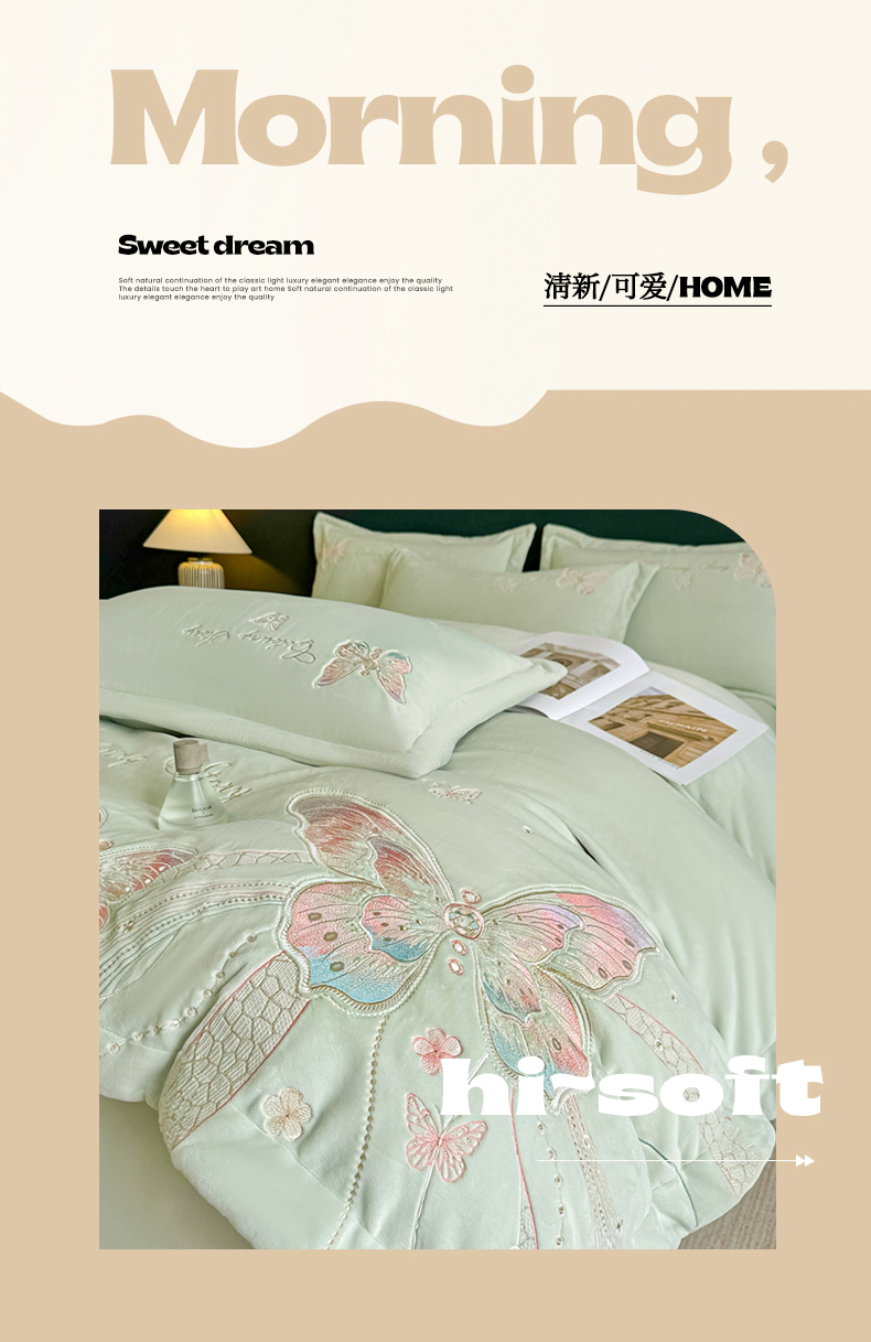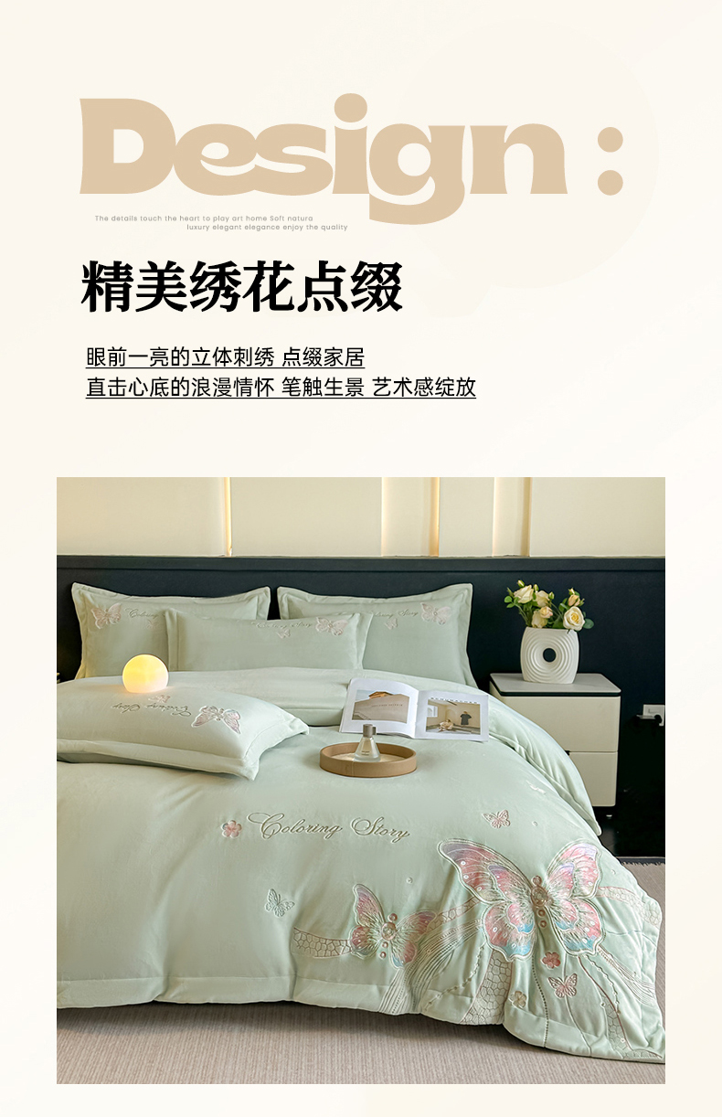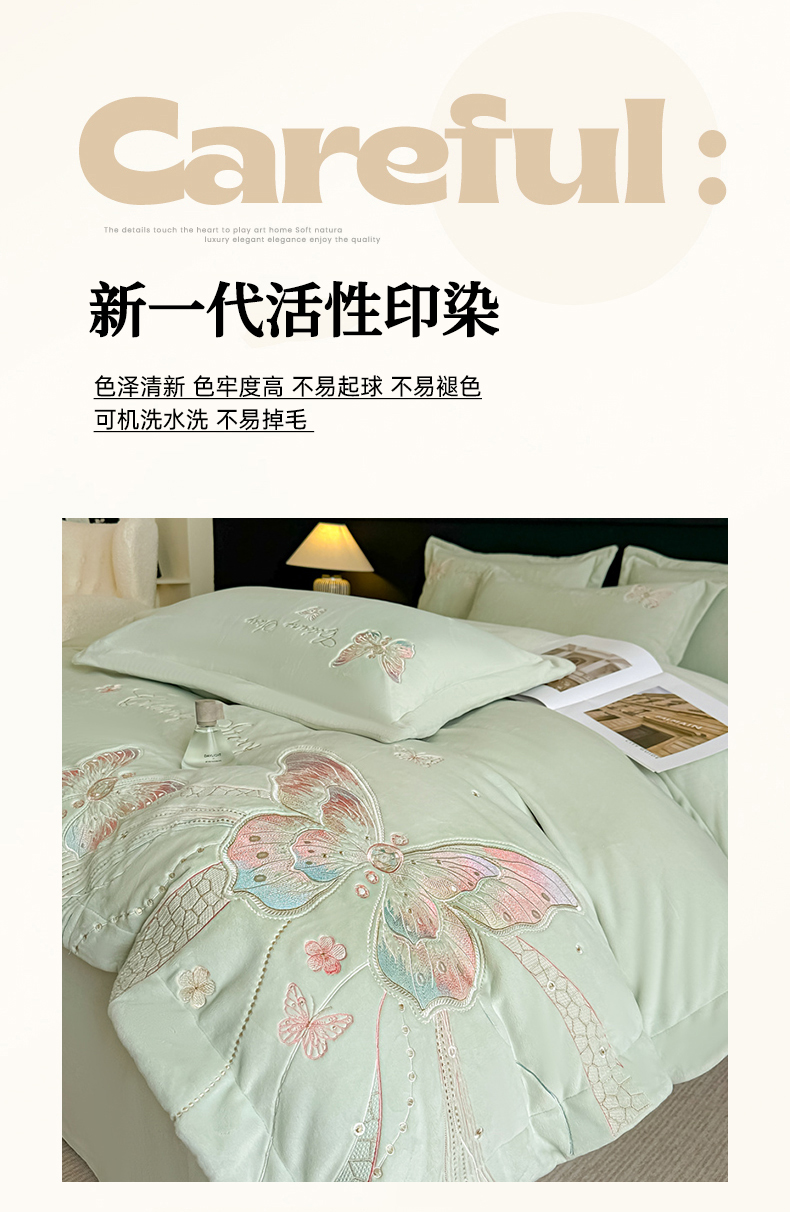 商品名称:锦铭源家纺 2025新款75D全消光超柔樱花绒绣花四件套牛奶绒四件套【有买家秀】 蝶恋-浅绿