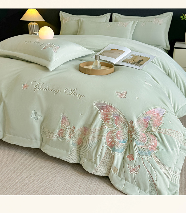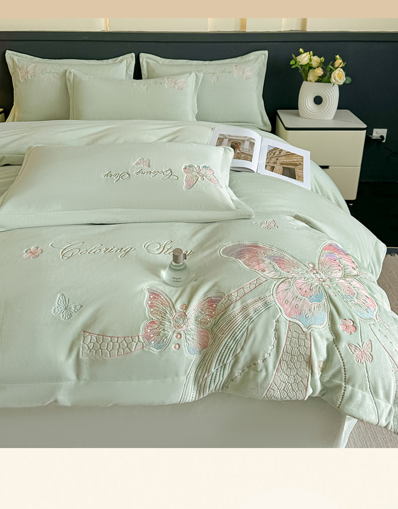 锦铭源家纺 2025新款75D全消光超柔樱花绒绣花四件套牛奶绒四件套【有买家秀】 蝶恋-浅绿