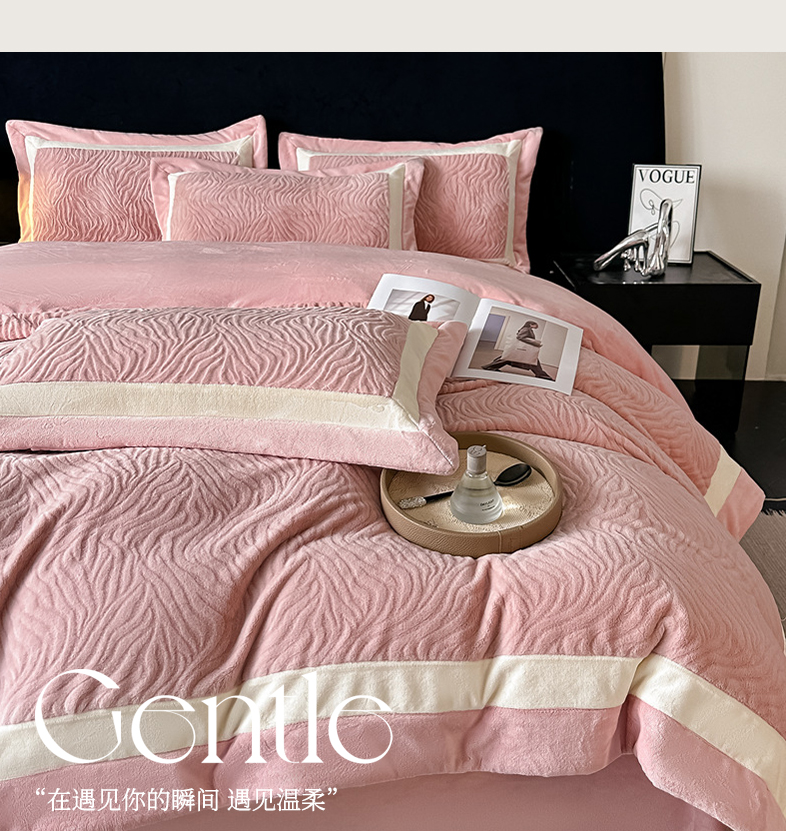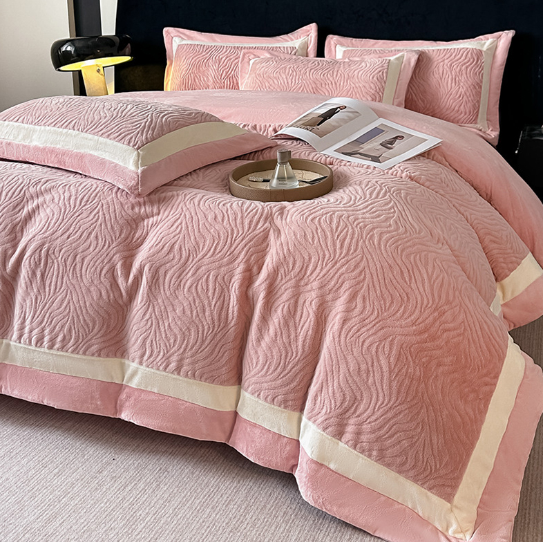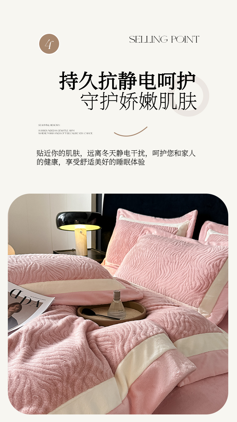商品名称:锦铭源家纺 2025新款雪貂绒烂花75D全消光超柔樱花绒双拼角四件套牛奶绒四件套【有买家秀】 轻奢-粉