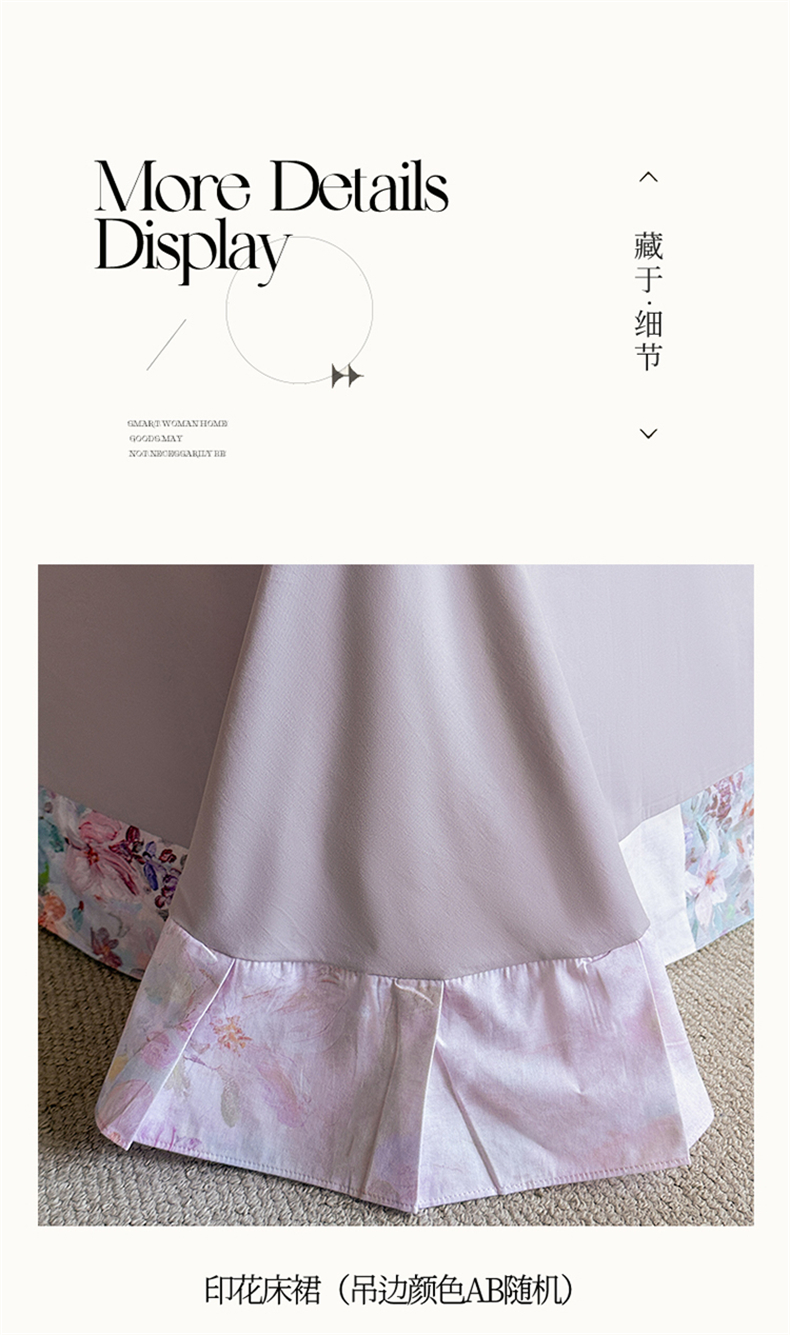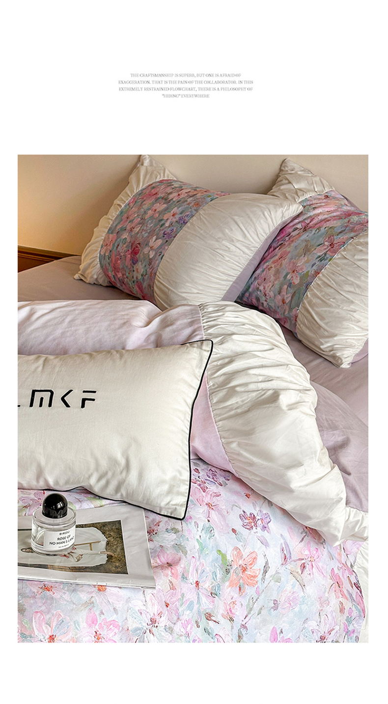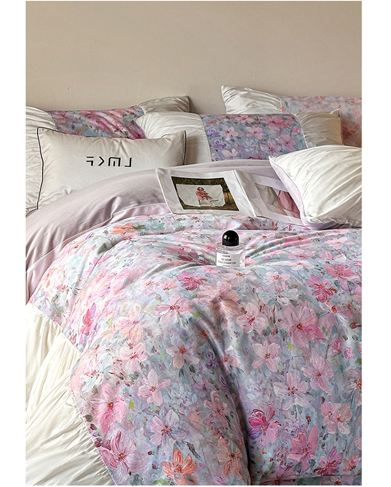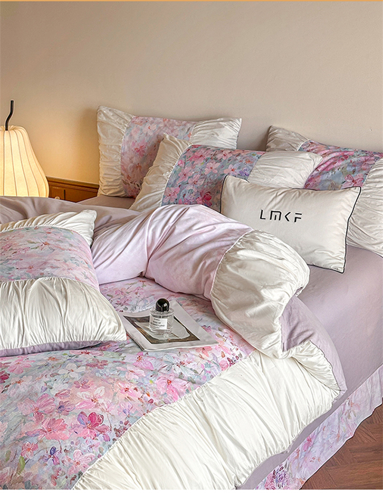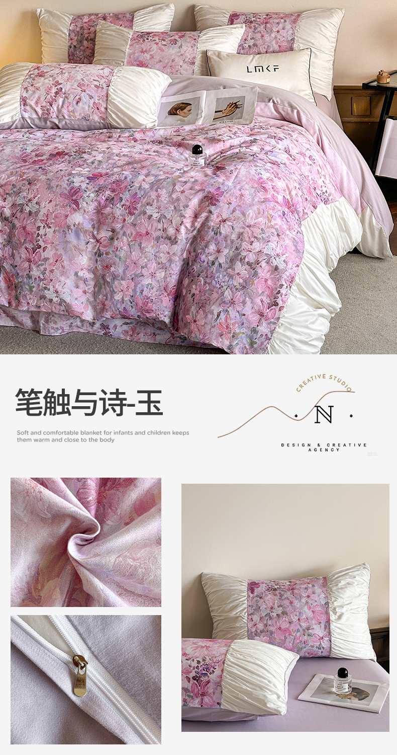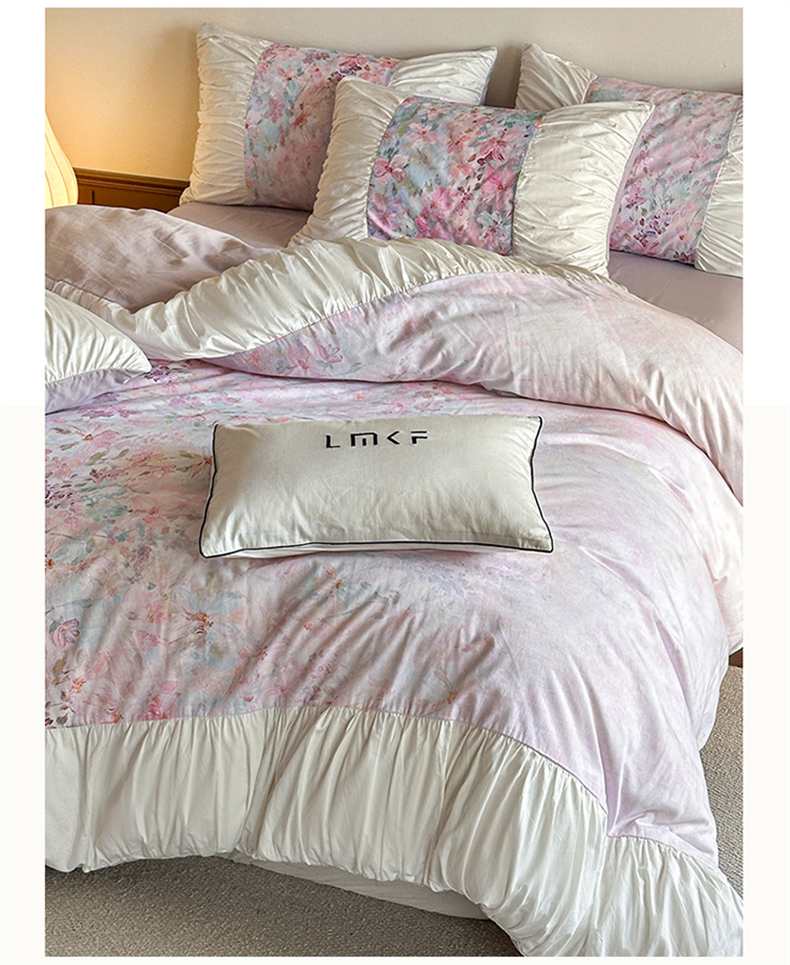 商品名称:蓝米卡夫 2025秋冬-A类全棉50S*50S双股磨毛数码印花法式褶皱花边款(礼盒包装)-拍摄风格2 笔触与诗-粉