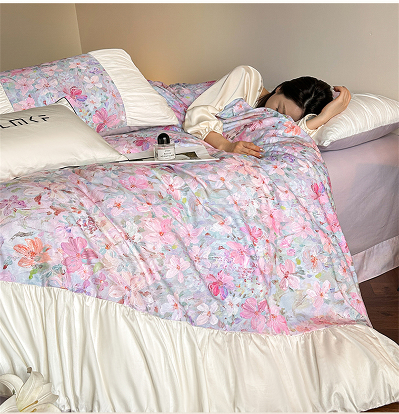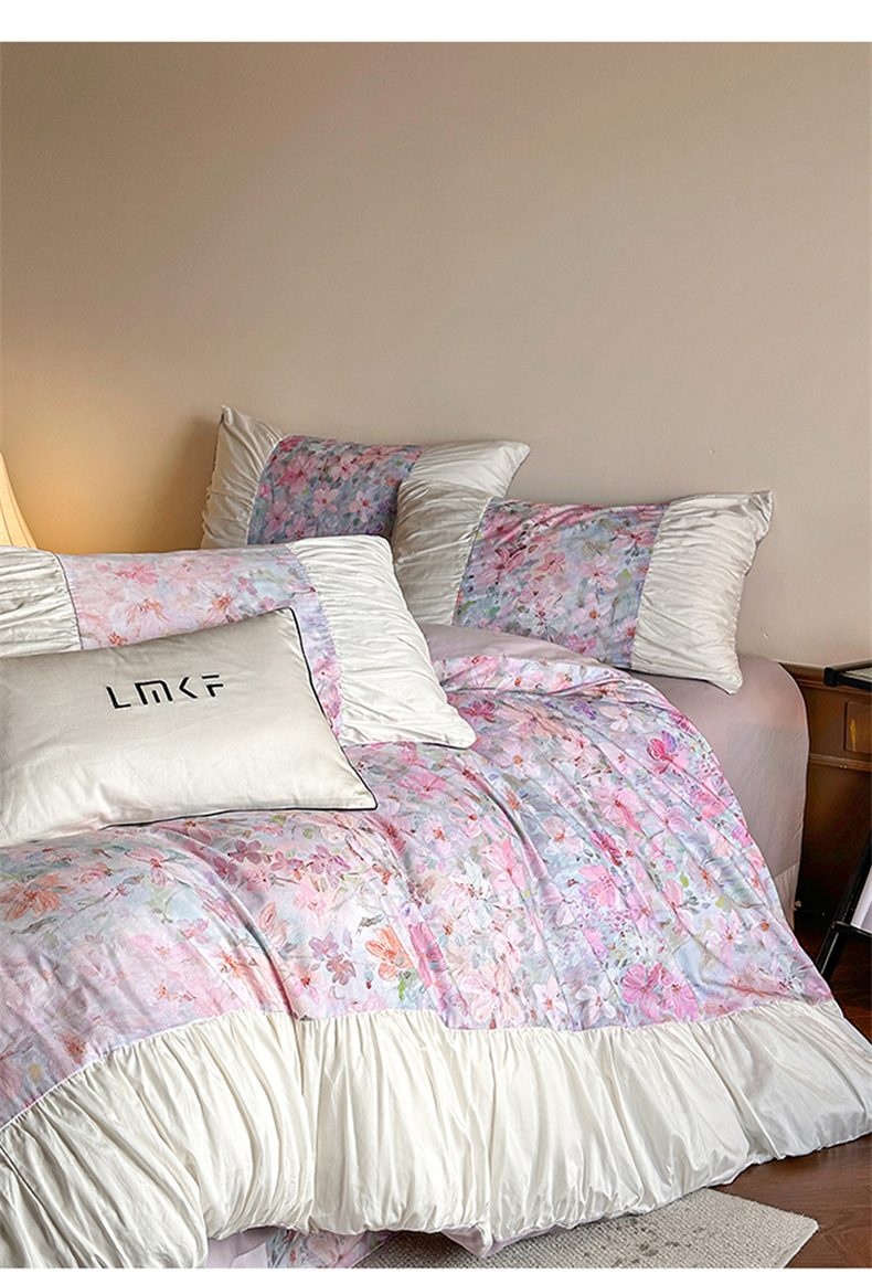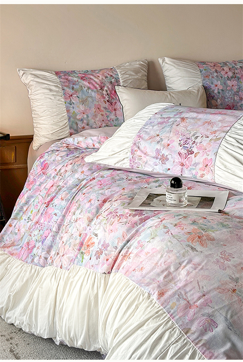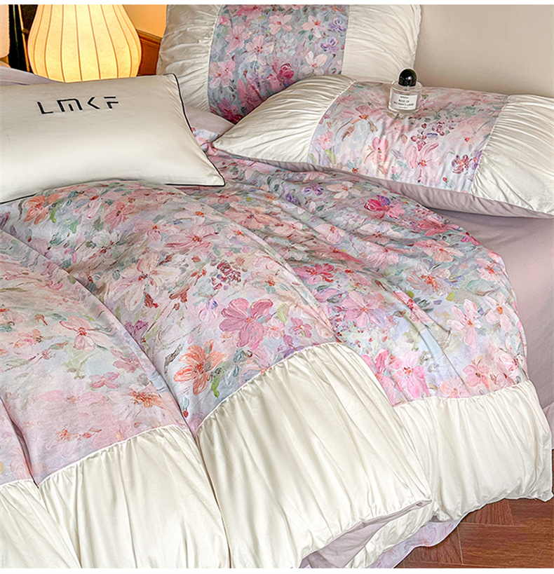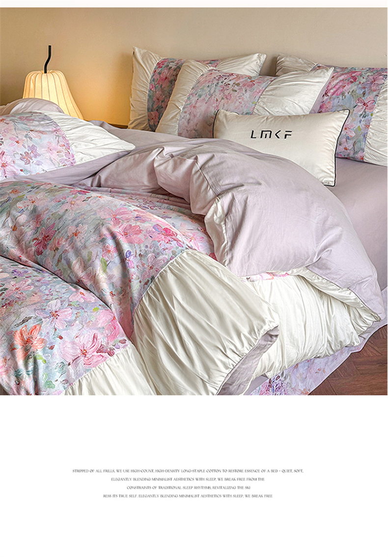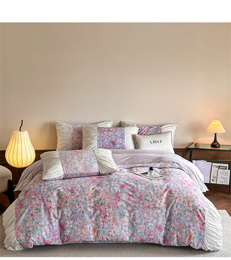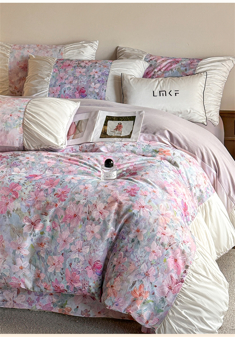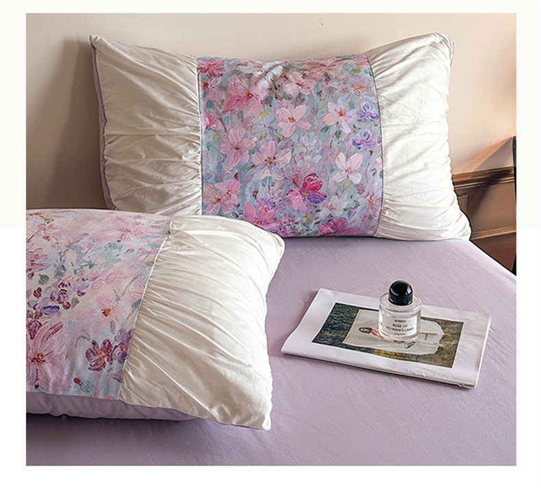 商品名称:蓝米卡夫 2025秋冬-A类全棉50S*50S双股磨毛数码印花法式褶皱花边款(礼盒包装)-拍摄风格2 笔触与诗-粉