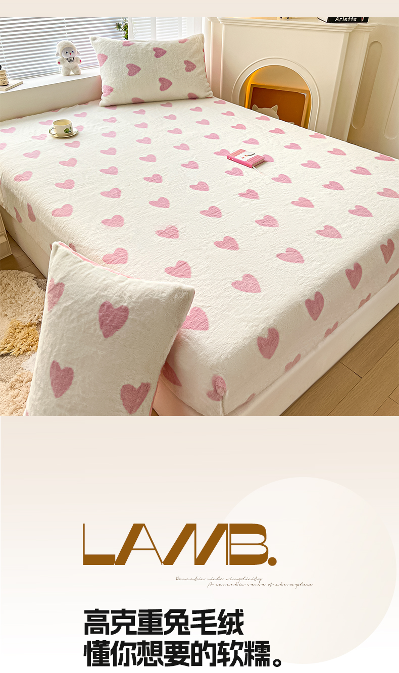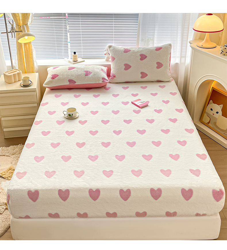 商品名称:雅居纺家纺 2025新款高克重兔绒印花单床笠-爱心 爱心-粉