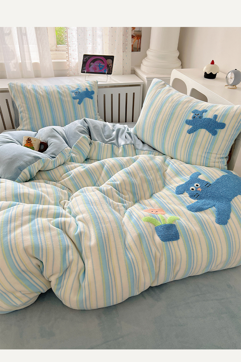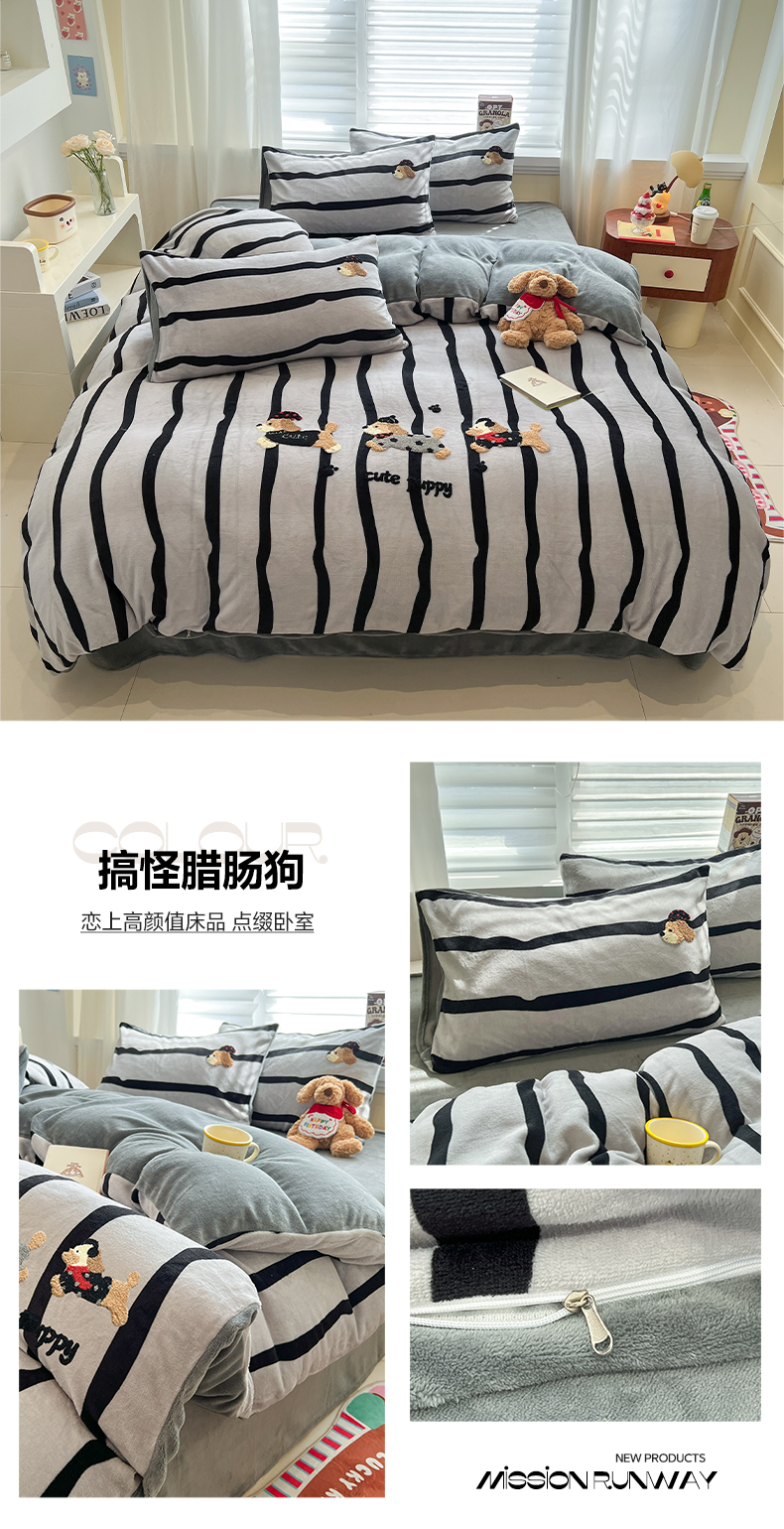 雅居纺家纺 2025新款加厚牛奶绒毛巾绣卡通四件套 花盆小狗