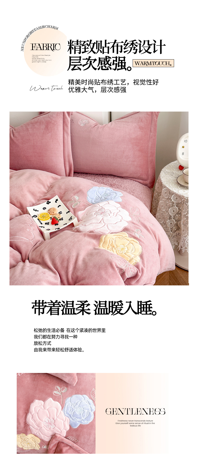 美伦美焕 2025新款高克重牛奶绒花朵贴布绣床盖款四件套 紫色