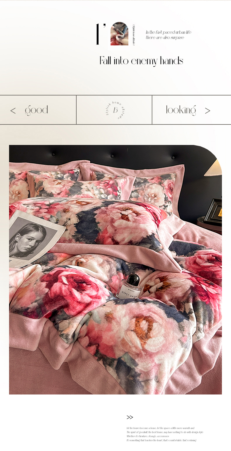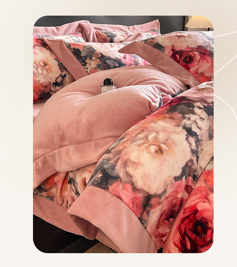 首尔家纺 2025新款牛奶绒宽边拼角数码印花四件套系列 国色天香
