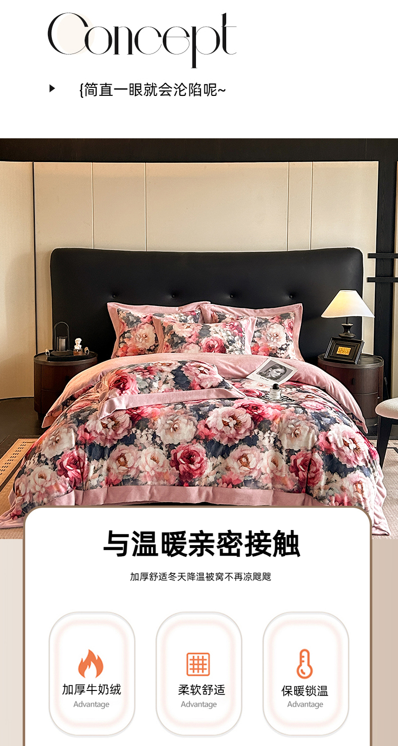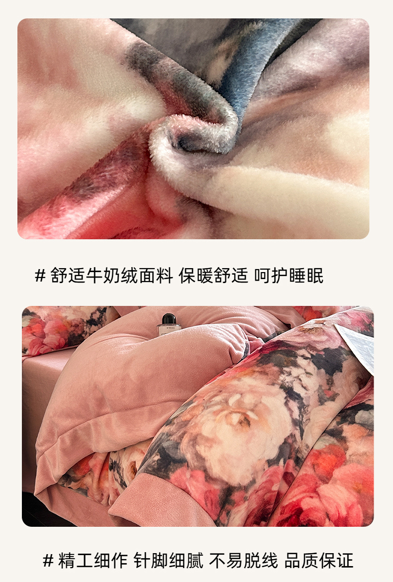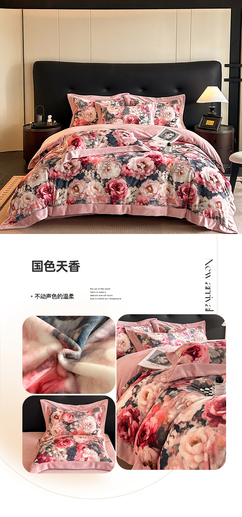商品名称:首尔家纺 2025新款牛奶绒宽边拼角数码印花四件套系列 国色天香