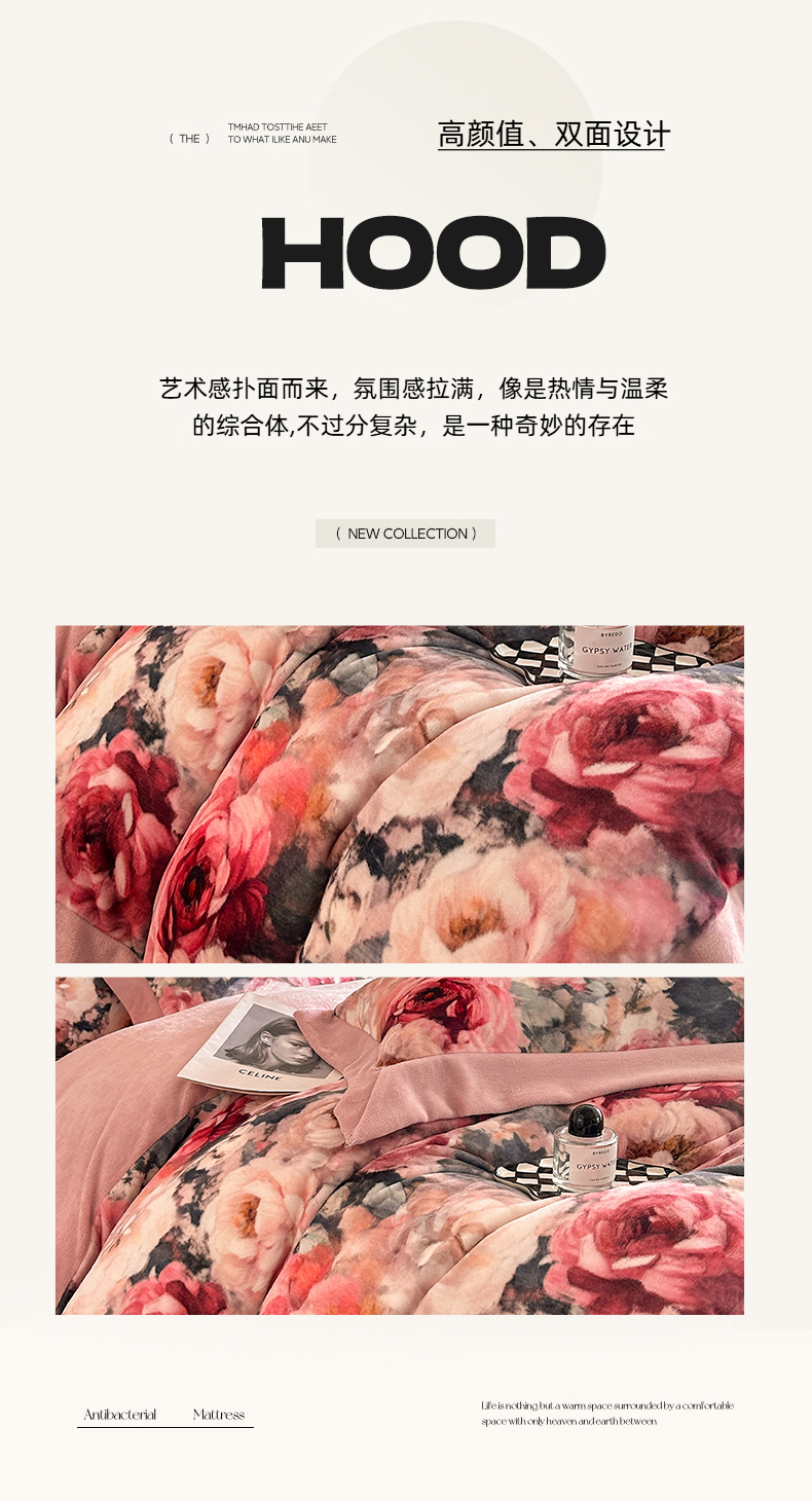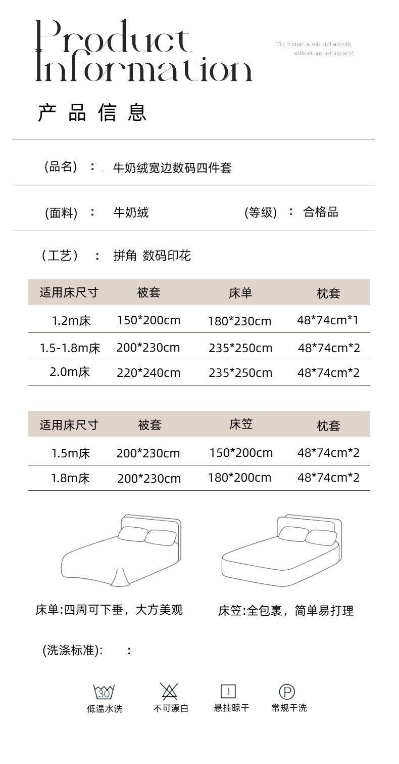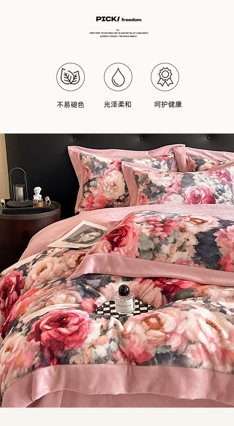 商品名称:首尔家纺 2025新款牛奶绒宽边拼角数码印花四件套系列 国色天香