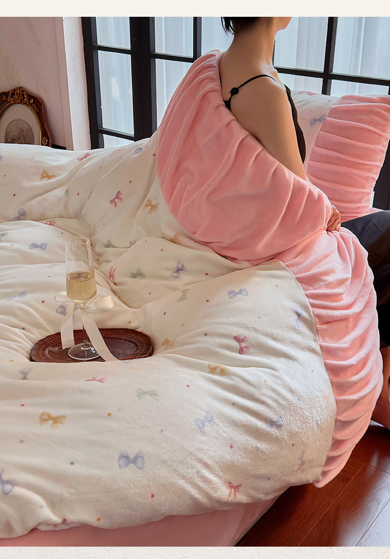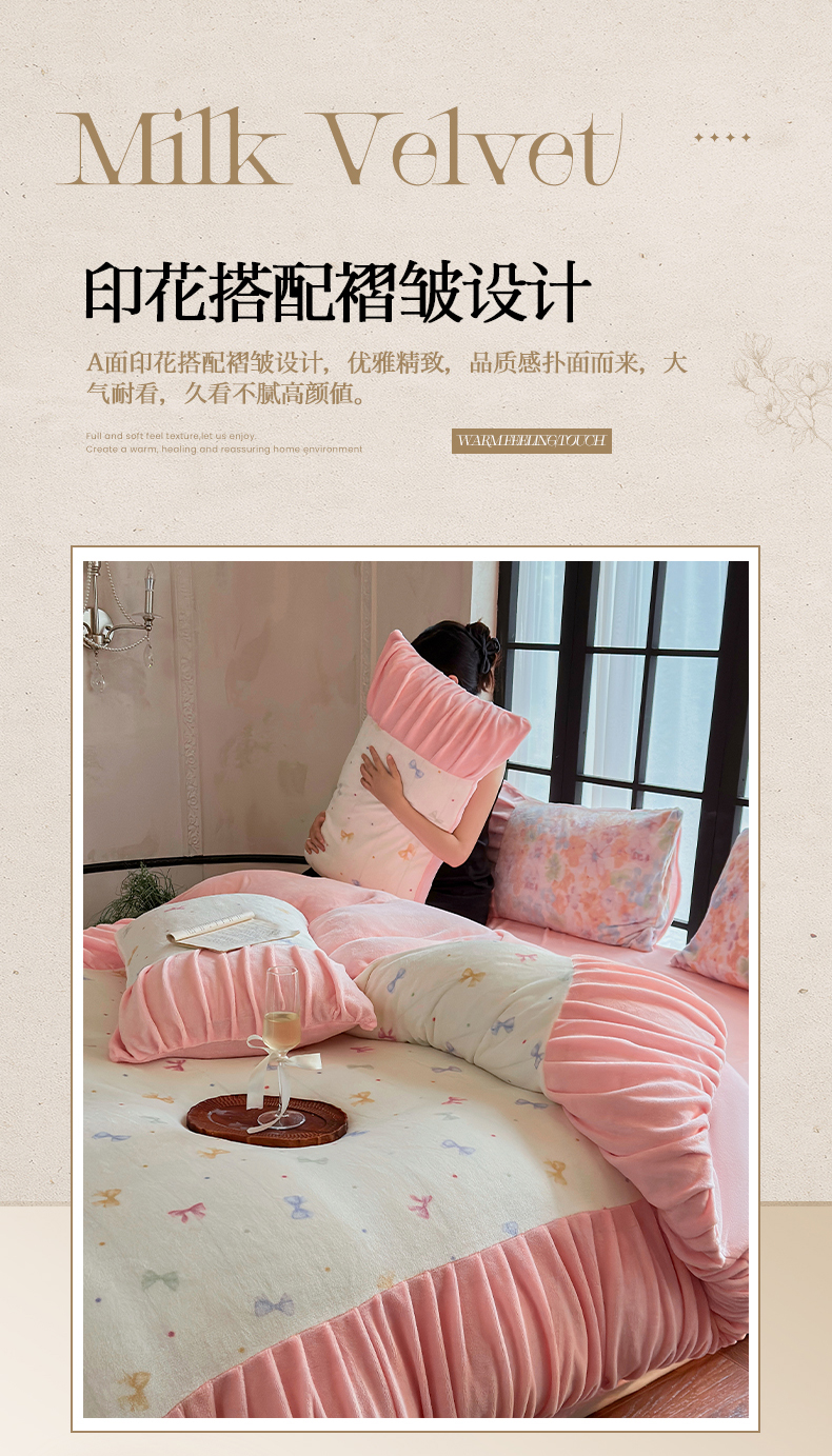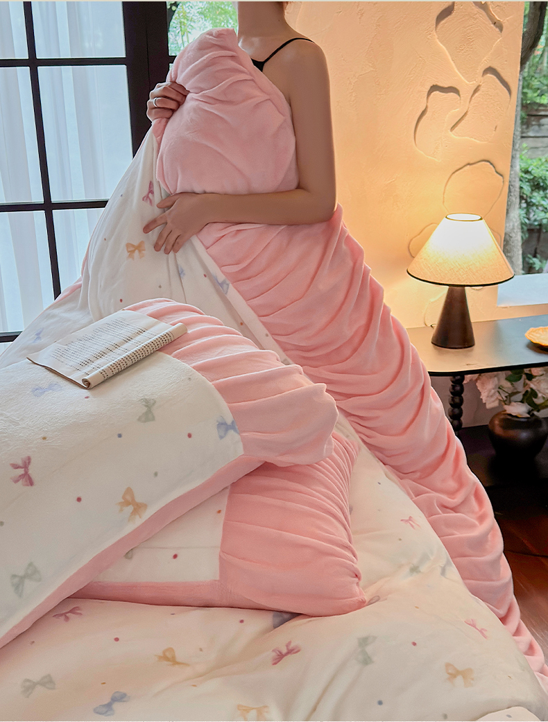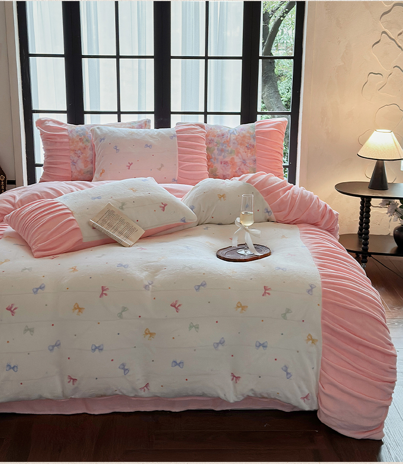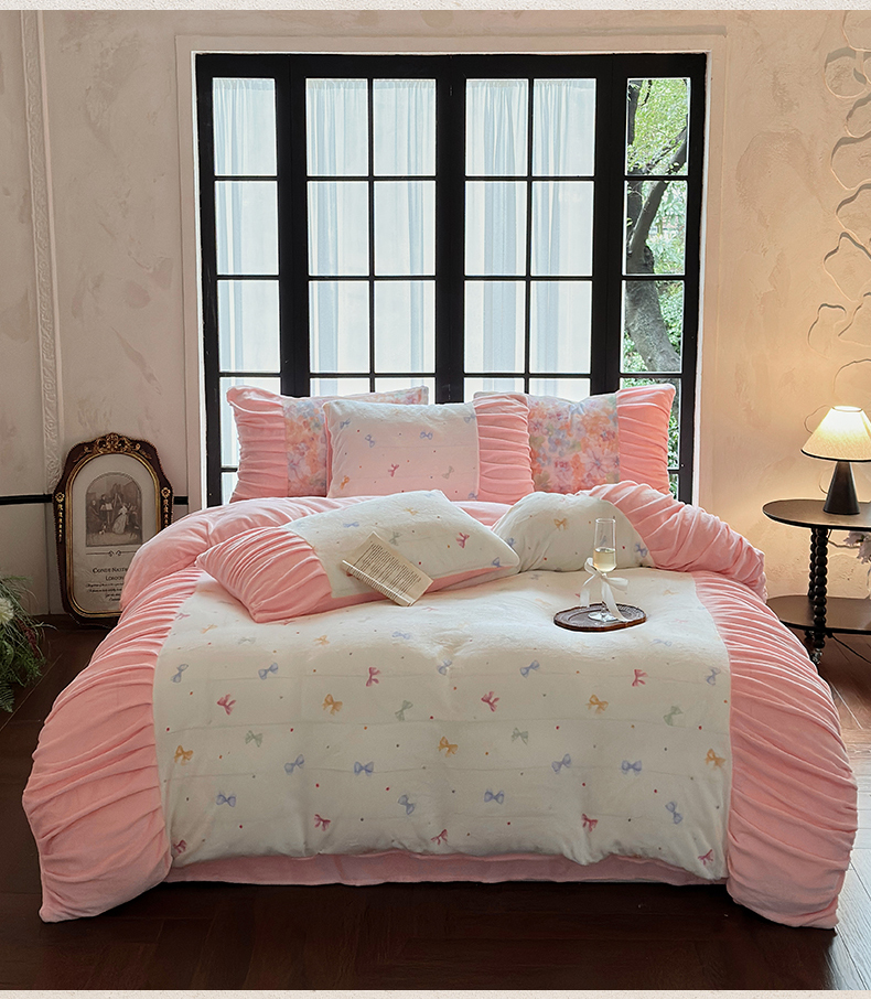 当前位置: 91家纺网 > 商品网购 > 床品套件 > 四件套 > 牛奶绒四件套 > 艾米家居 2025新款秋冬牛奶绒印花皱皱系列四件套提供买家秀 蝴蝶结粉