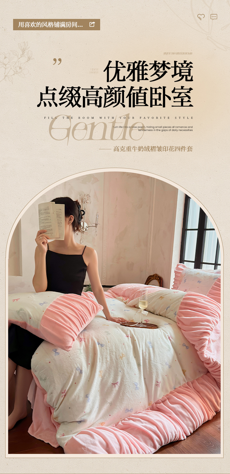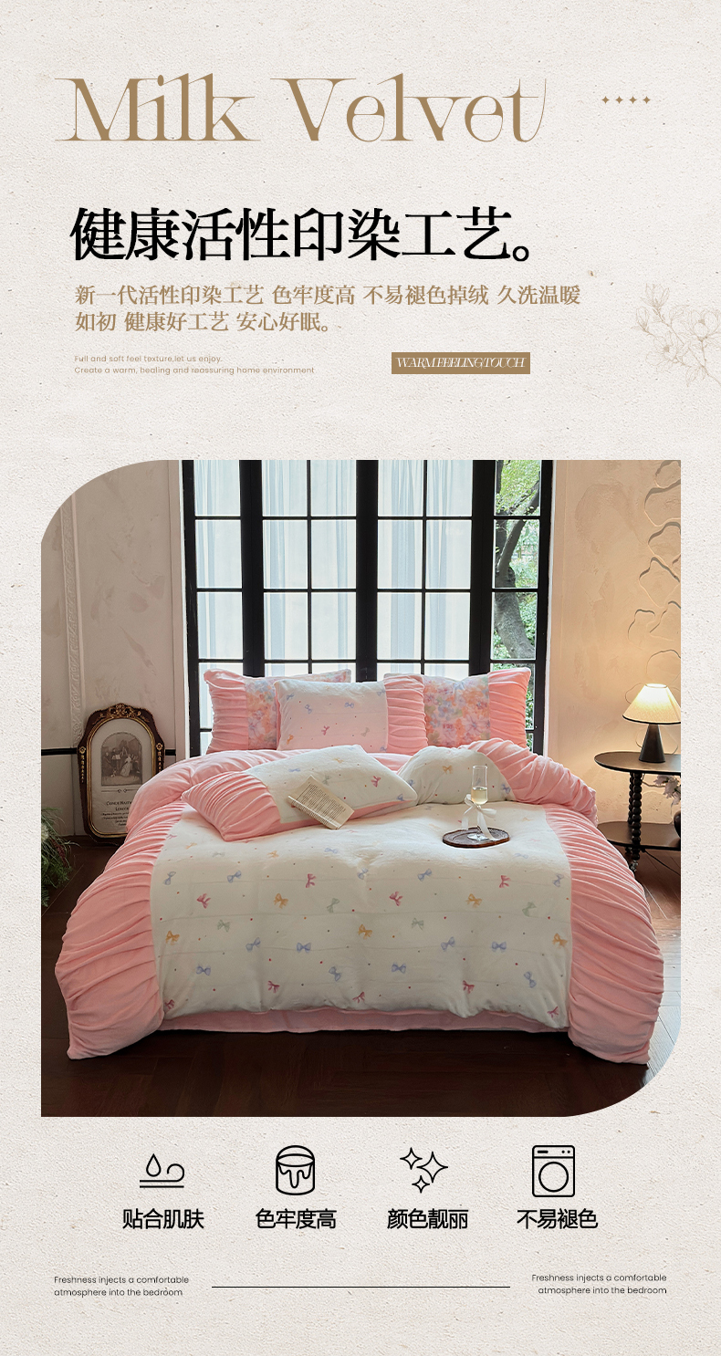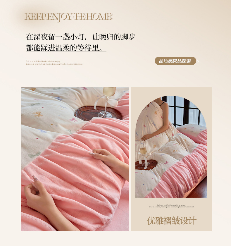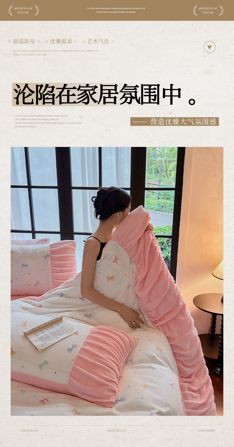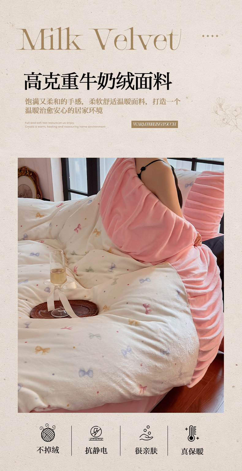 当前位置: 91家纺网 > 商品网购 > 床品套件 > 四件套 > 牛奶绒四件套 > 艾米家居 2025新款秋冬牛奶绒印花皱皱系列四件套提供买家秀 蝴蝶结粉