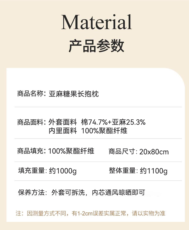 规格:20x80cm,外套面料:棉74.7%+亚麻25.3% (有质检),内里面料:100%聚酯纤维