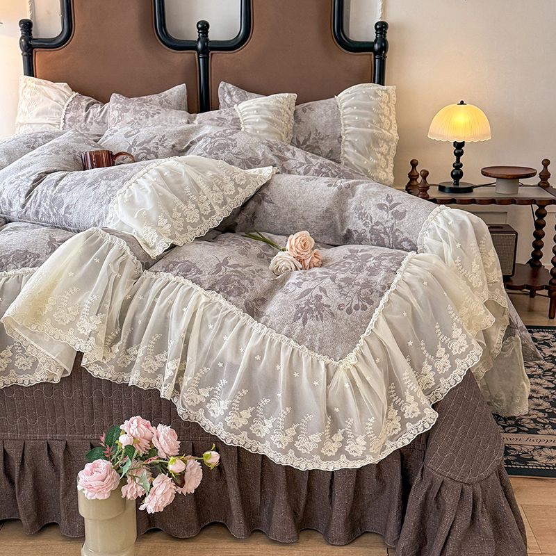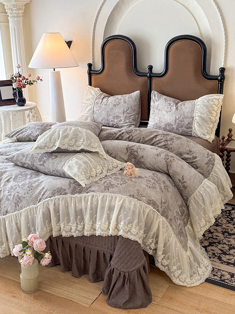 漫布云2025秋冬新款法式复古双层花边大蕾丝水洗棉亚麻床盖款四件套全棉纯棉印花小碎花四件套 巴洛克灰