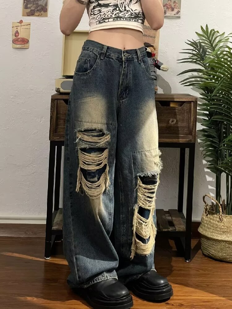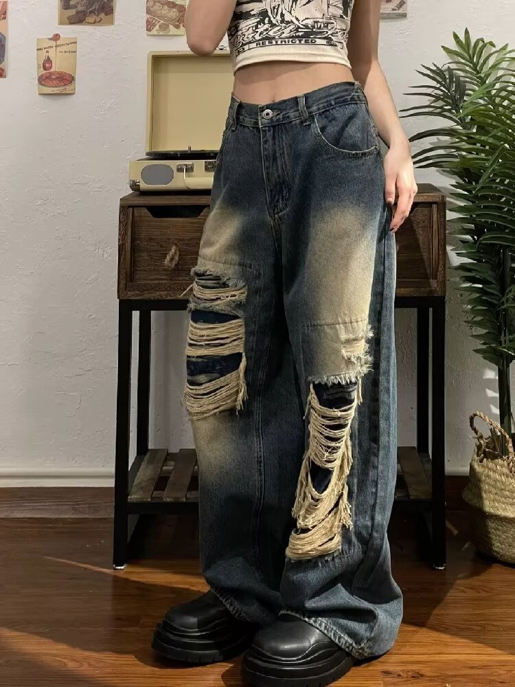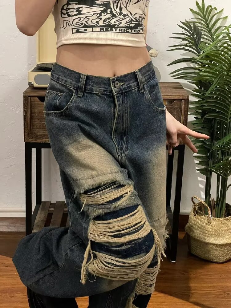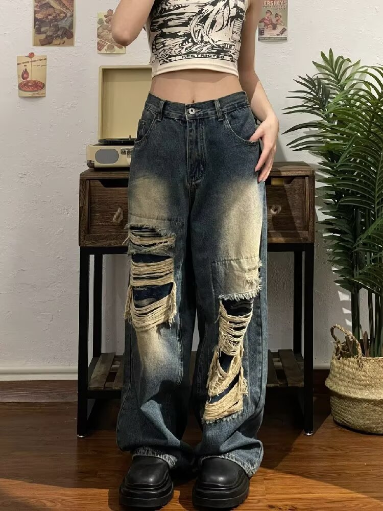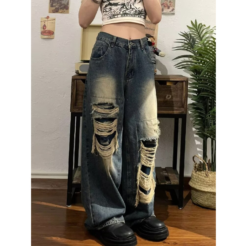商品名称:(总)2025新款只代发美式小众设计感破洞牛仔裤女早秋高腰显瘦辣妹高街宽松垂感阔腿裤批发23