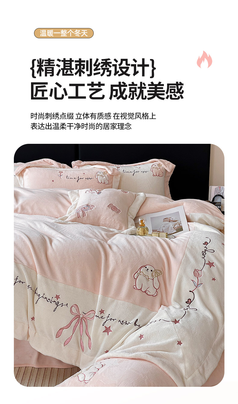 商品名称: 2025冬季爆款A类加厚牛奶绒四件套保暖双面加绒珊瑚绒重工刺绣被套床单卡通床上用品 萌兔-粉白