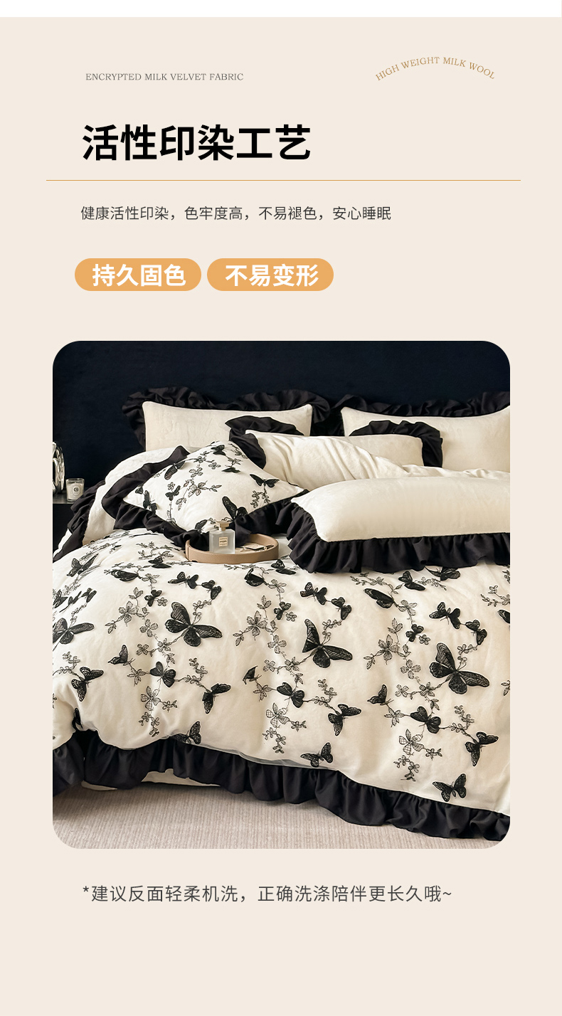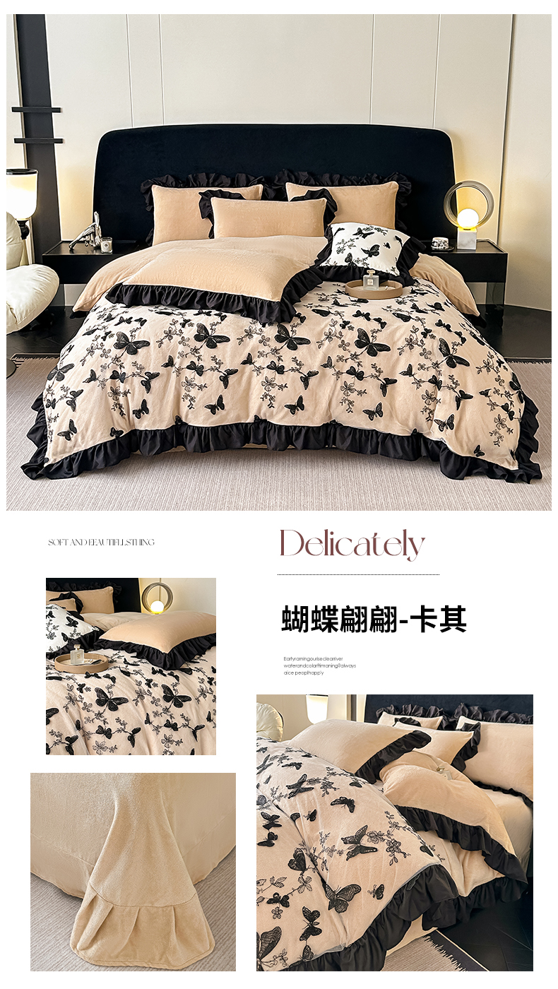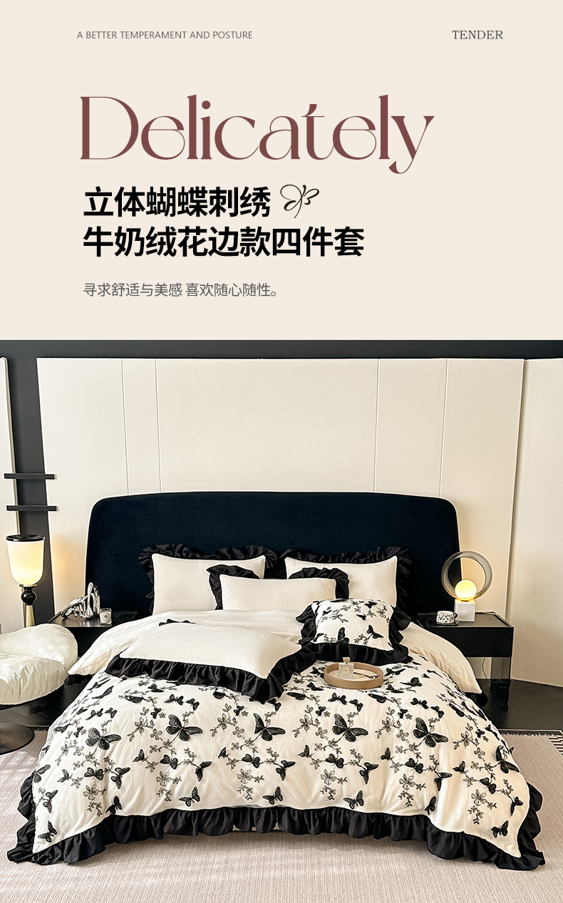 当前位置: 91家纺网 > 商品网购 > 床品套件 > 四件套 > 牛奶绒四件套 > (总)凯美家居 2025新款牛奶绒立体蕾丝刺绣四件套-蝴蝶翩翩
