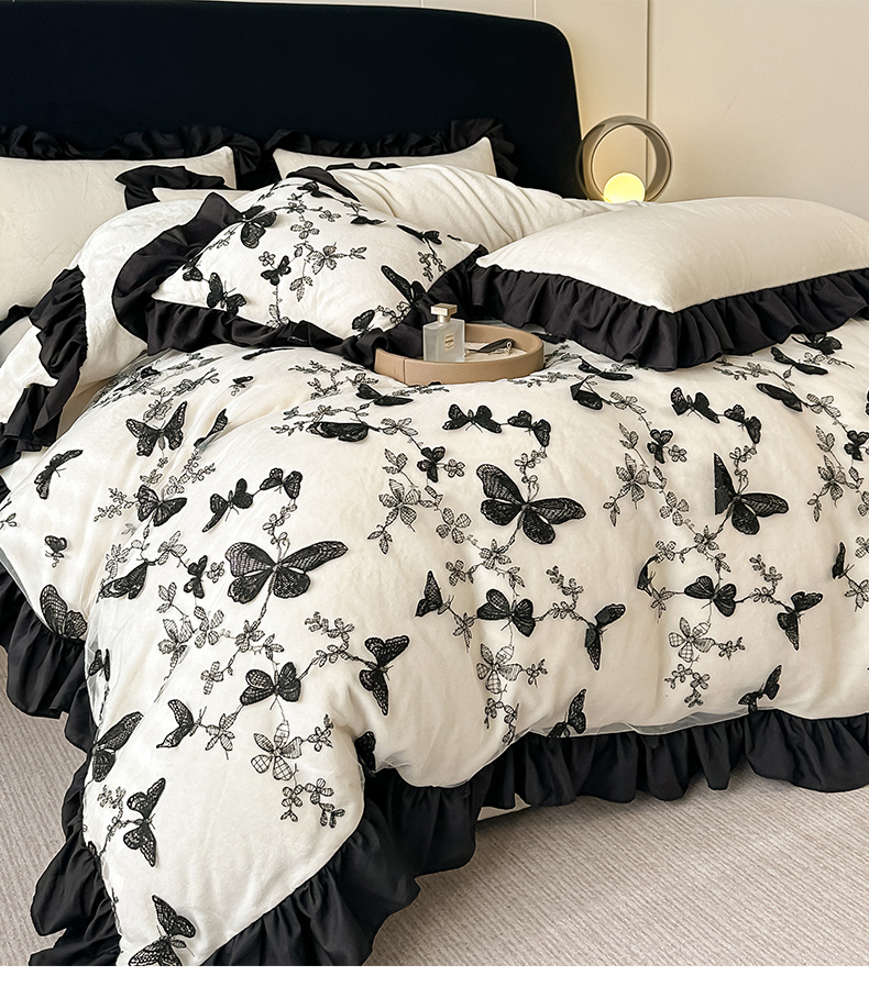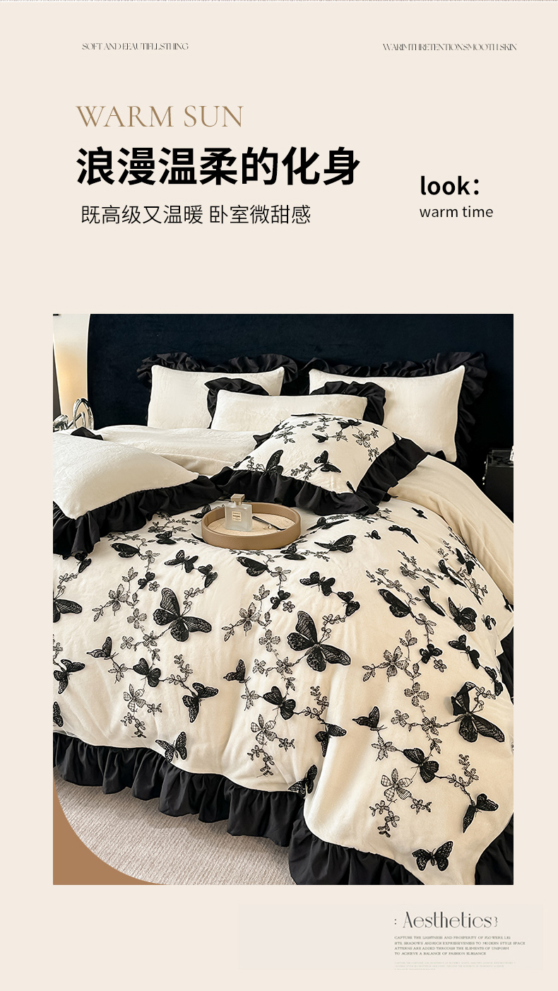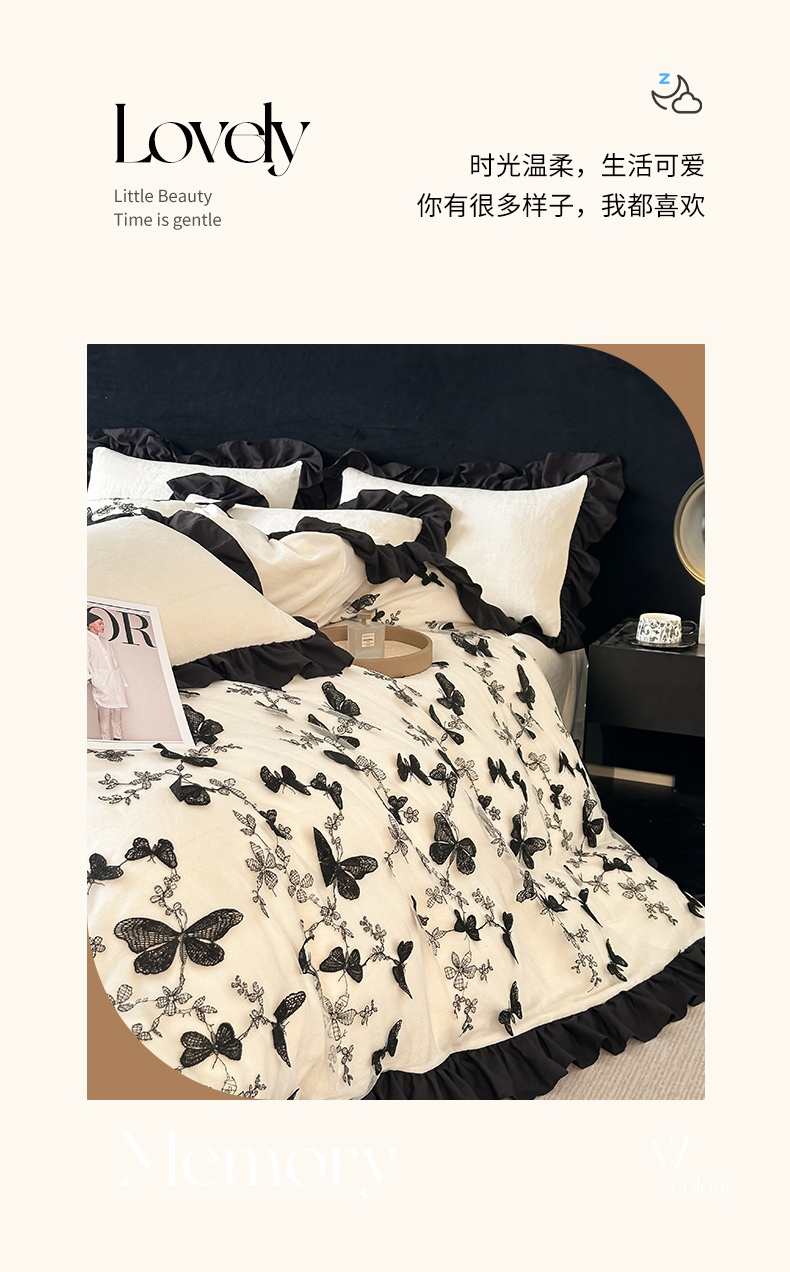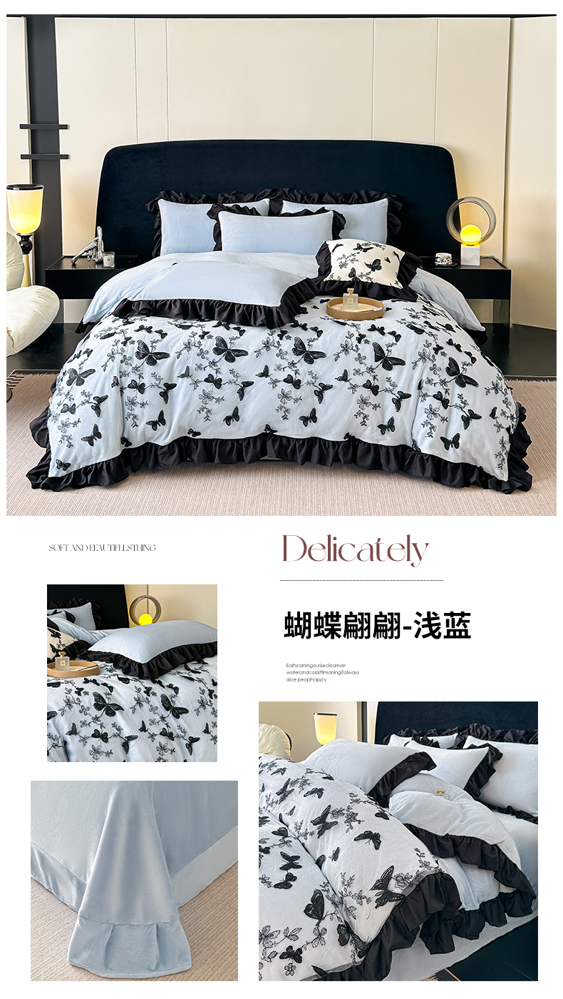 当前位置: 91家纺网 > 商品网购 > 床品套件 > 四件套 > 牛奶绒四件套 > (总)凯美家居 2025新款牛奶绒立体蕾丝刺绣四件套-蝴蝶翩翩