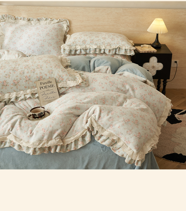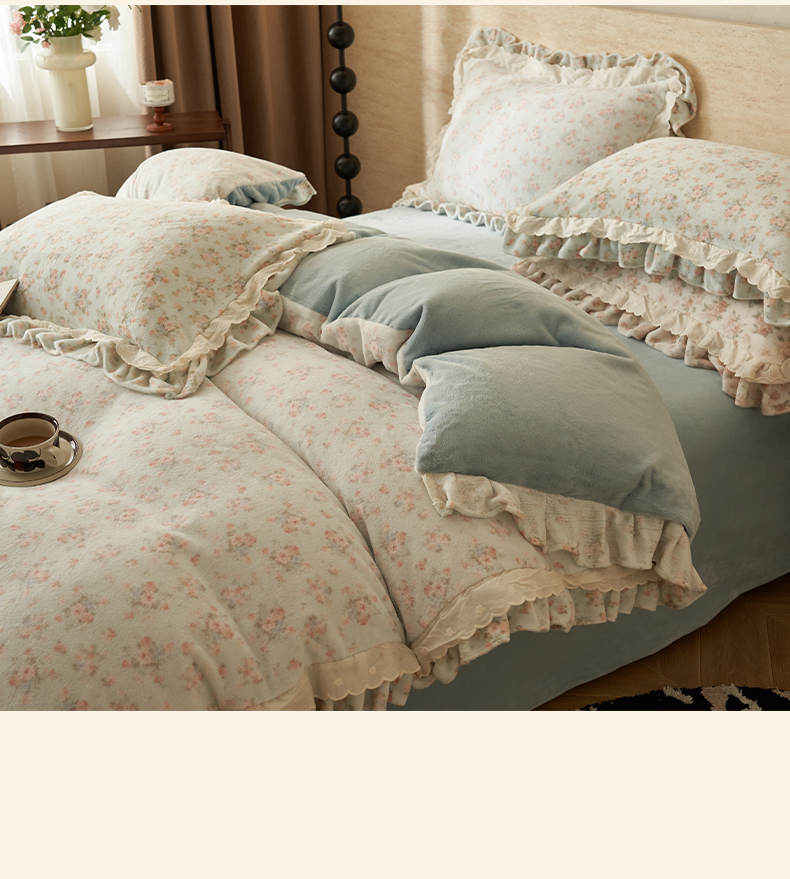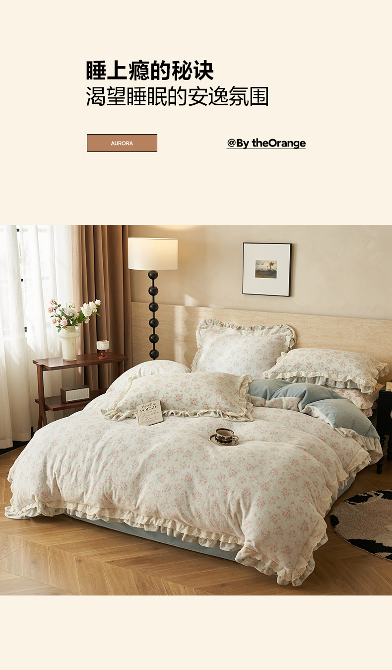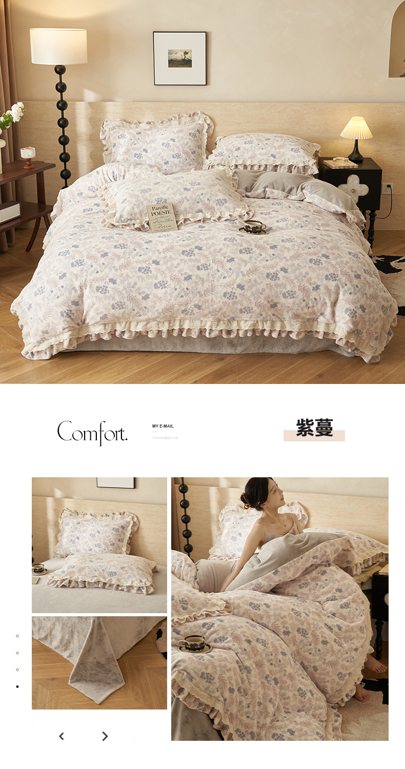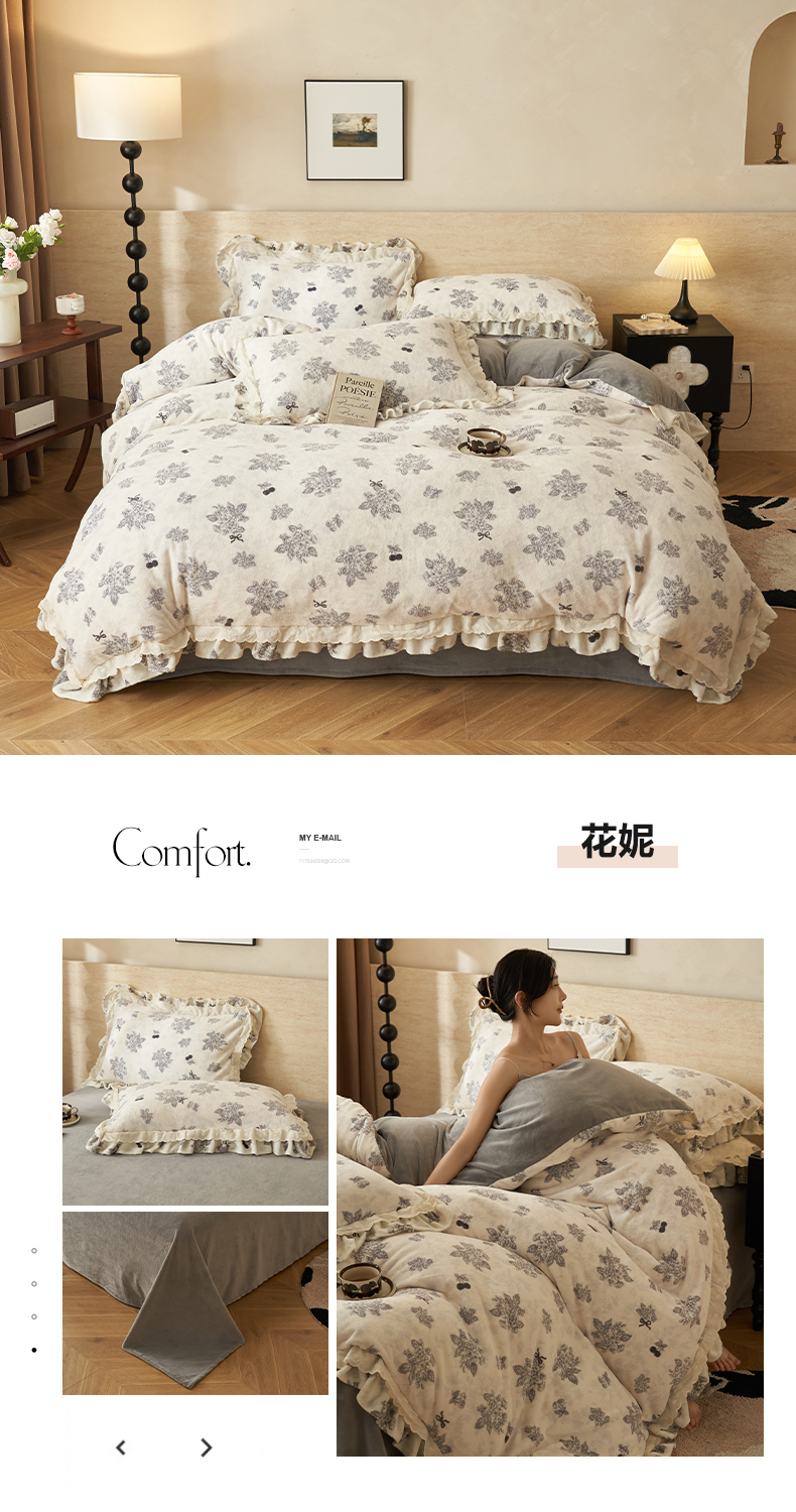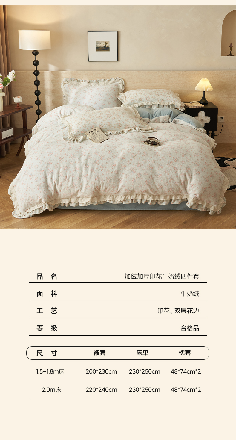当前位置: 91家纺网 > 商品网购 > 床品套件 > 四件套 > 牛奶绒四件套 > 晨曦家纺 2025新款加绒加厚230克少女风双层花边牛奶绒印花四件套 绒花瑶
