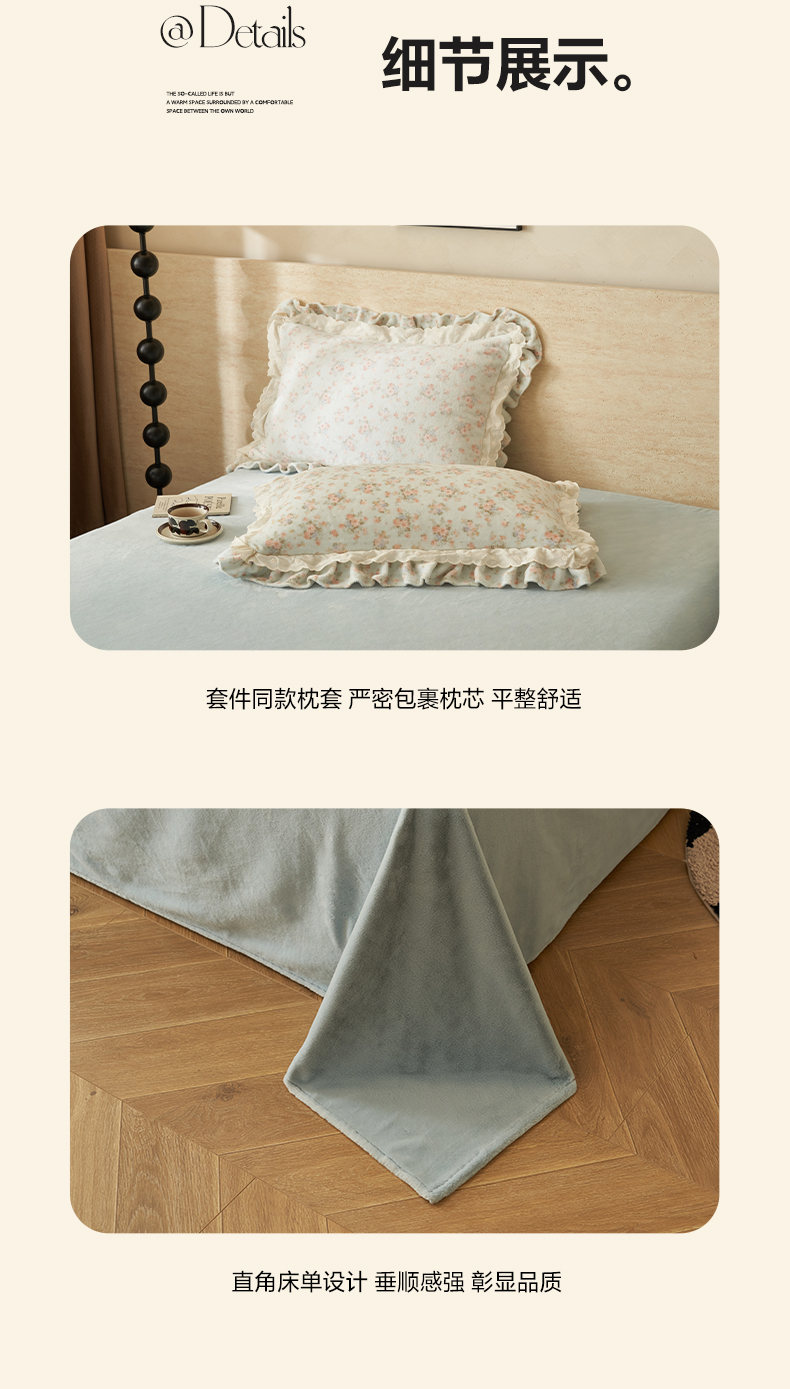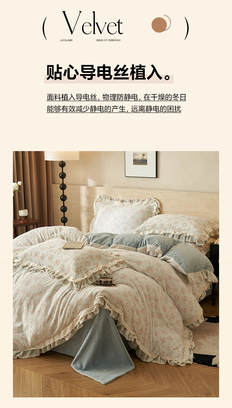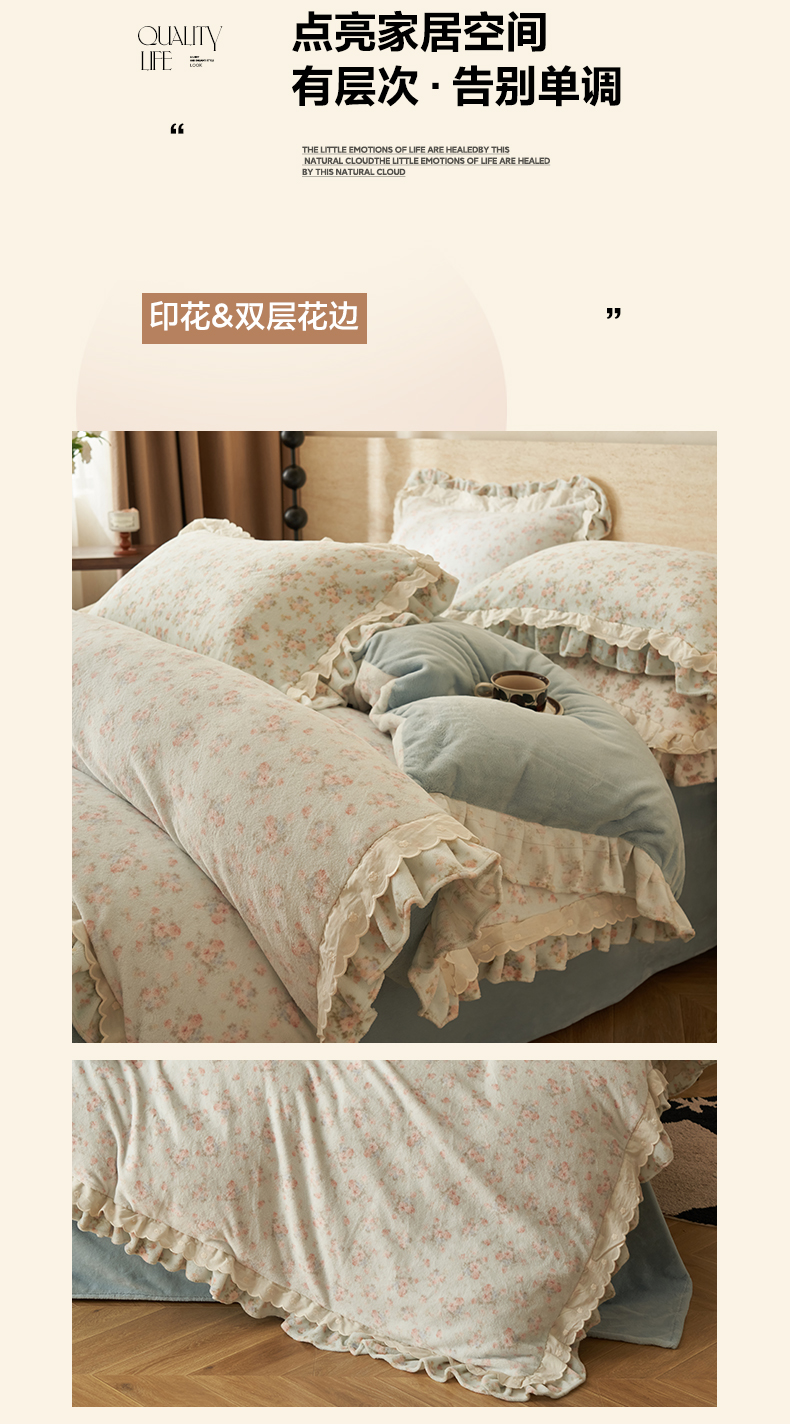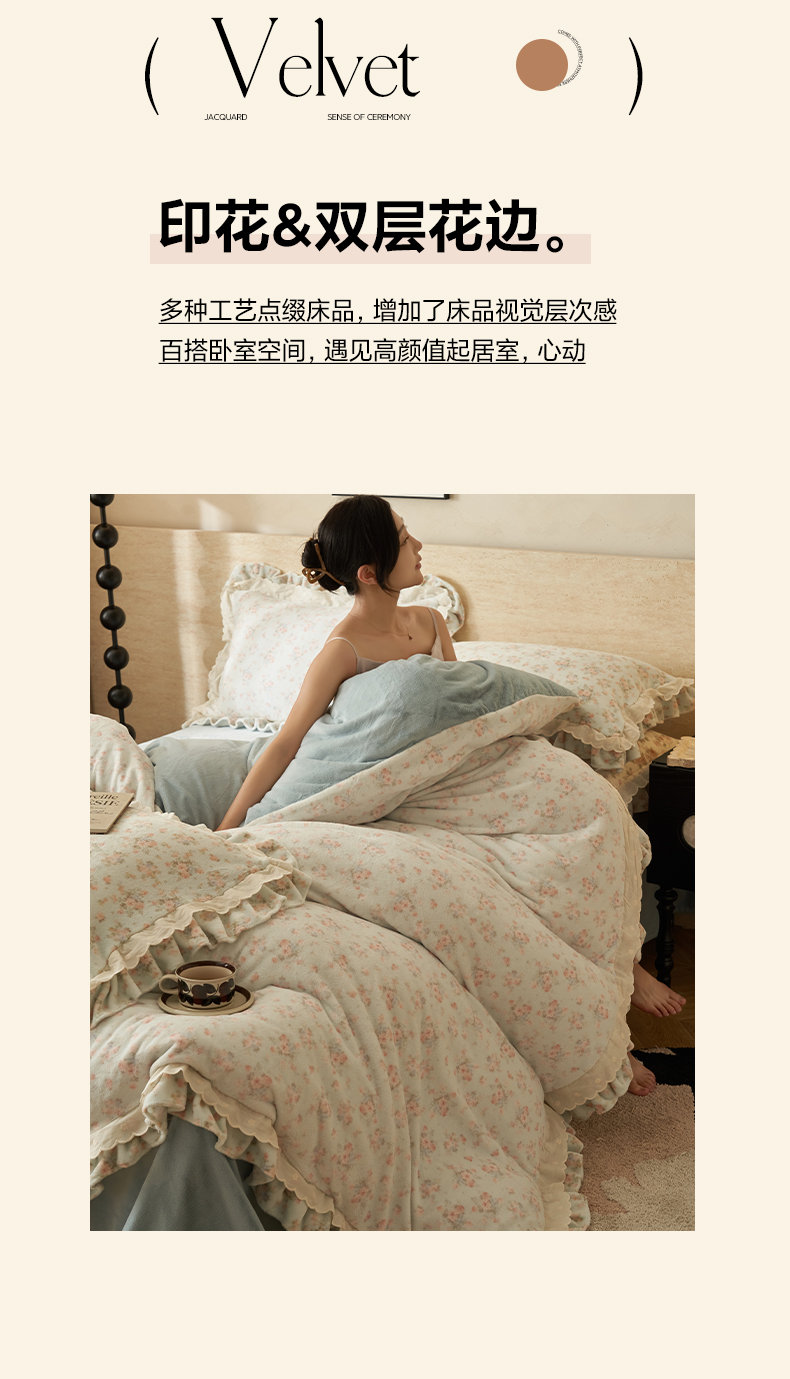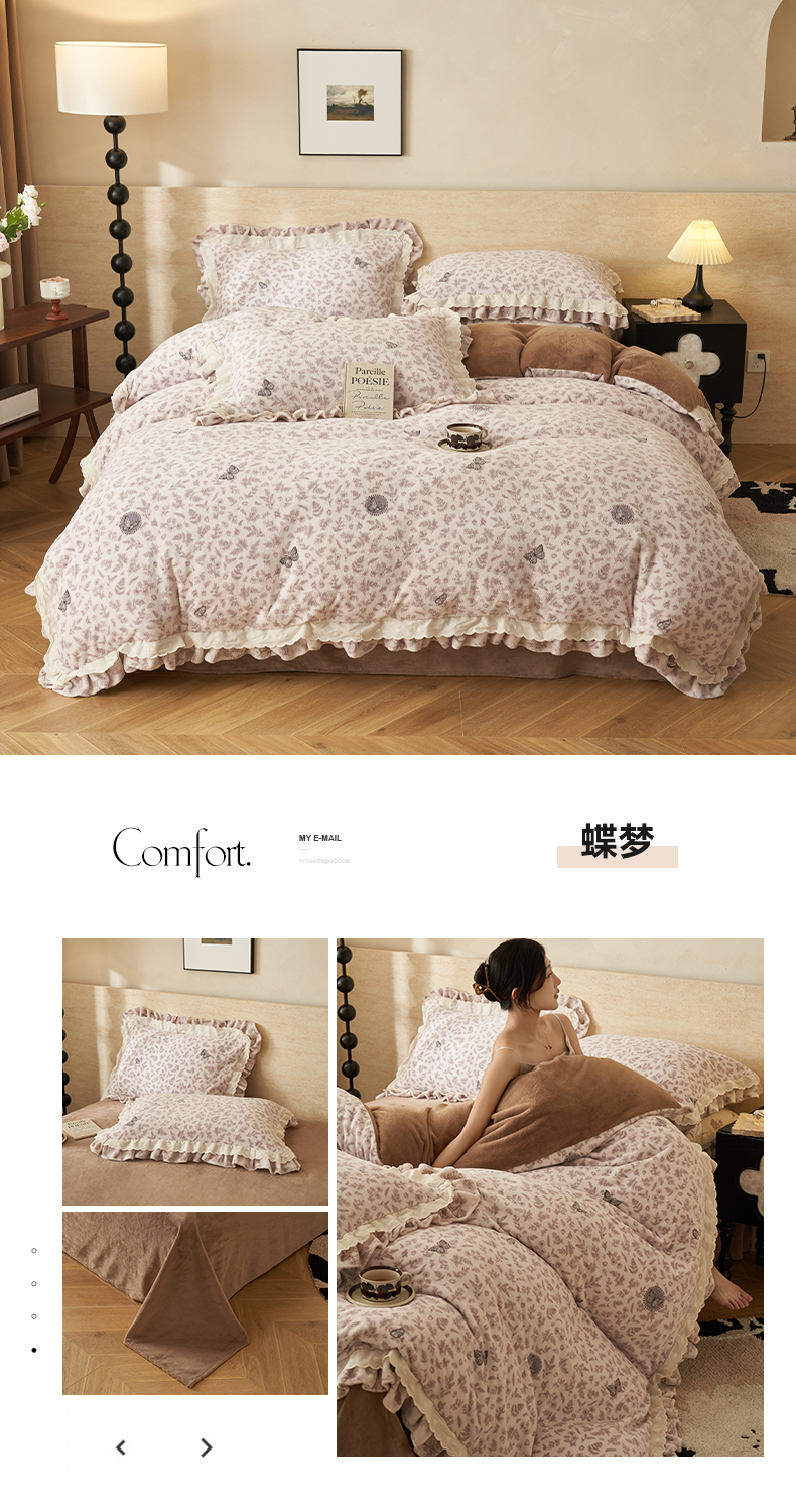 当前位置: 91家纺网 > 商品网购 > 床品套件 > 四件套 > 牛奶绒四件套 > 晨曦家纺 2025新款加绒加厚230克少女风双层花边牛奶绒印花四件套 绒花瑶
