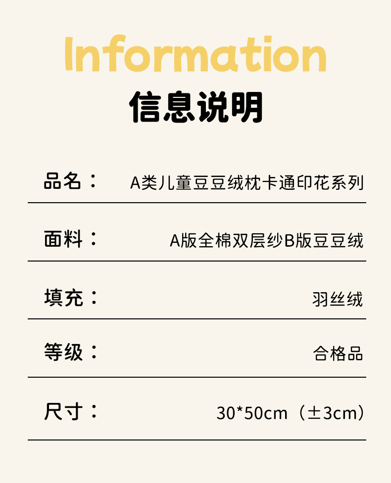 商品名称:织布人 2025新款枕芯A类全棉卡通豆豆枕双面可用儿童学生枕套+枕芯可拆洗 A类字母笑脸