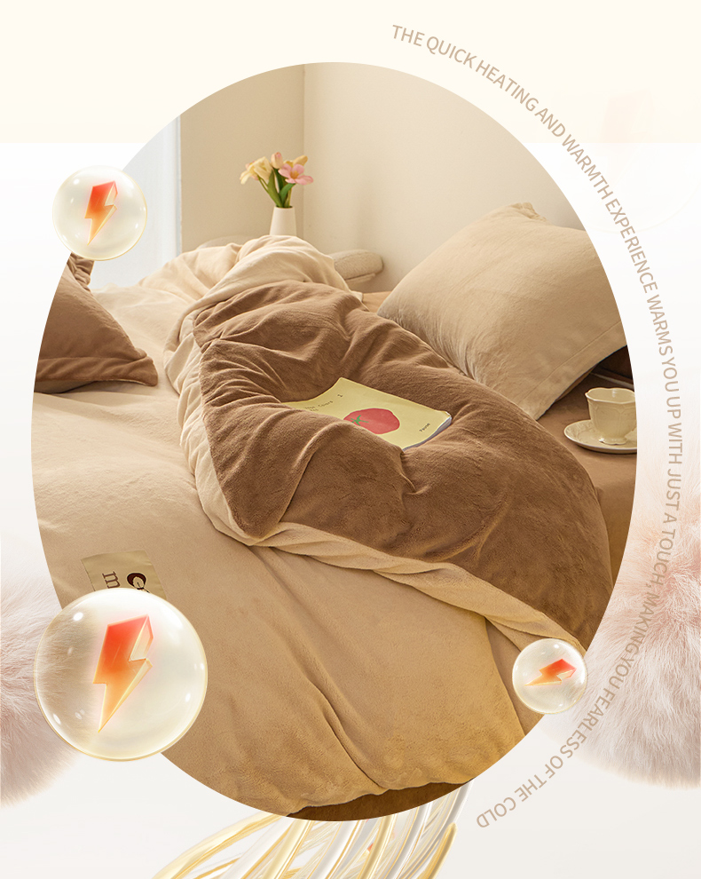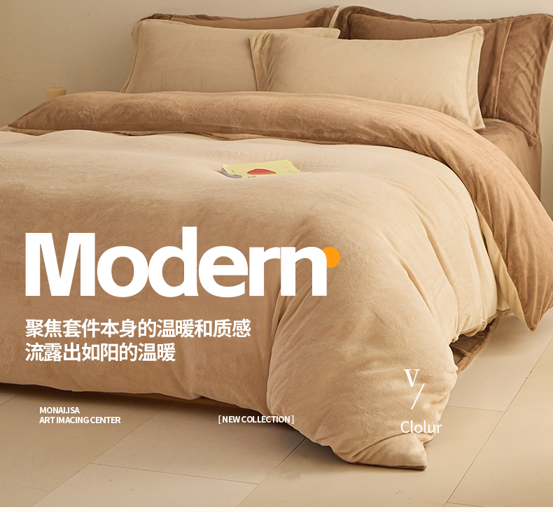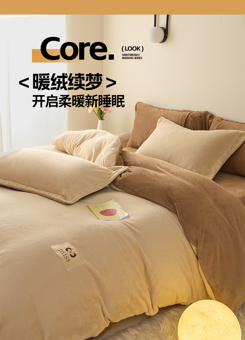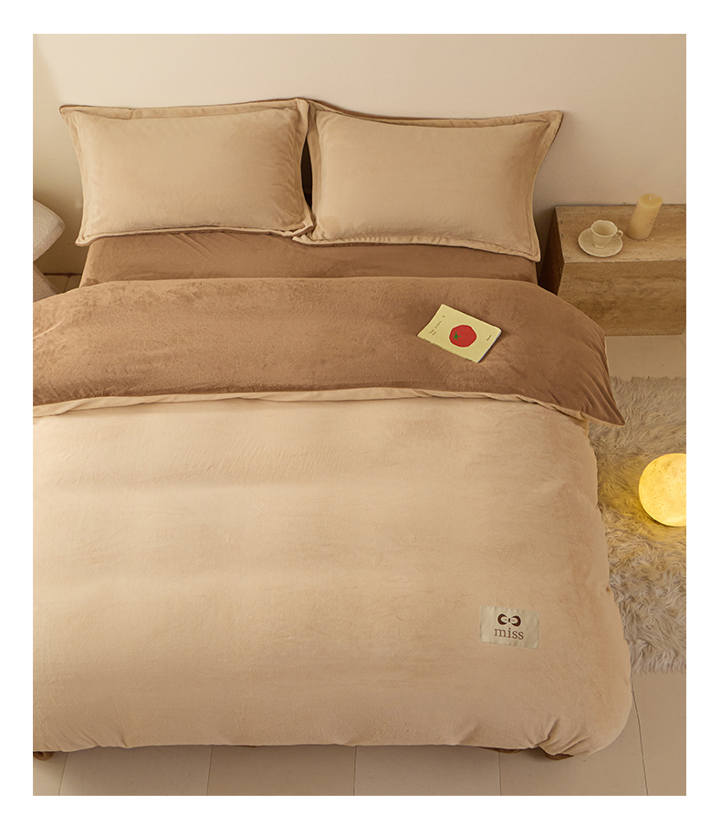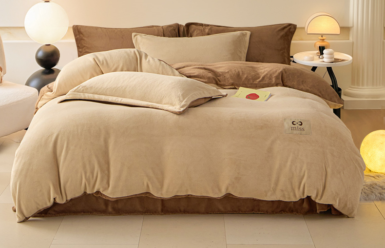 鑫琪莱家纺 2025新款高克重牛奶绒双拼四件套 杏仁奶咖