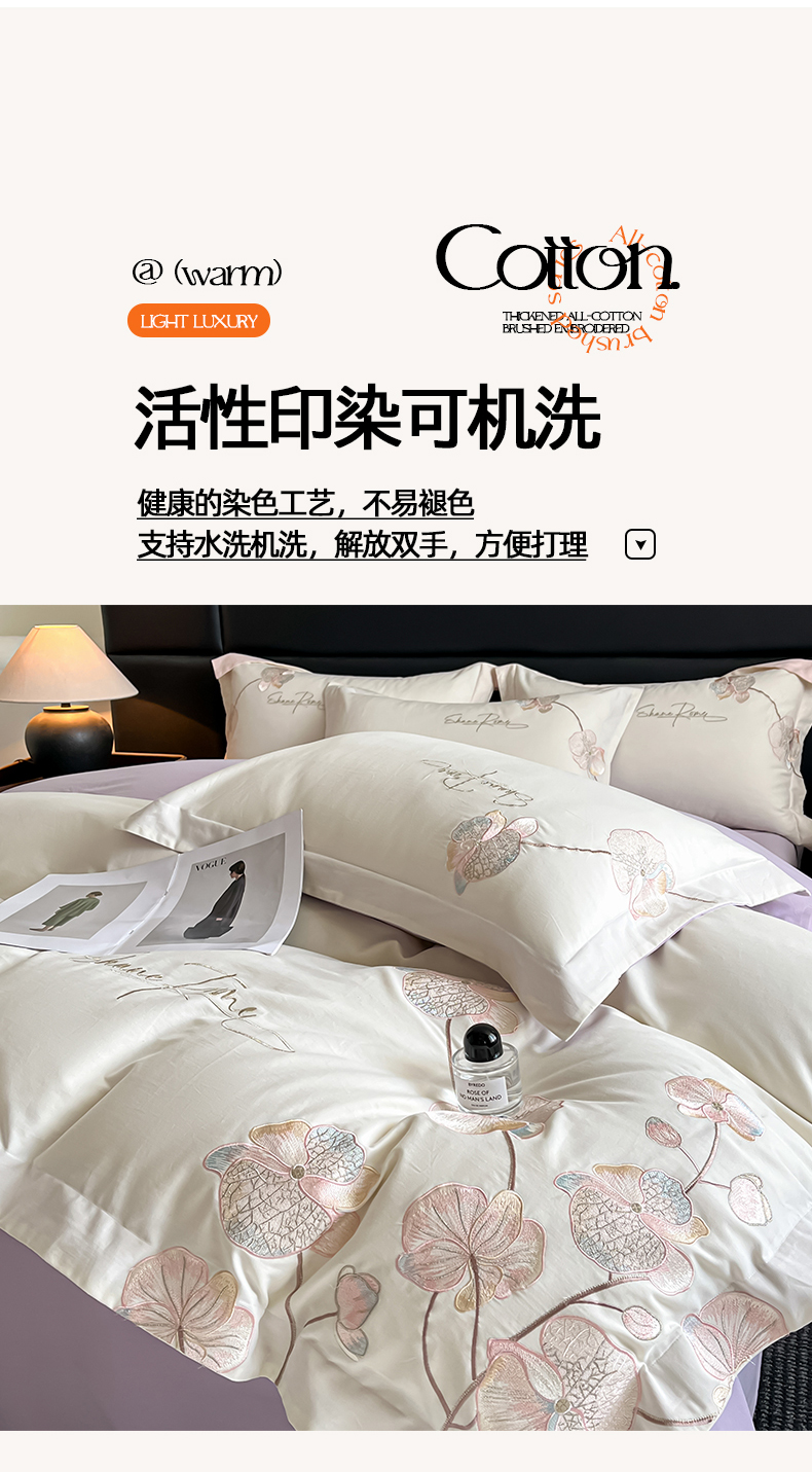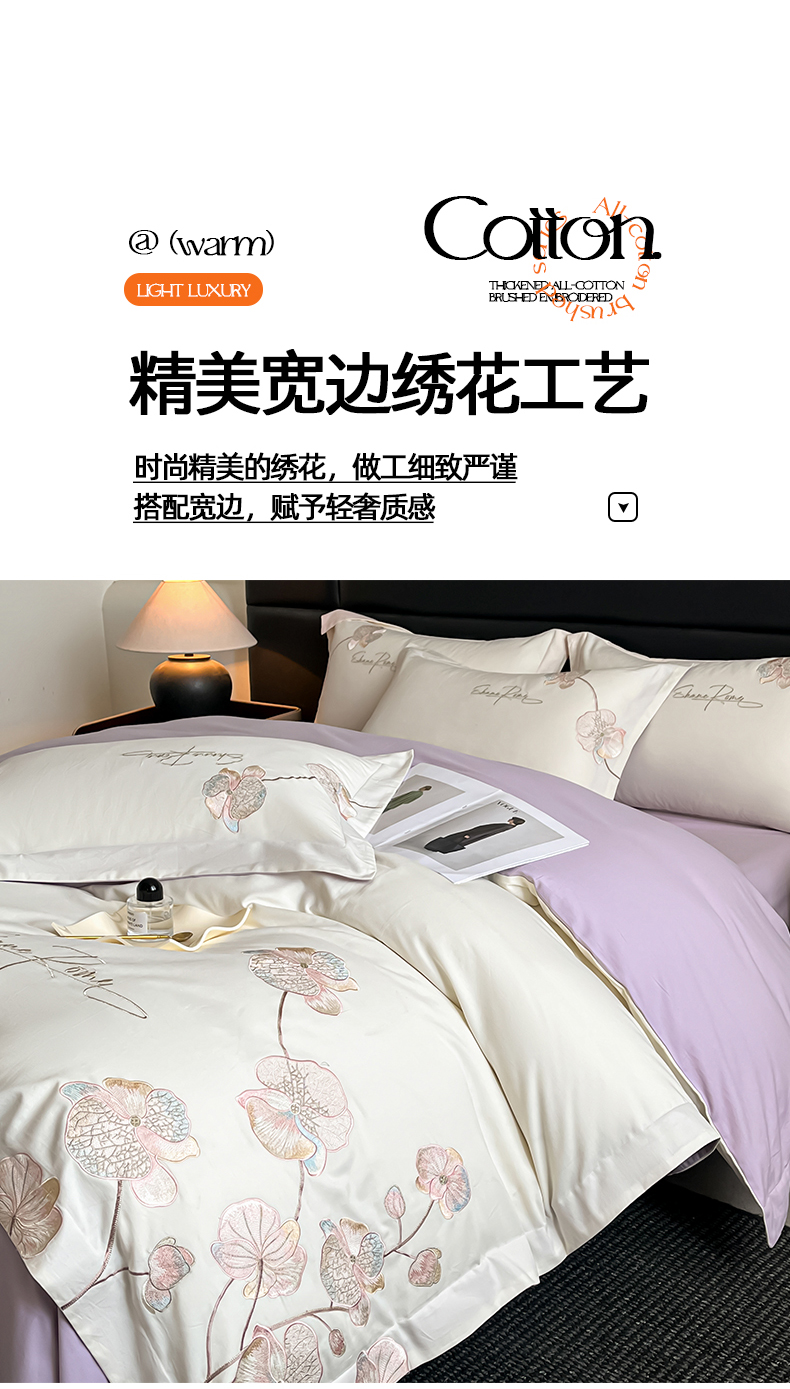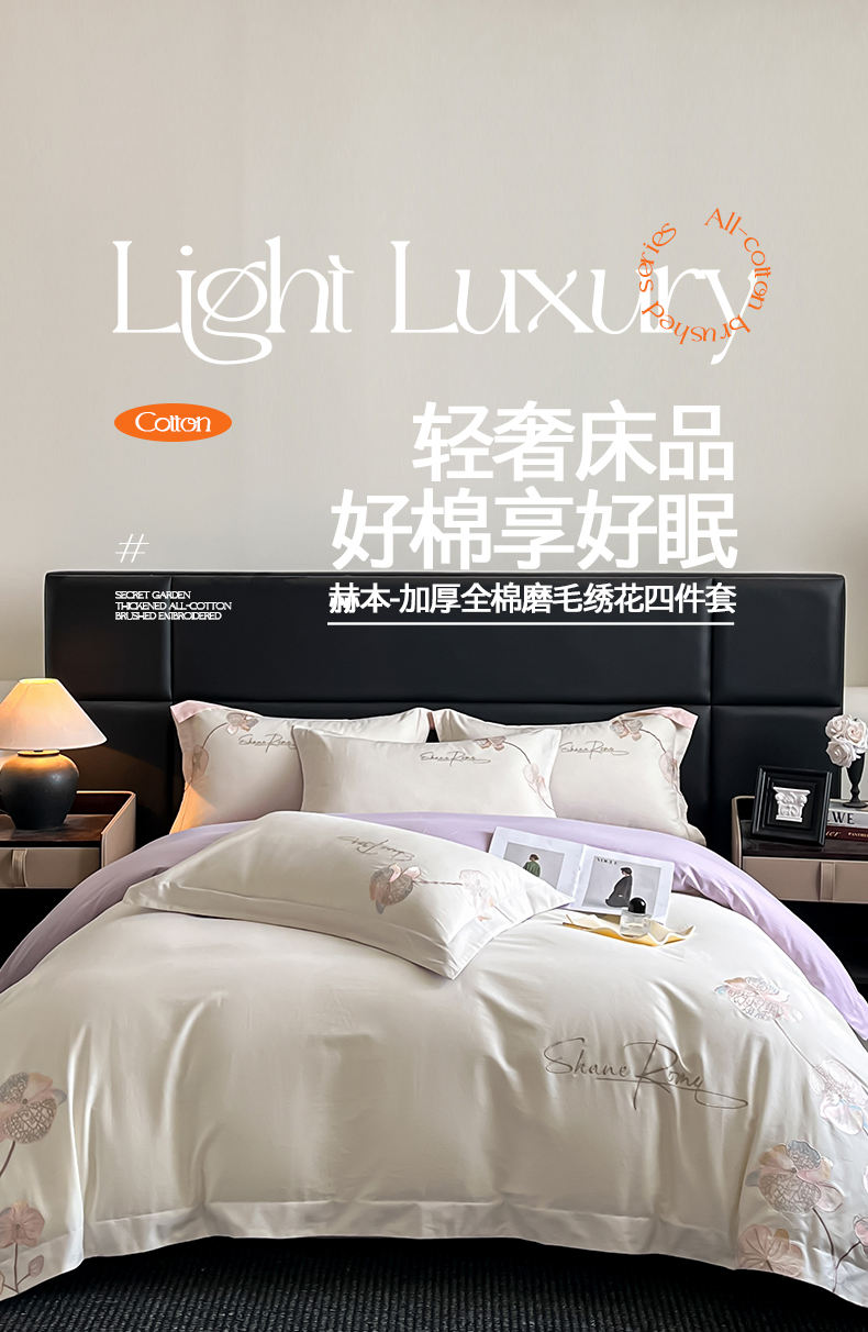 当前位置: 91家纺网 > 商品网购 > 床品套件 > 四件套 > 磨毛活性四件套 > 置顶家纺 2025新款全棉加厚磨毛刺绣秋冬系列四件套-赫本 赫本-奶白+香芋紫