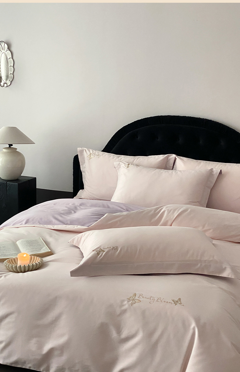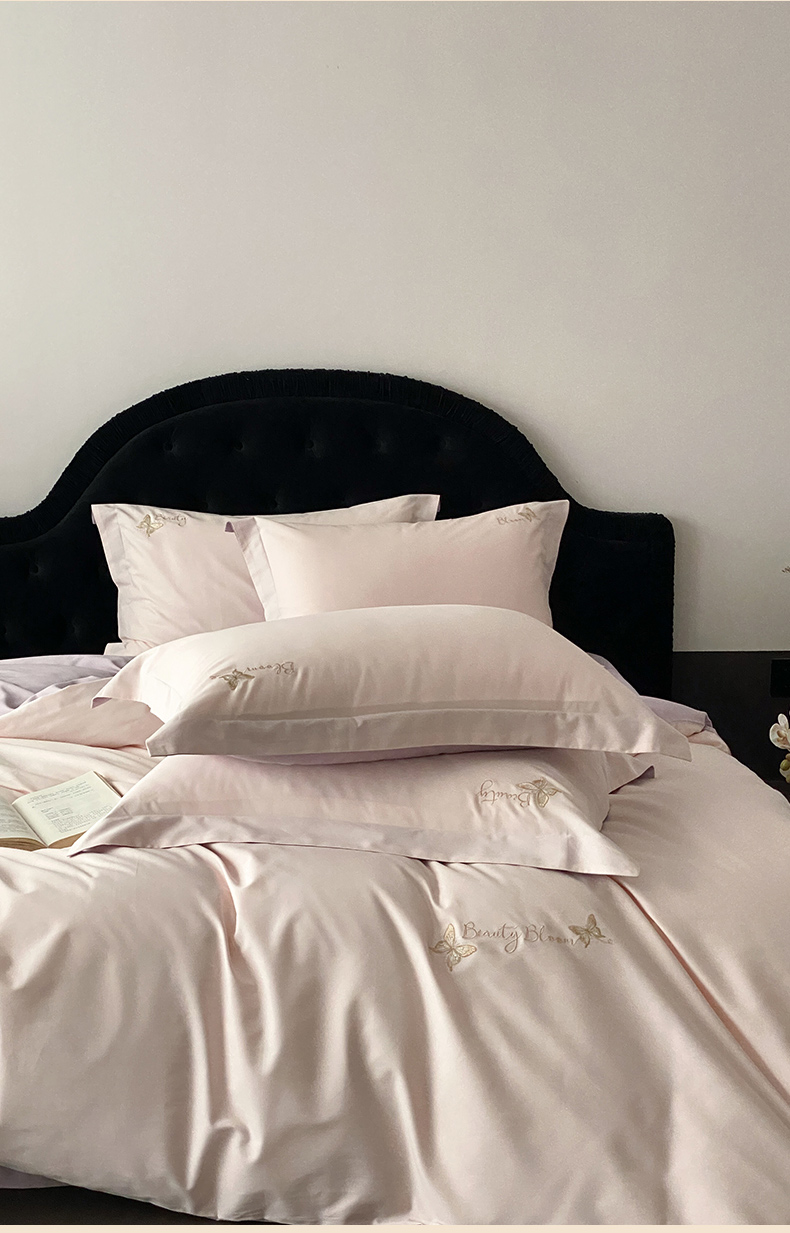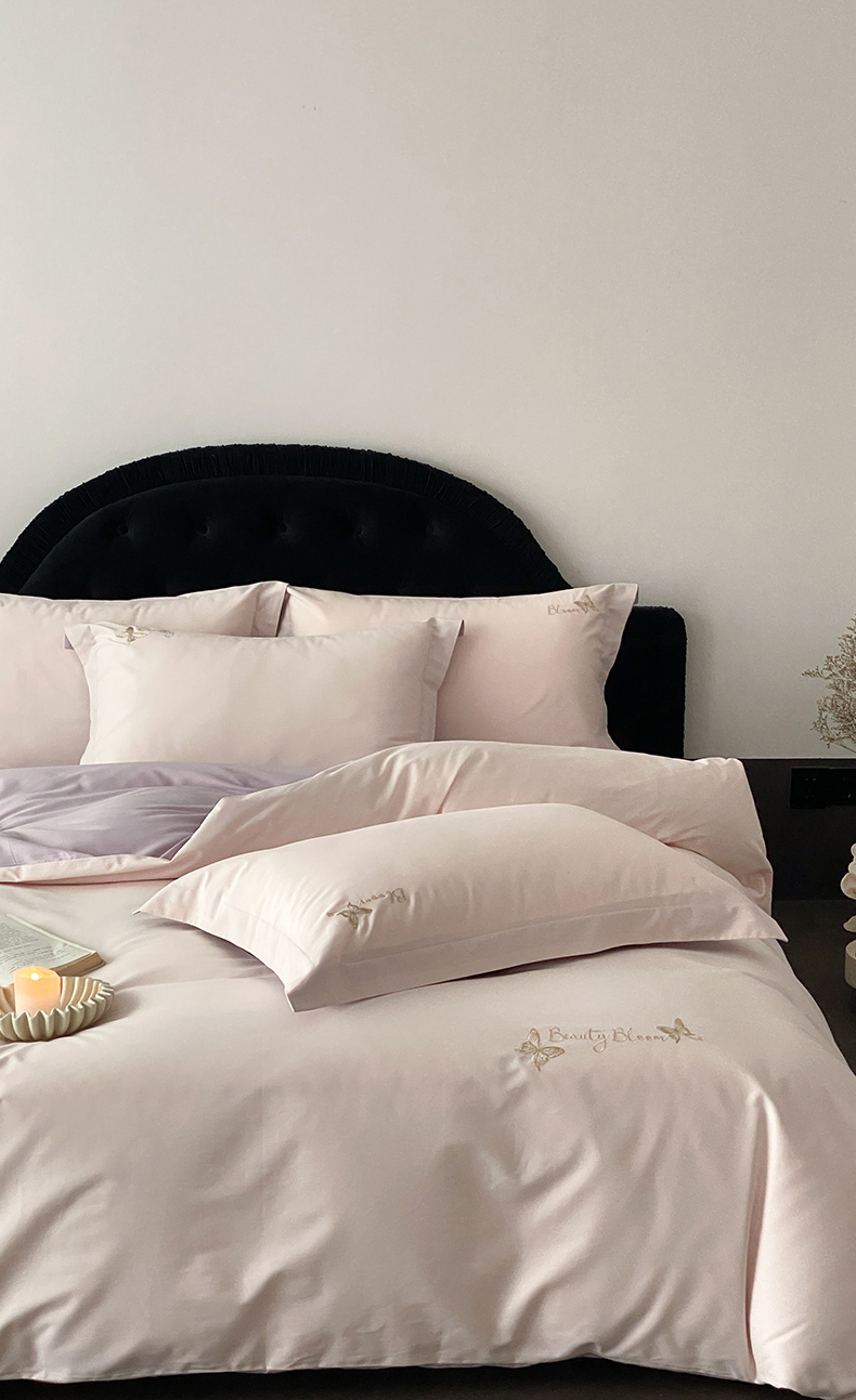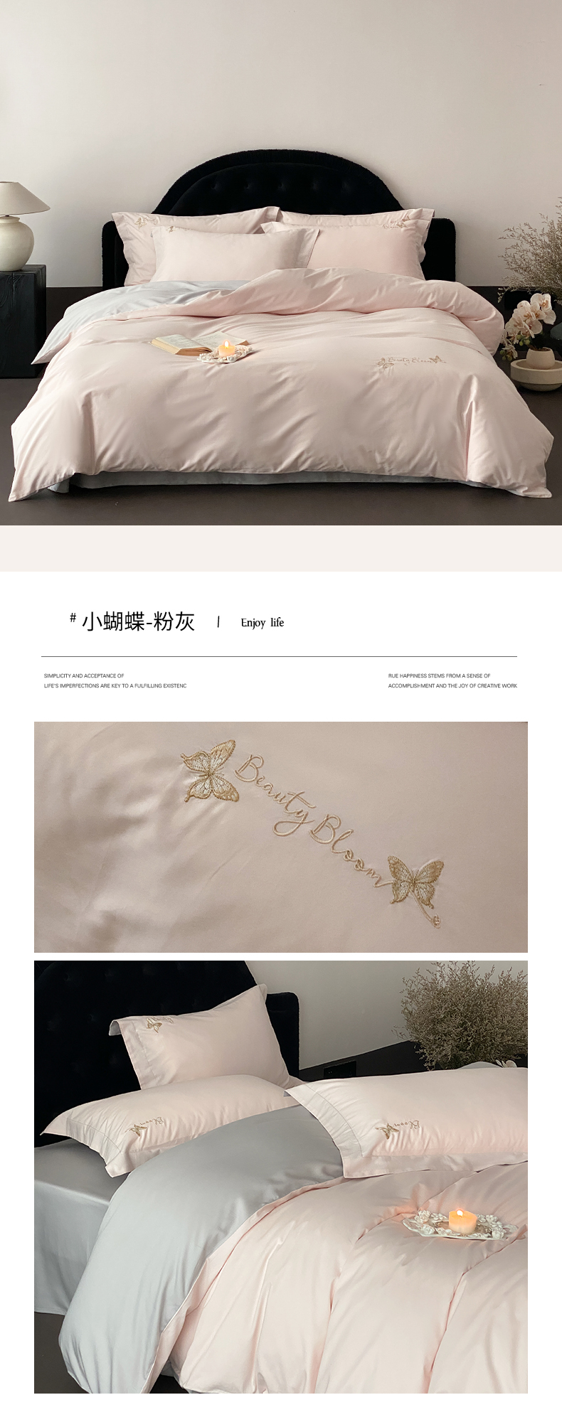 当前位置: 91家纺网 > 商品网购 > 床品套件 > 四件套 > 全棉普通四件套 > 云栖家居 2025秋冬新款50支纯色双拼加厚全棉磨毛被套刺绣100S纯棉四件套-小蝴蝶系列 粉紫