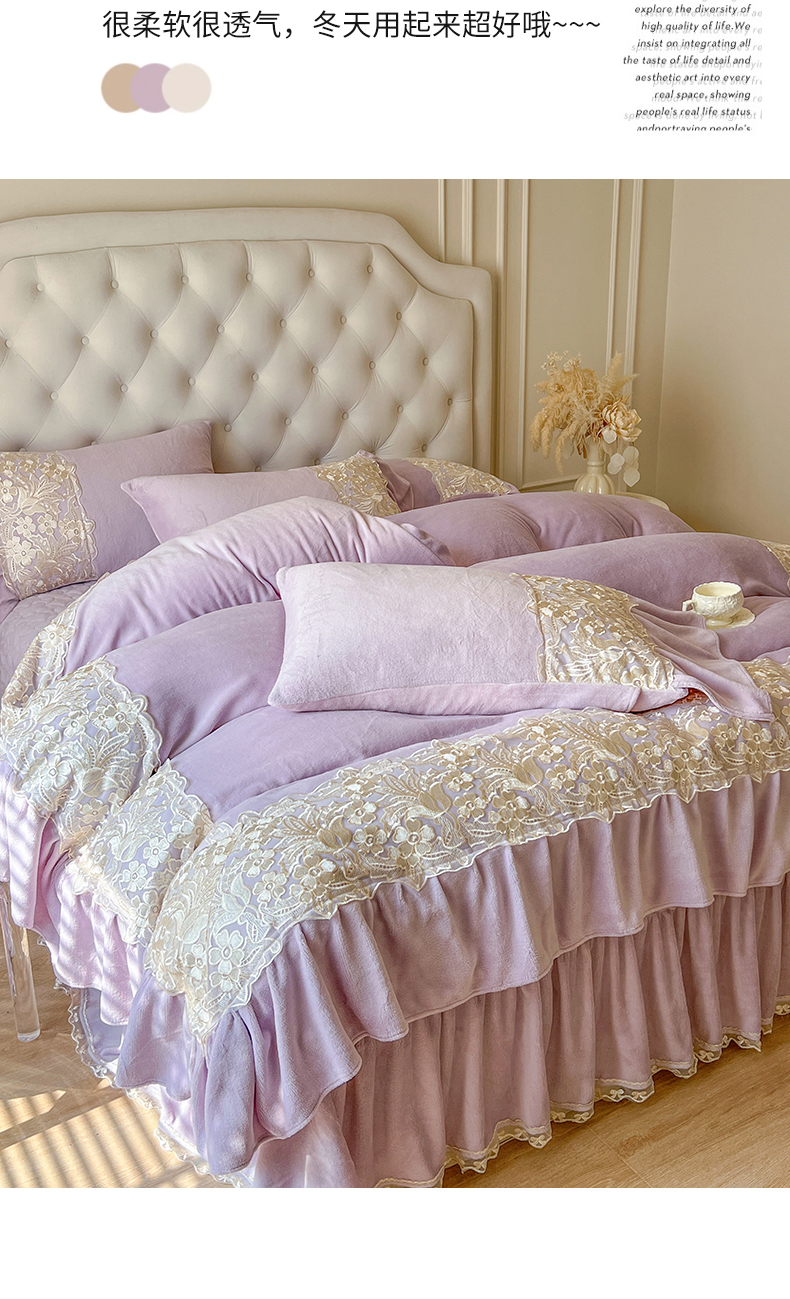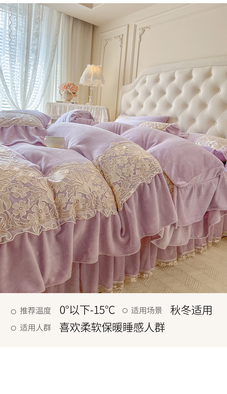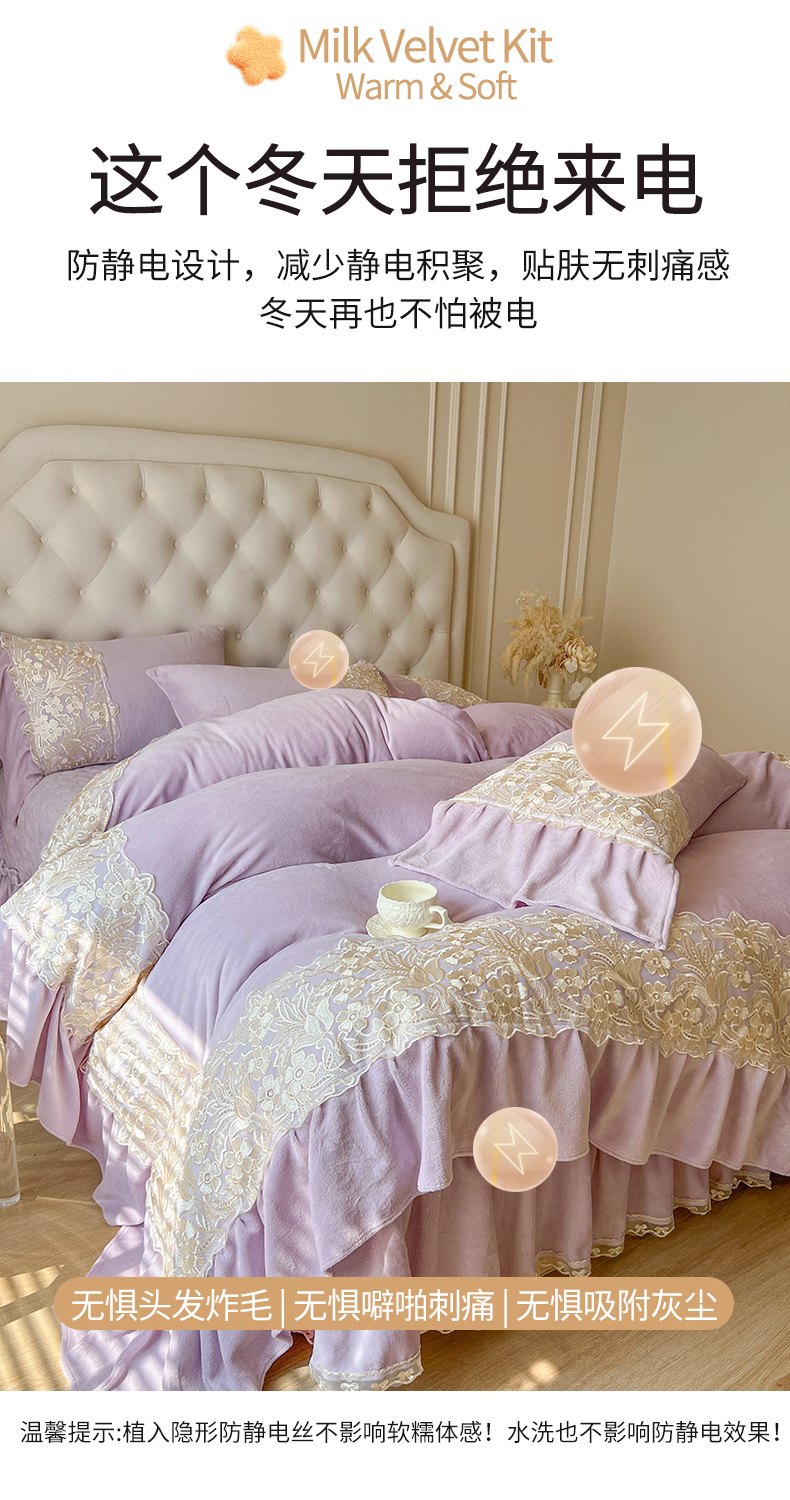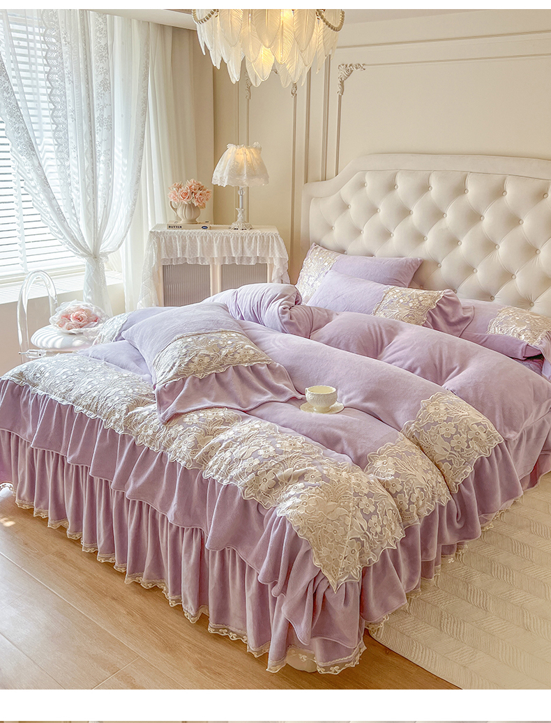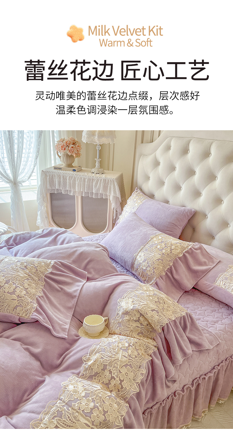 商品名称:网红馆(ck家纺) 2025新款牛奶绒蕾丝花边倾城系列四件套 倾城-紫