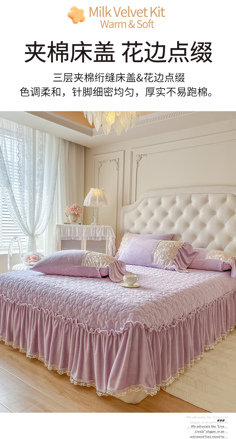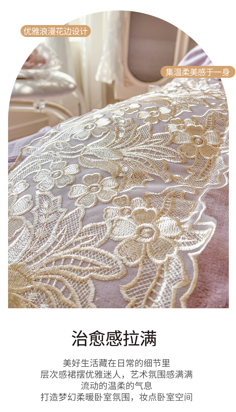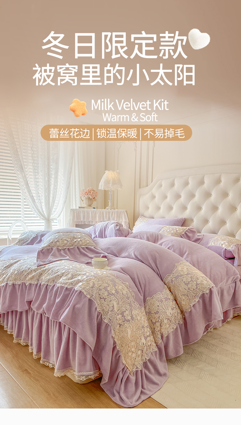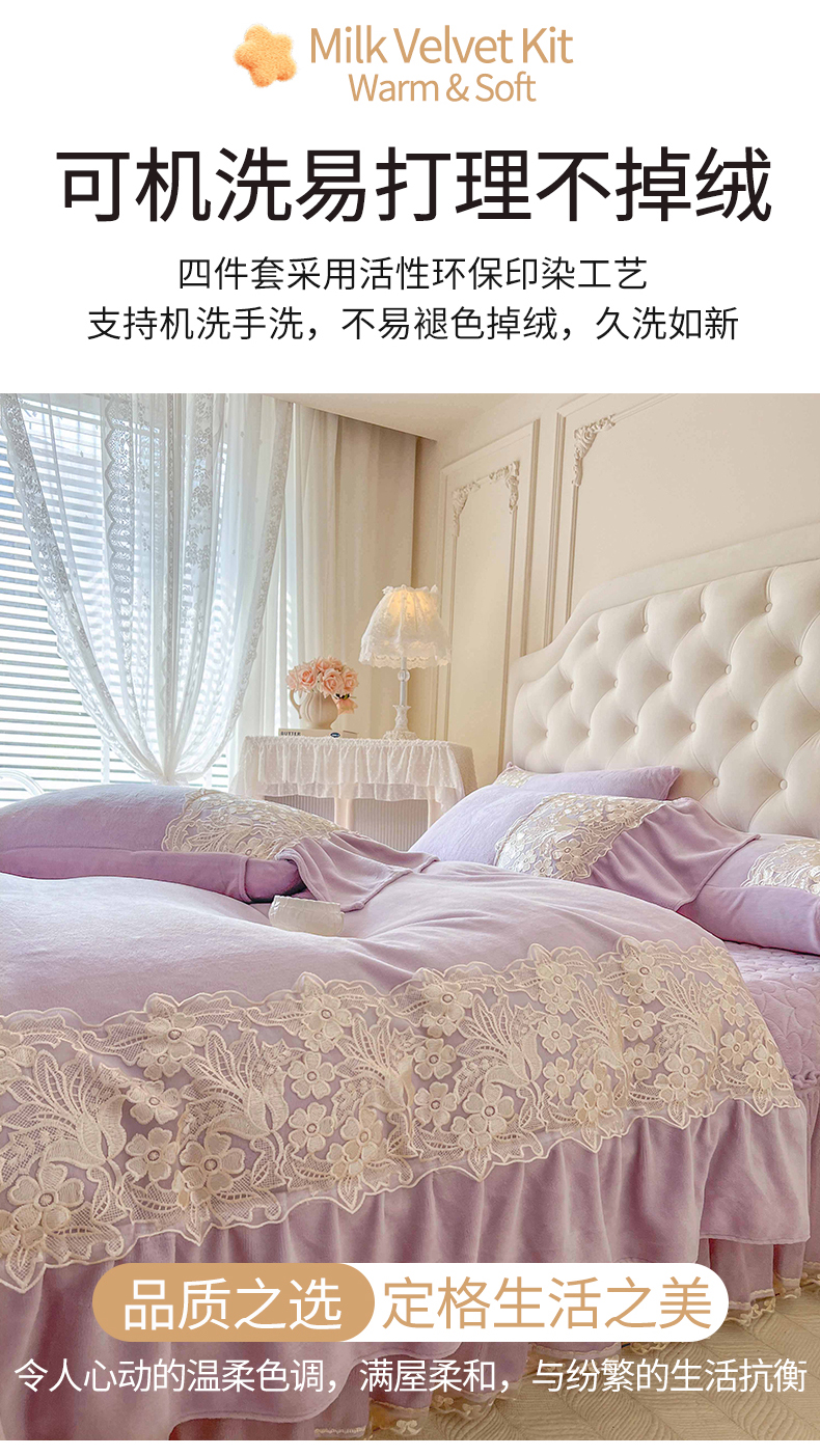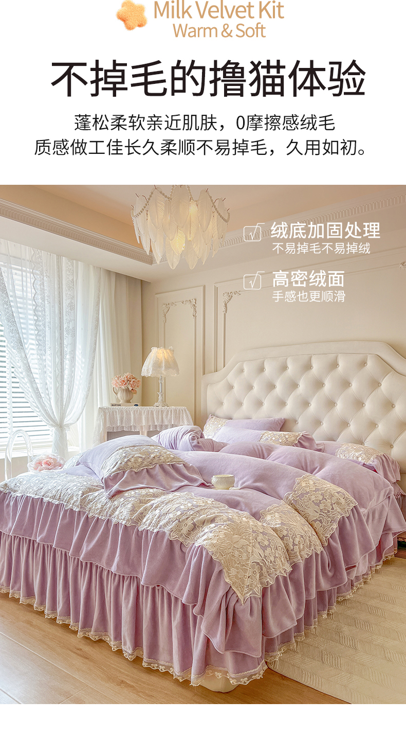 商品名称:网红馆(ck家纺) 2025新款牛奶绒蕾丝花边倾城系列四件套 倾城-紫