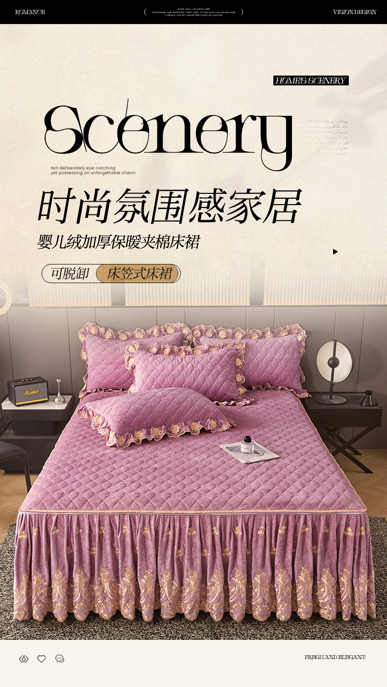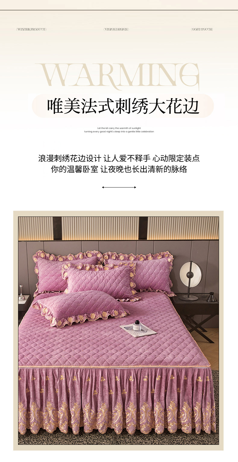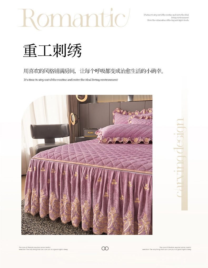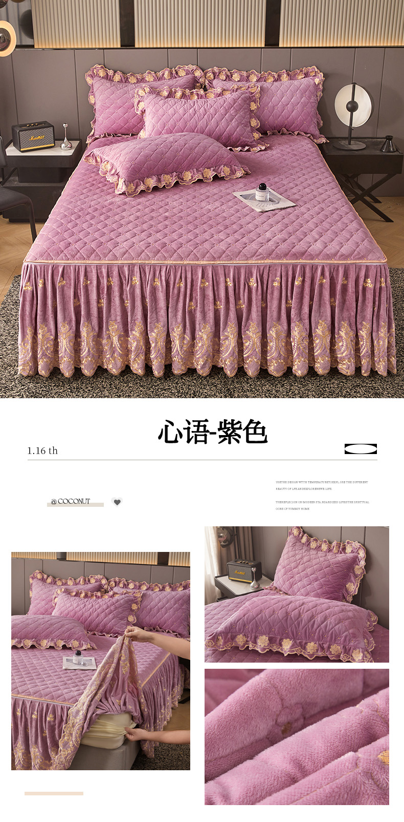 • 91家纺网 家纺一手货源 找家纺 罗艺轩 2025新款婴儿绒加厚保暖床裙式三件套-心语 心语-紫色
