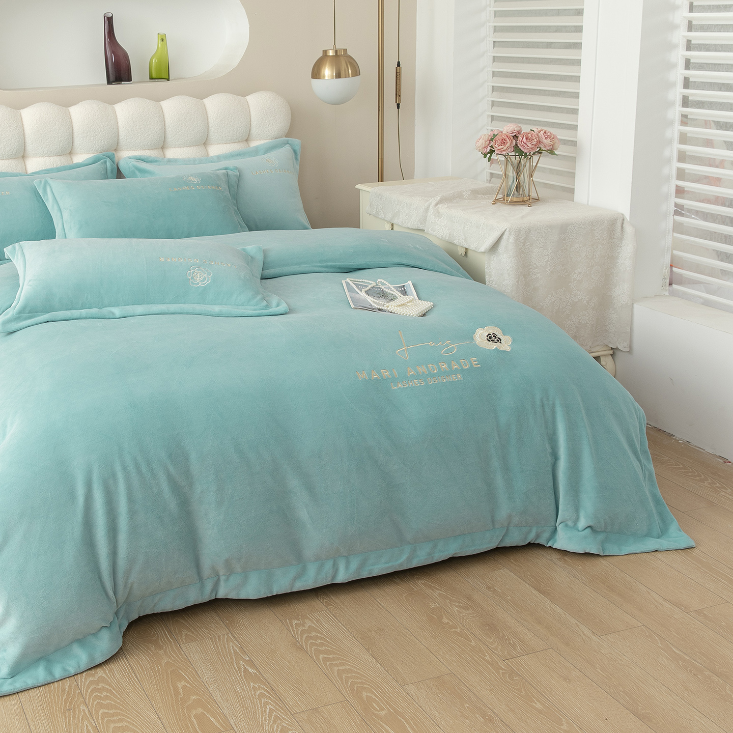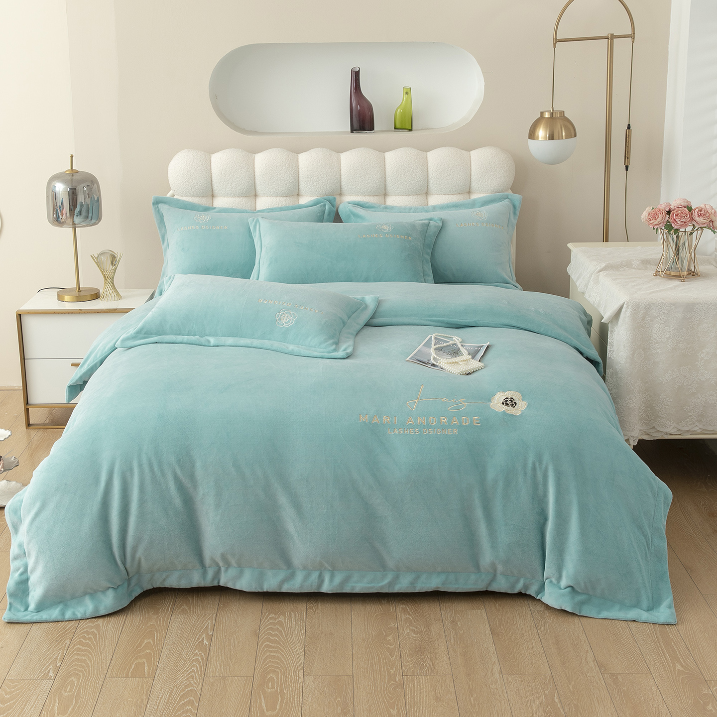 贝尔 2025新款纯色高克重牛奶绒刺绣四件套-羽魅 羽魅-浅绿,羽魅-浅绿