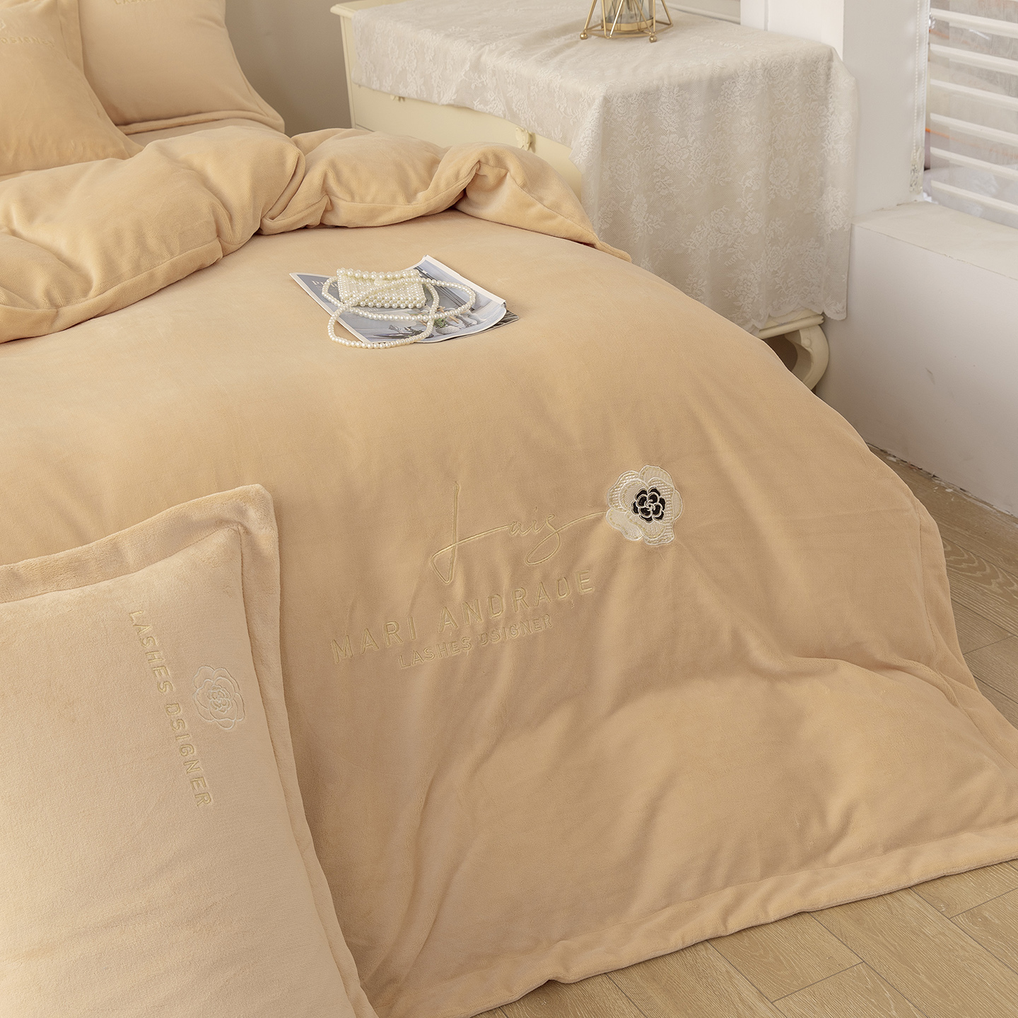 贝尔 2025新款纯色高克重牛奶绒刺绣四件套-羽魅 羽魅-豆沙,羽魅-豆沙