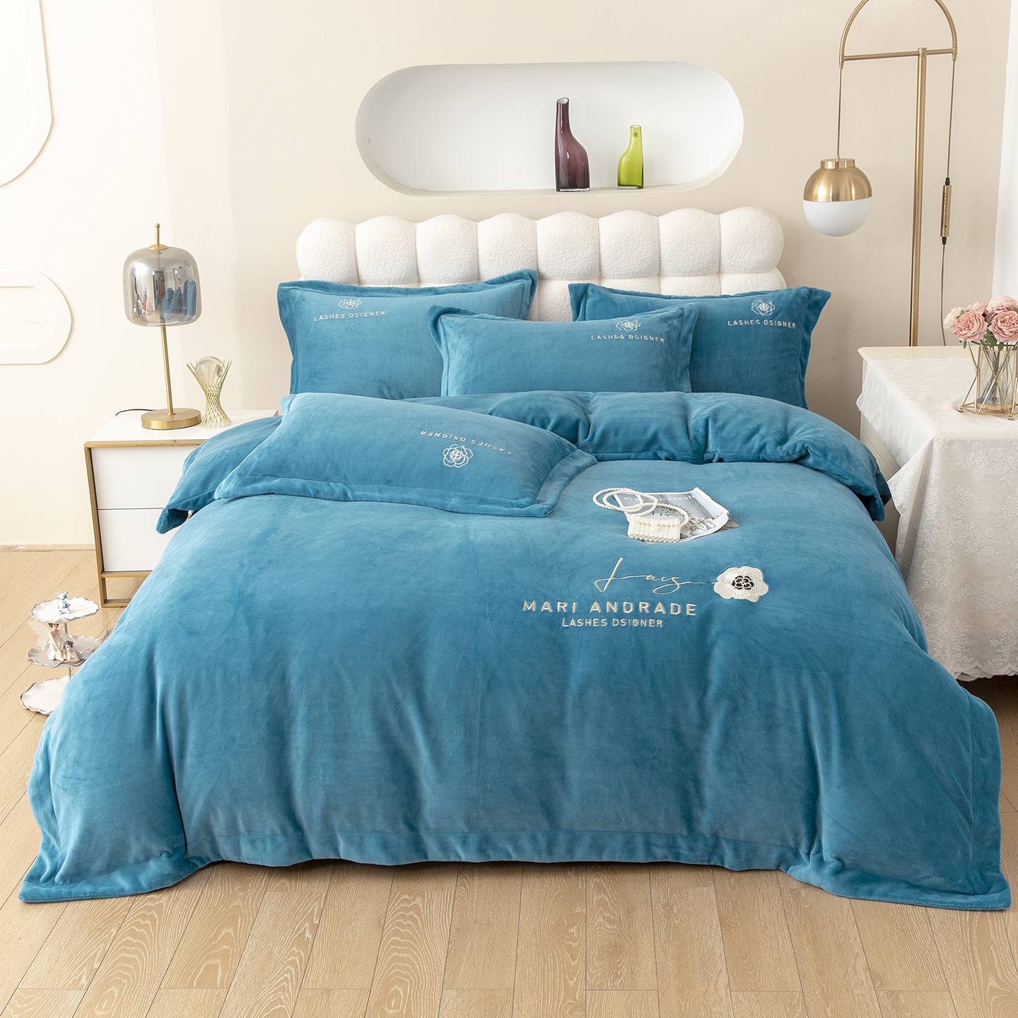 贝尔 2025新款纯色高克重牛奶绒刺绣四件套-羽魅 羽魅-蓝色,羽魅-蓝色