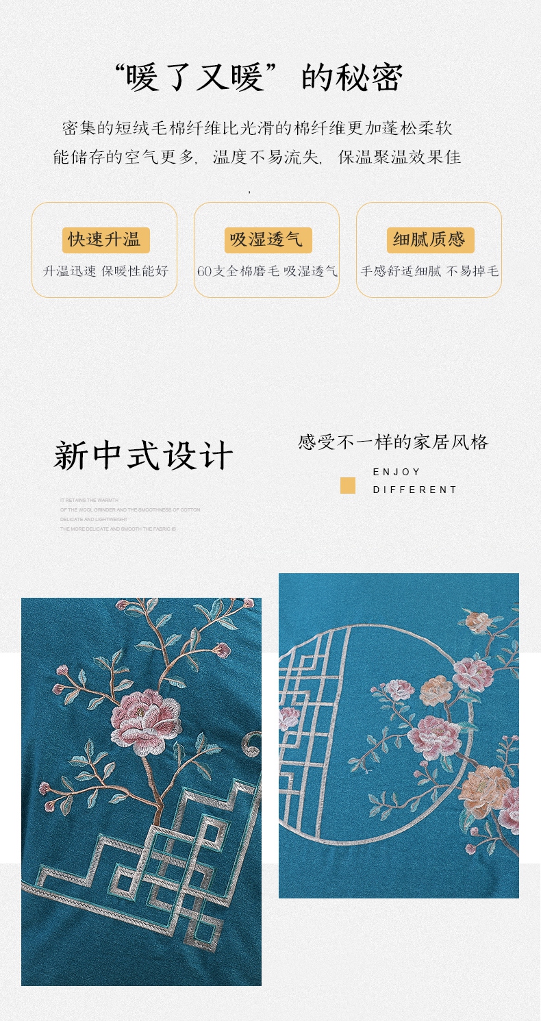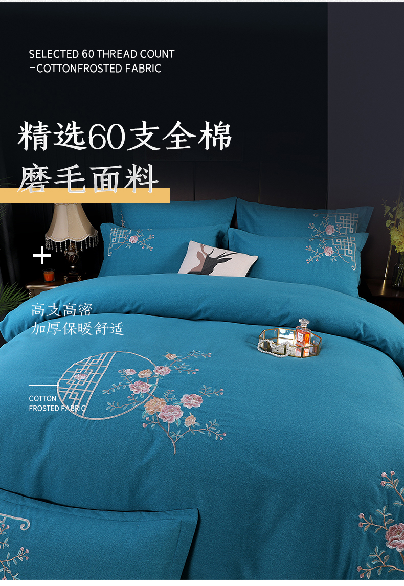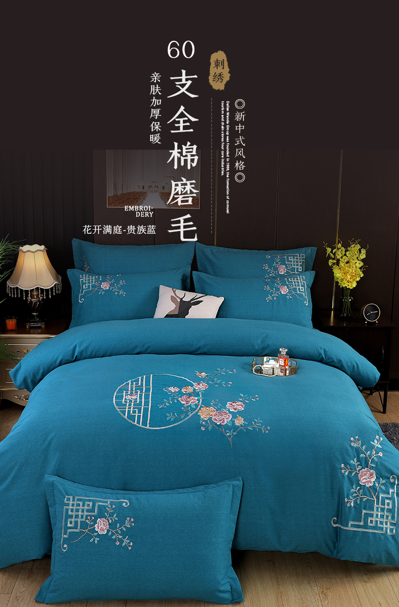 商品名称:浩情国际婚庆供货中心 2026新款秋冬60S高端全棉刺绣磨毛系列 花开满庭-贵族蓝