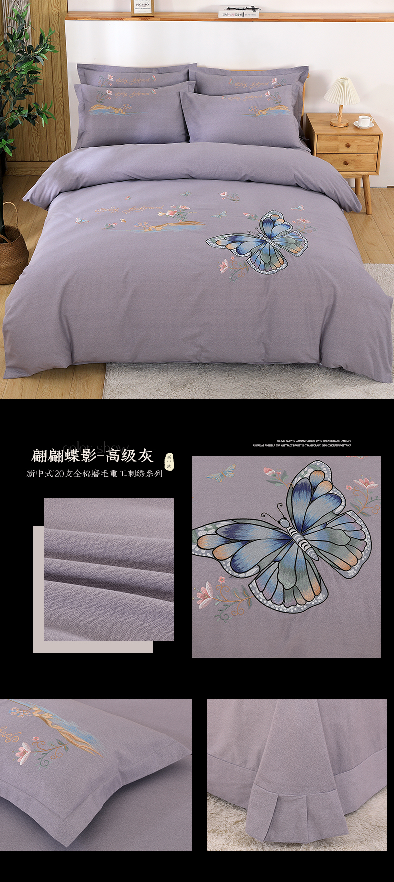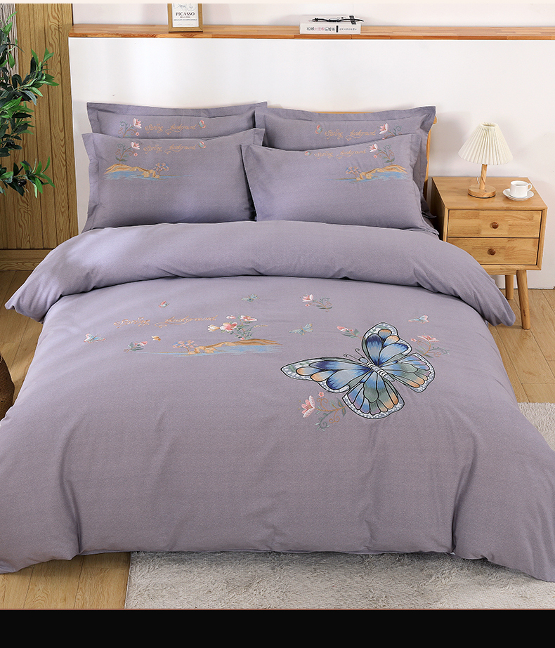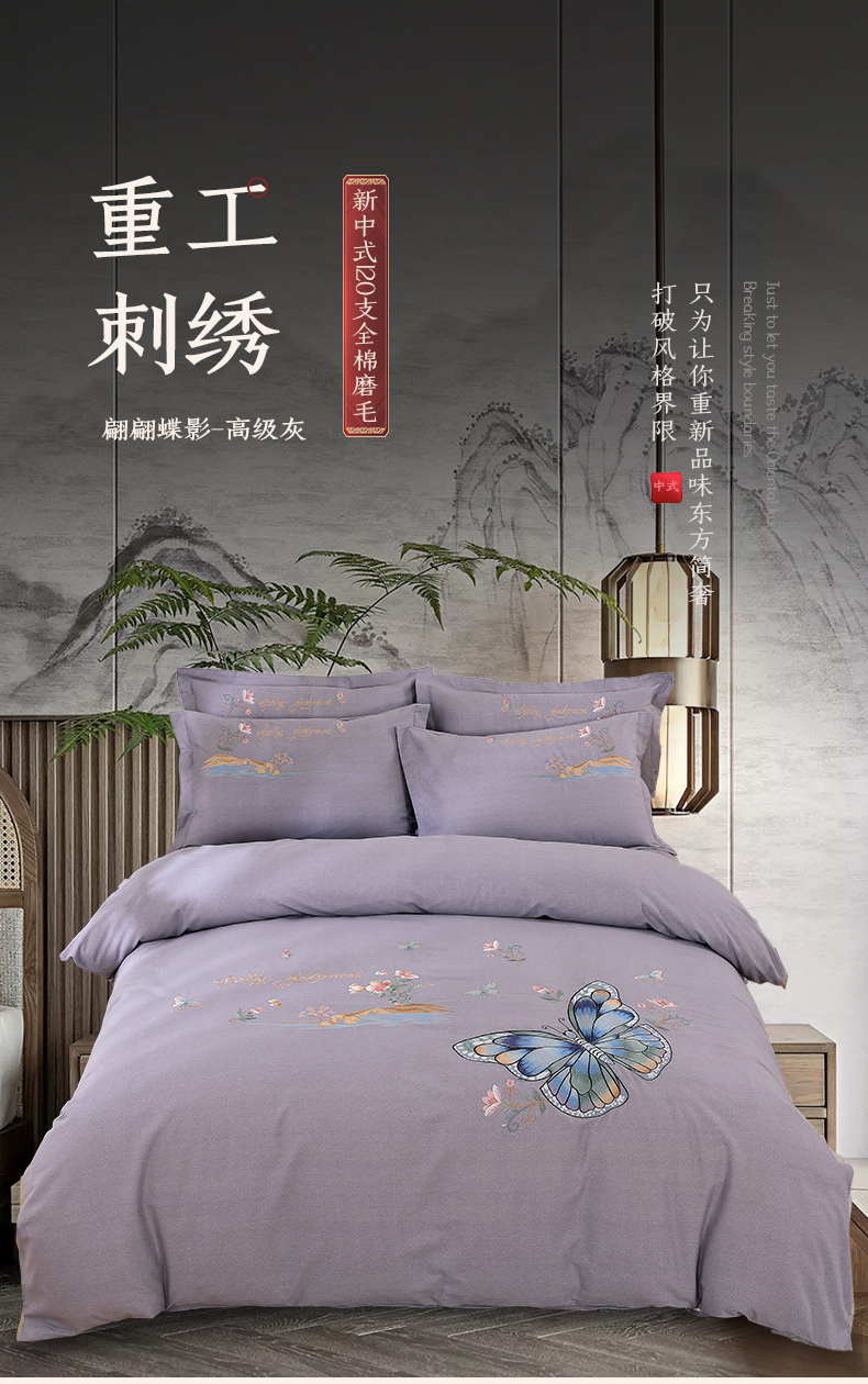 商品名称:浩情国际婚庆供货中心 2026新款秋冬60S高端全棉刺绣磨毛系列 翩翩蝶影-高级灰