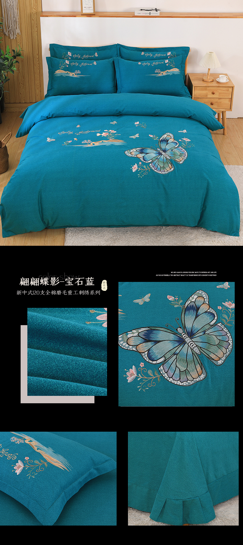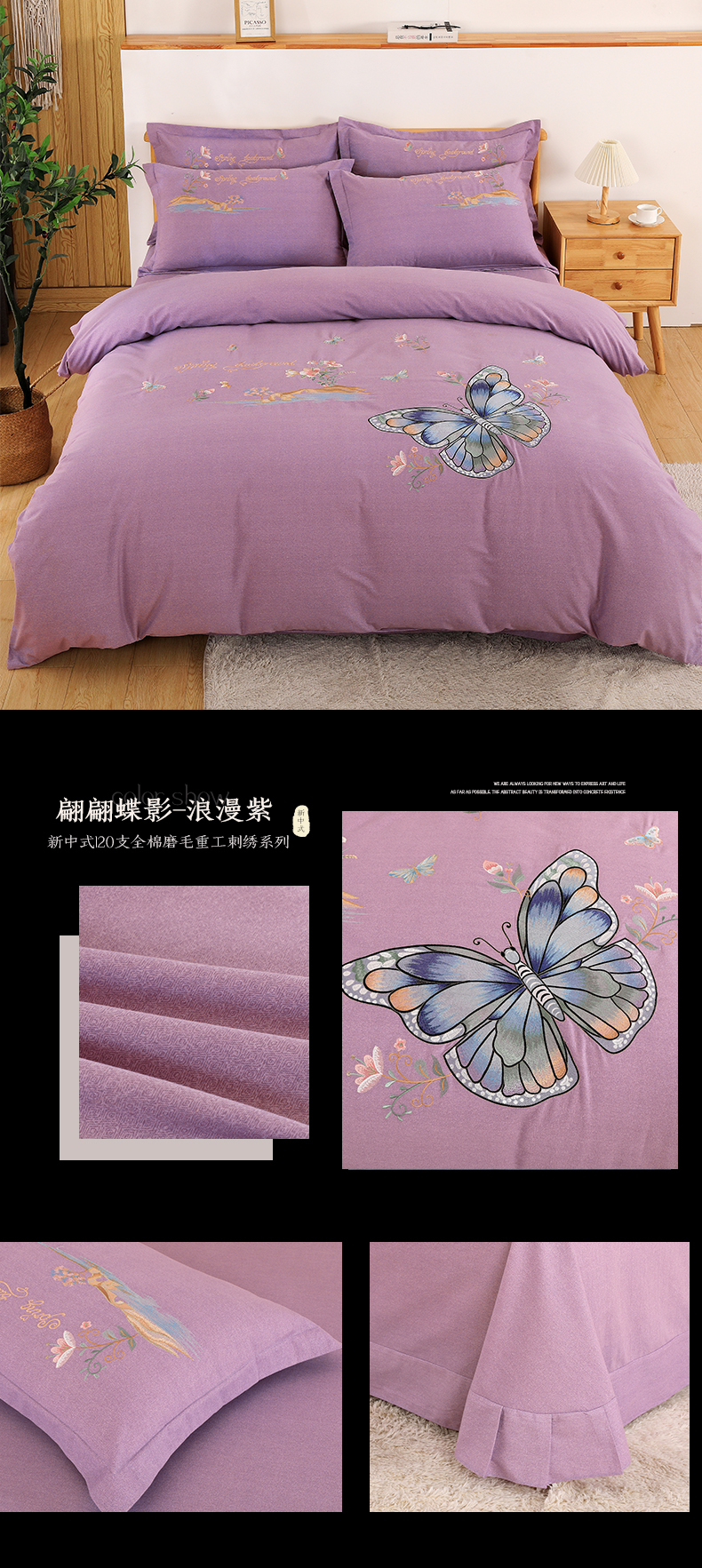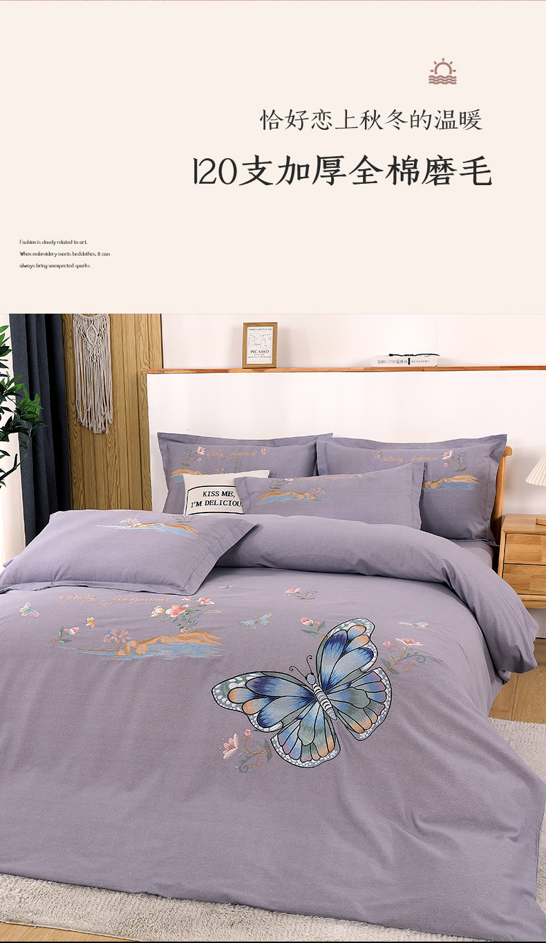 商品名称:浩情国际婚庆供货中心 2026新款秋冬60S高端全棉刺绣磨毛系列 翩翩蝶影-高级灰