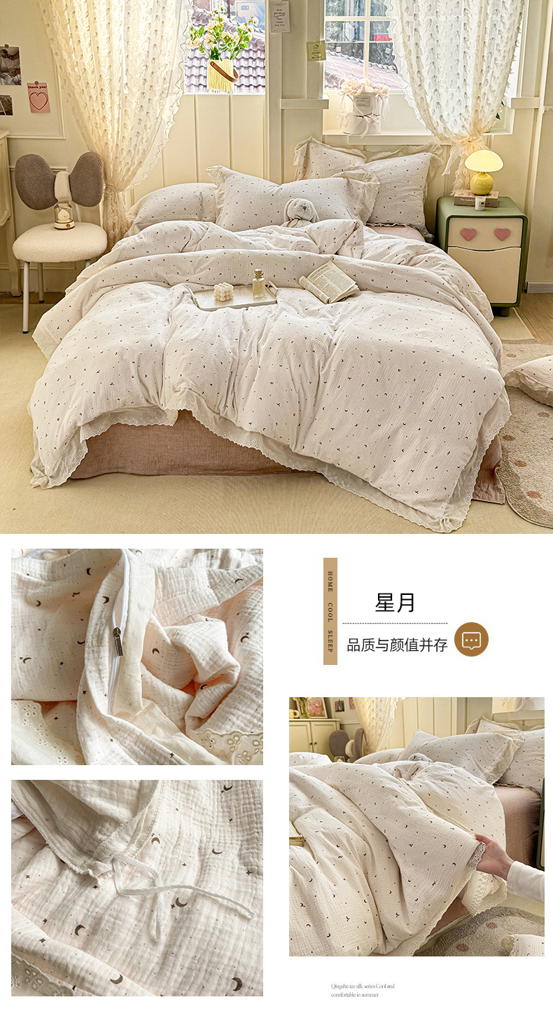 当前位置: 91家纺网 > 商品网购 > 床品套件 > 四件套 > 双层纱四件套 > 咏绒家纺工厂店 2025新款全棉双层皱皱沙印花花边款四件套 星月