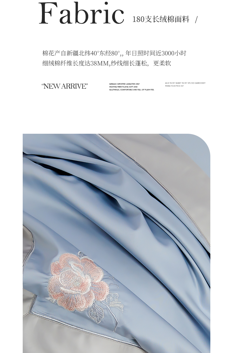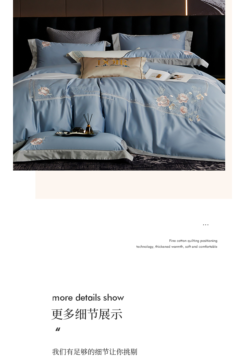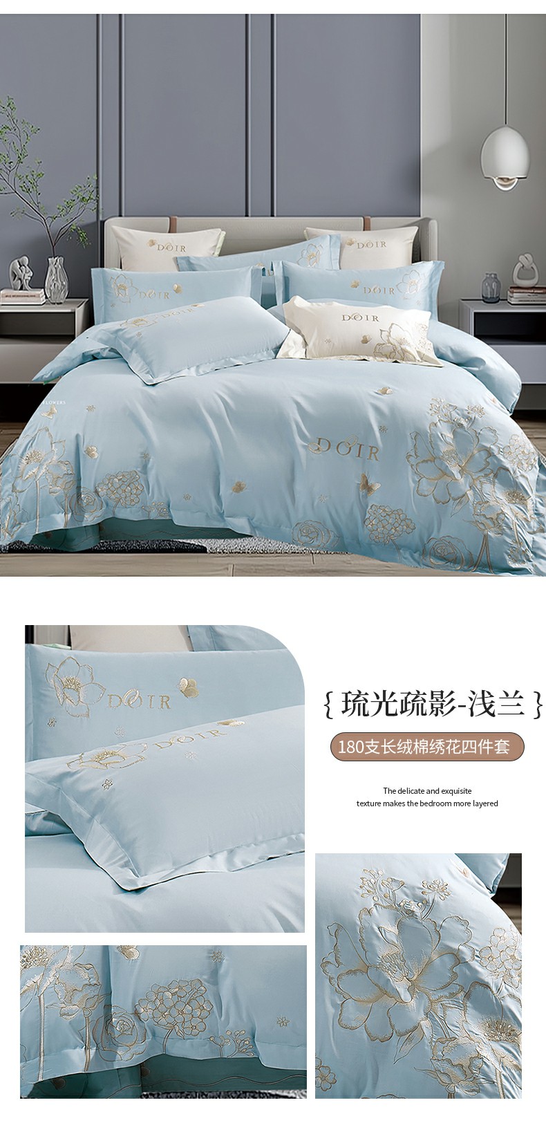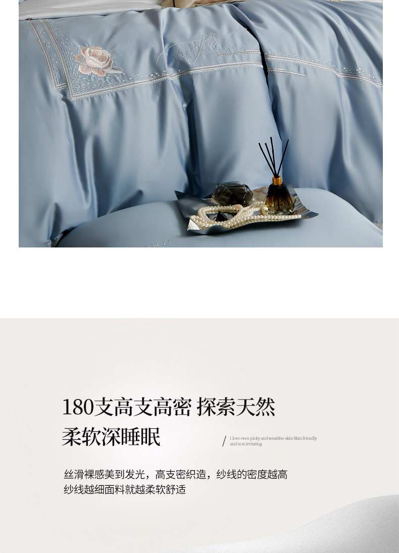 商品名称:浩情国际婚庆供货中心 2026新款180支长绒棉重工刺绣四件套 玛格利特-天空兰