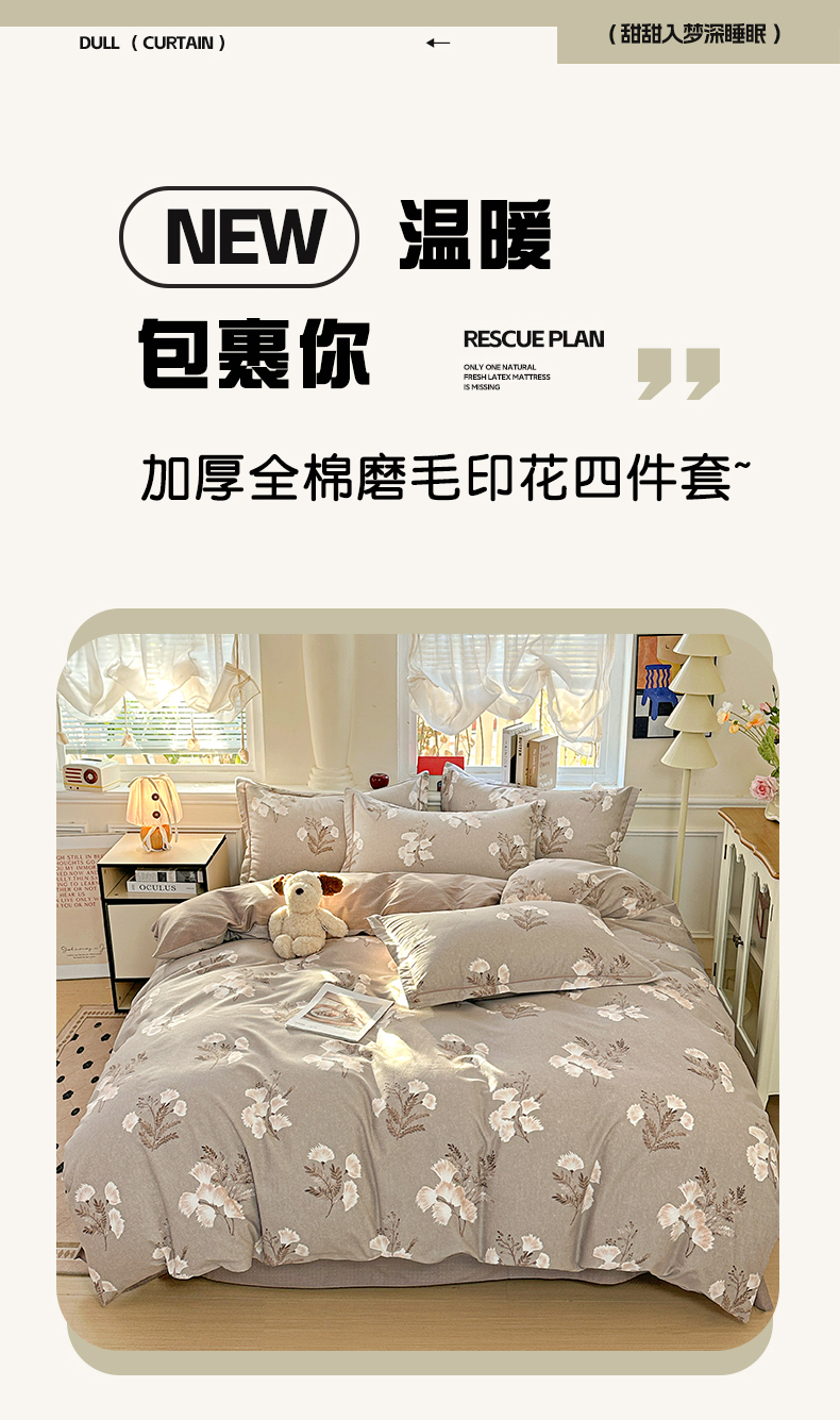 商品名称:曲之慕 2026新款全棉纯棉加厚喷气磨毛印花四件套 暖漾