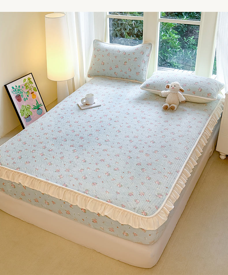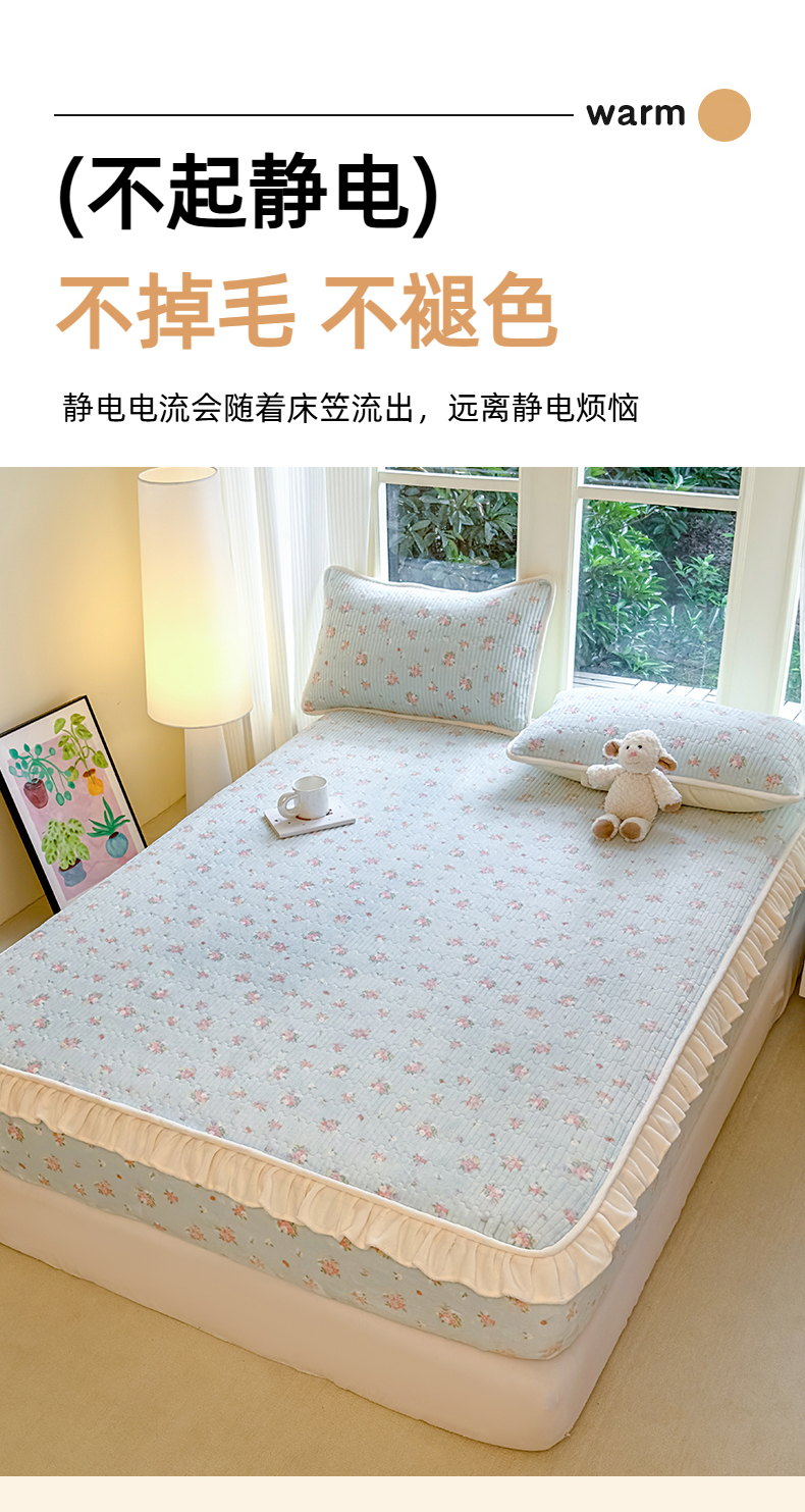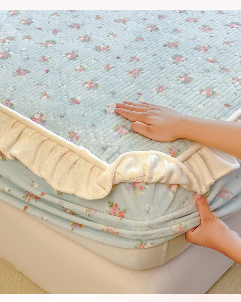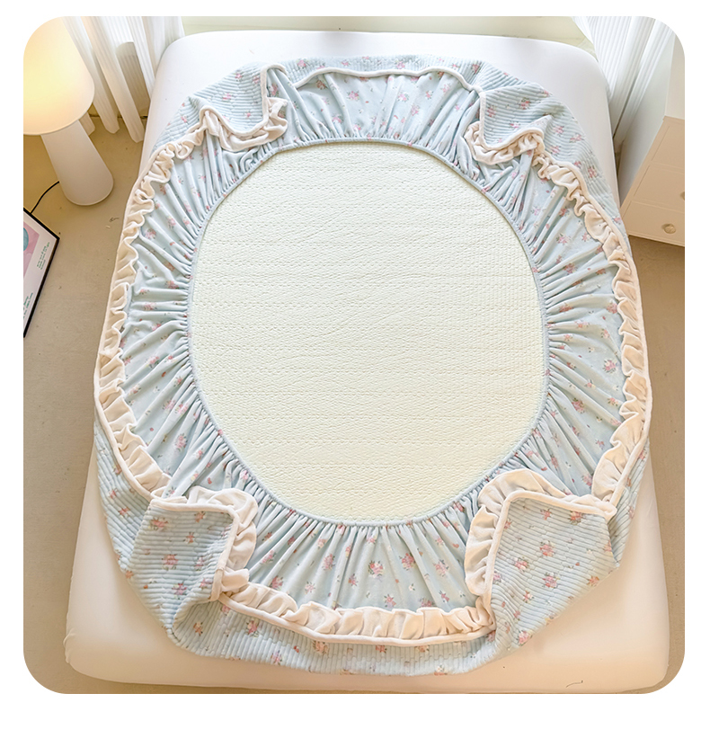 • 91家纺网 家纺一手货源 找家纺 欣宜家纺 2025秋冬新款韩版牛奶绒床笠法式花边床罩床垫保护套 碎花绿